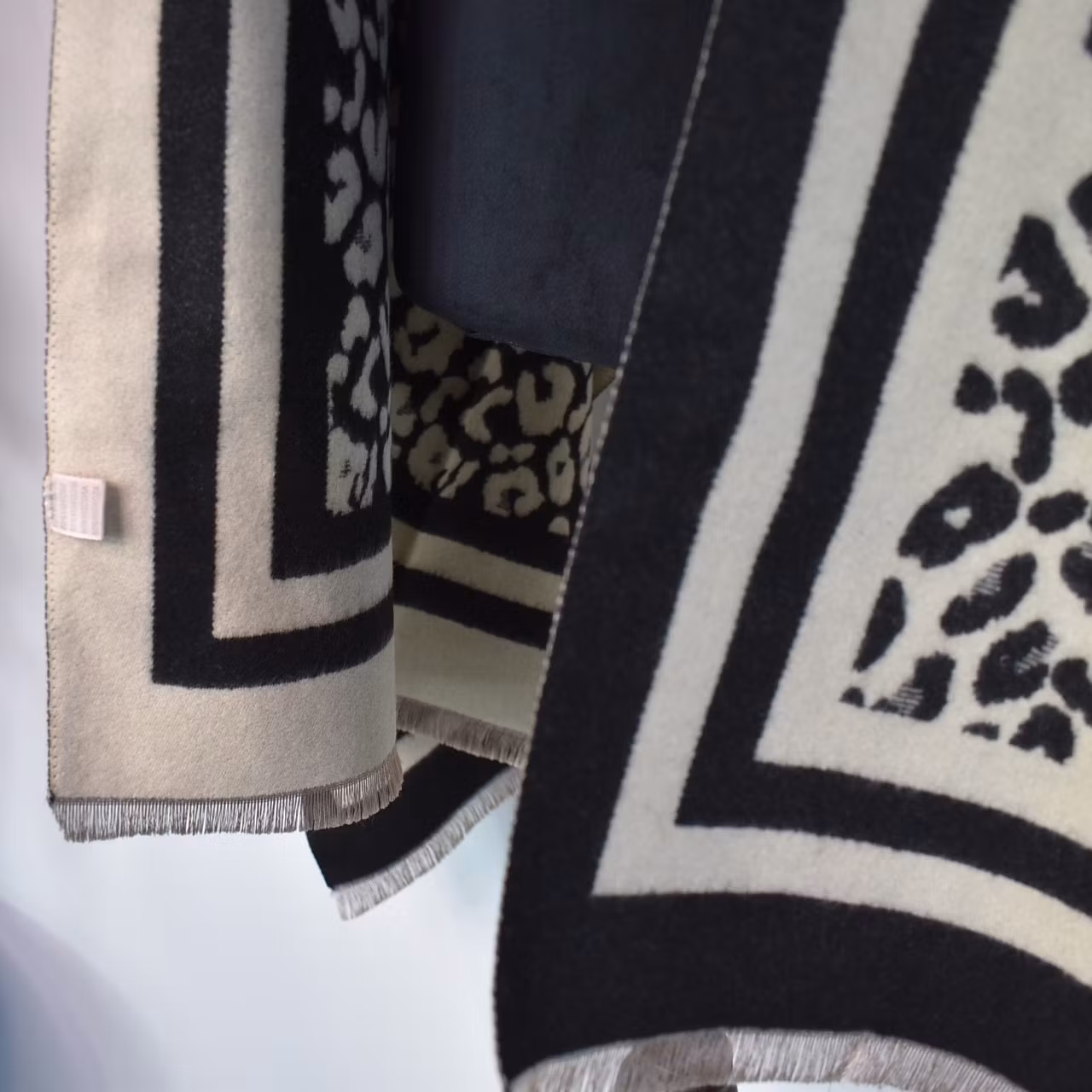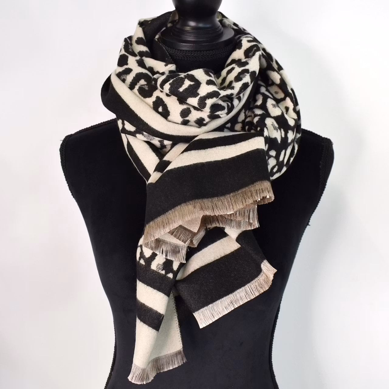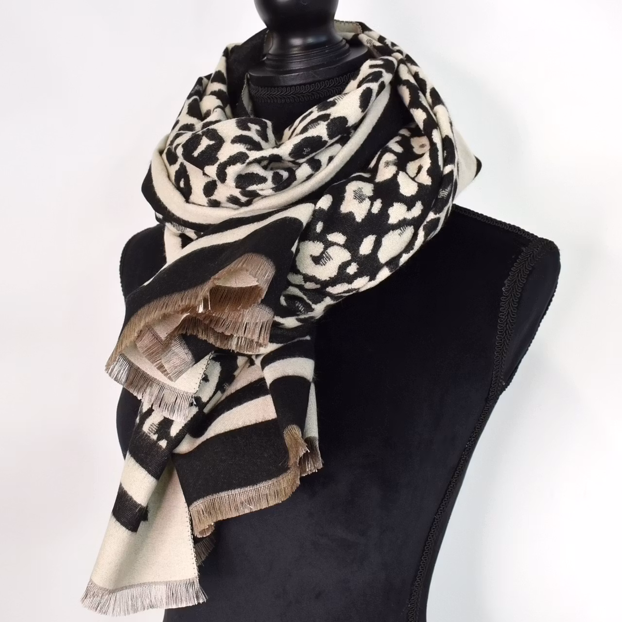 Det här är en mycket fin och härlig halsduk i supermjukt material och med läckert leopardmönster. Kortsidorna är fransiga. Se ungefärliga mått i beskrivningen.