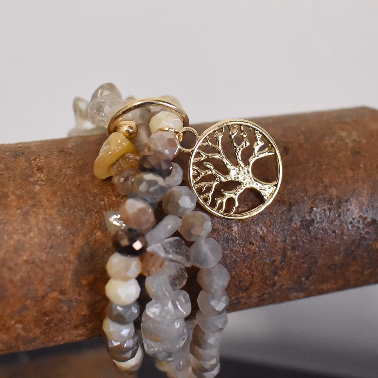 Det här är ett tjusigt armband med tre elastiskt band som har slipade glaspärlor i olika storlekar/former som skiftar lite i färgen. På ett av banden finns ett Livets träd-hänge i guld. Banden kan användas var för sig om man tar av metallringen som håller ihop dem.