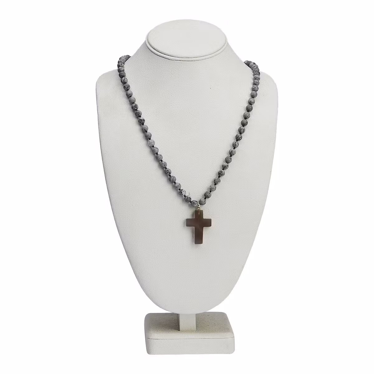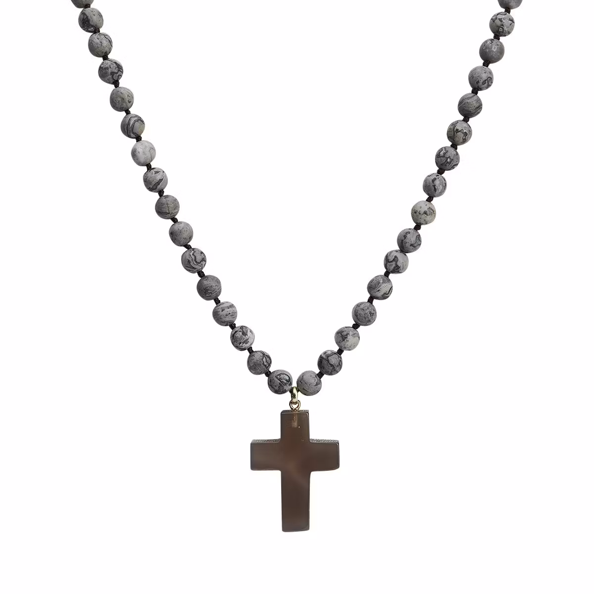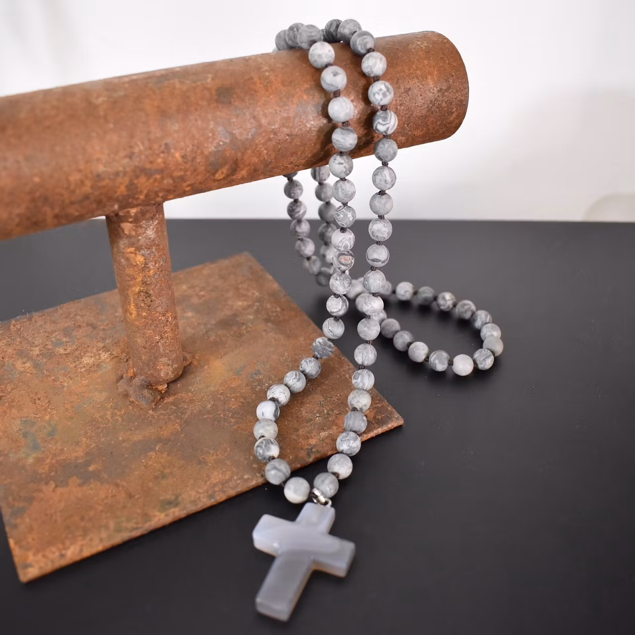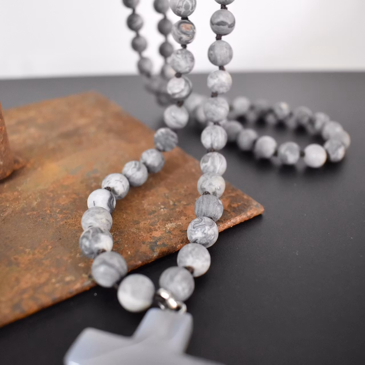 Det här är ett vackert långt halsband med mönstrade stenar i olika grå nyanser. Längst ner är där ett hänge i form av ett stenkors som är levande i sitt mönster och skiftar mellan mörkt och ljusgrått.