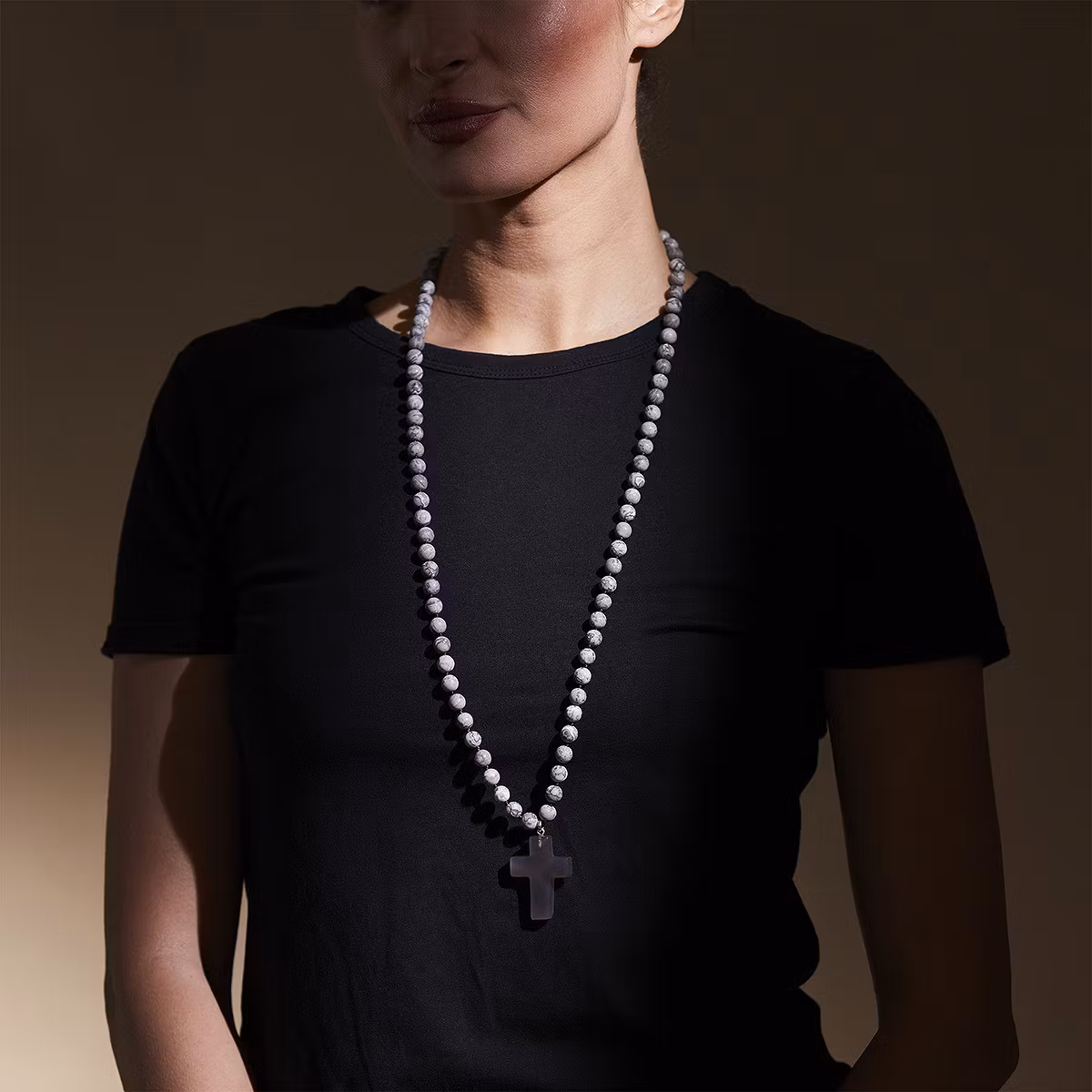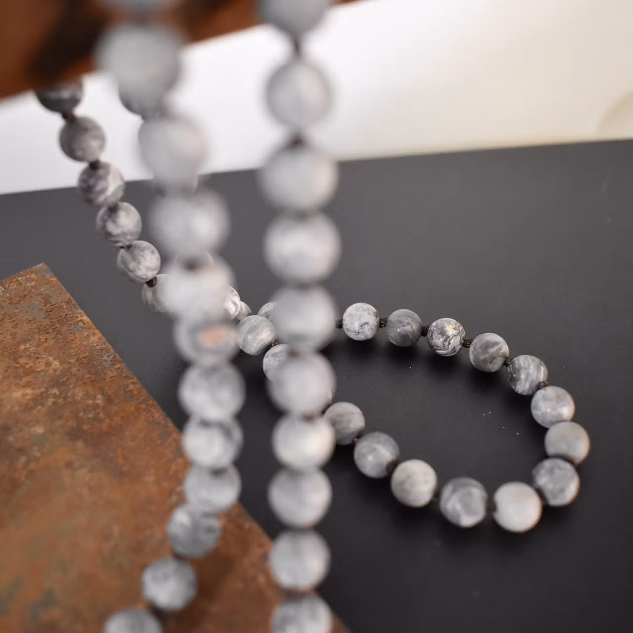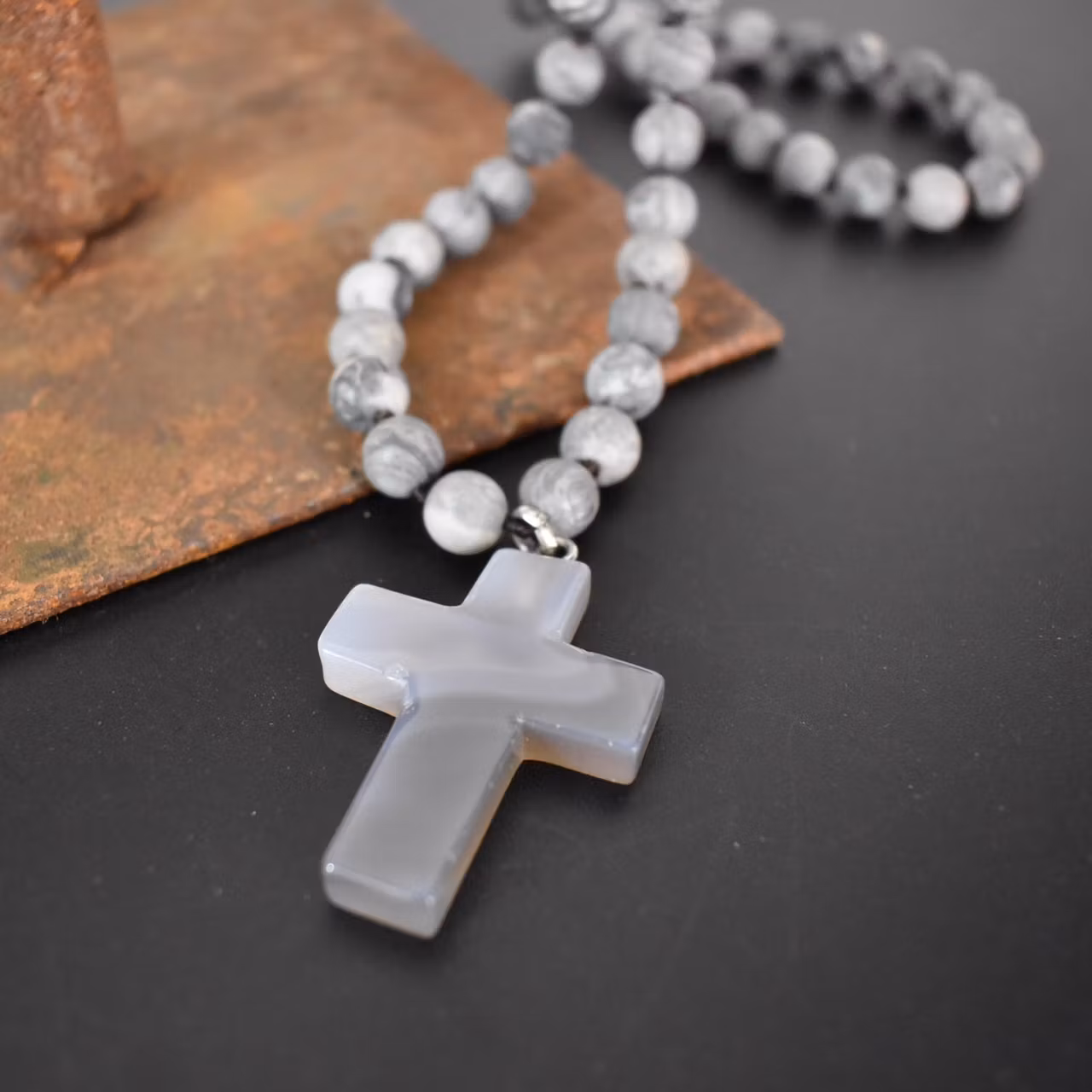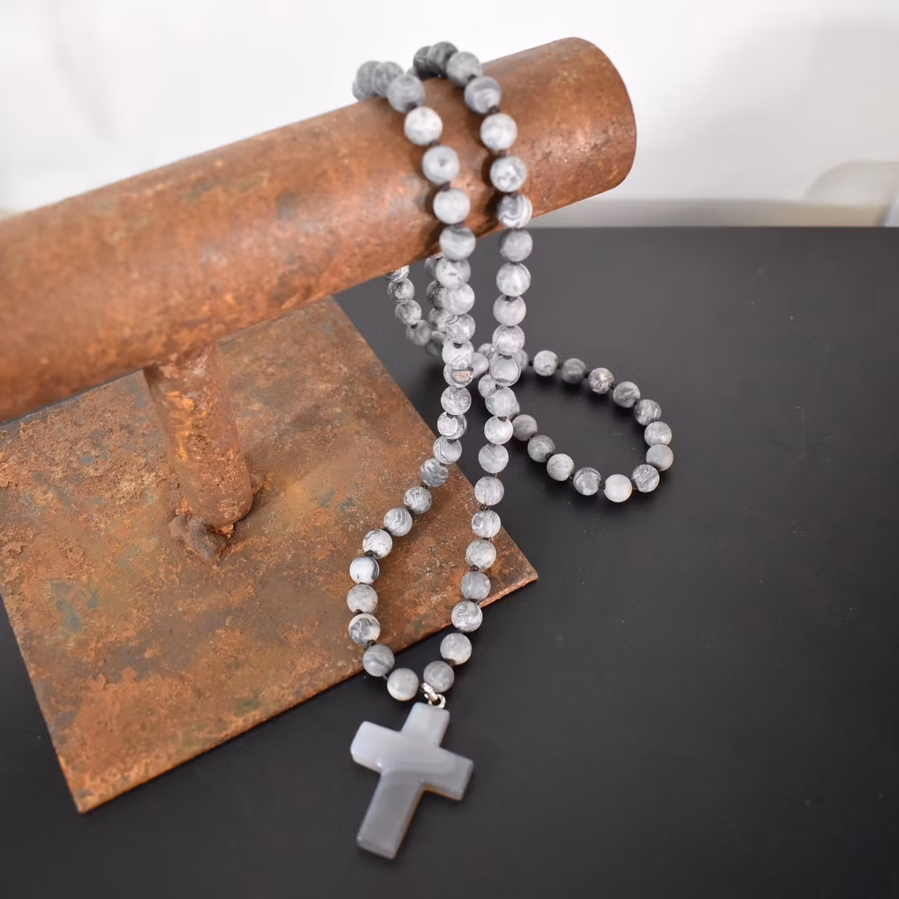 Det här är ett vackert långt halsband med mönstrade stenar i olika grå nyanser. Längst ner är där ett hänge i form av ett stenkors som är levande i sitt mönster och skiftar mellan mörkt och ljusgrått.