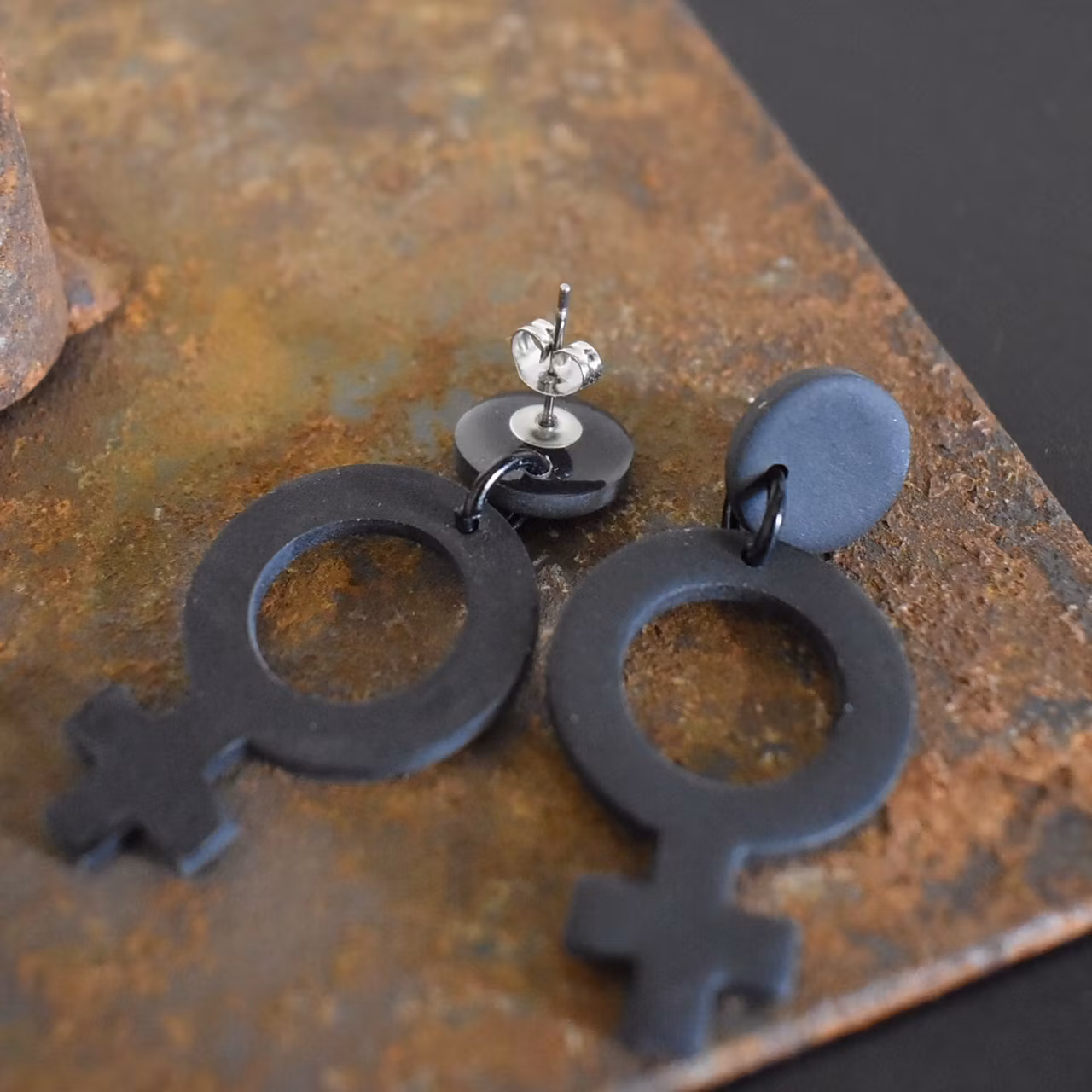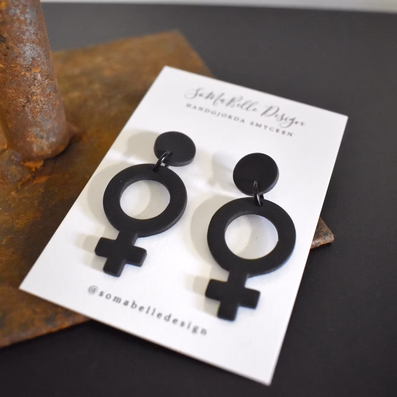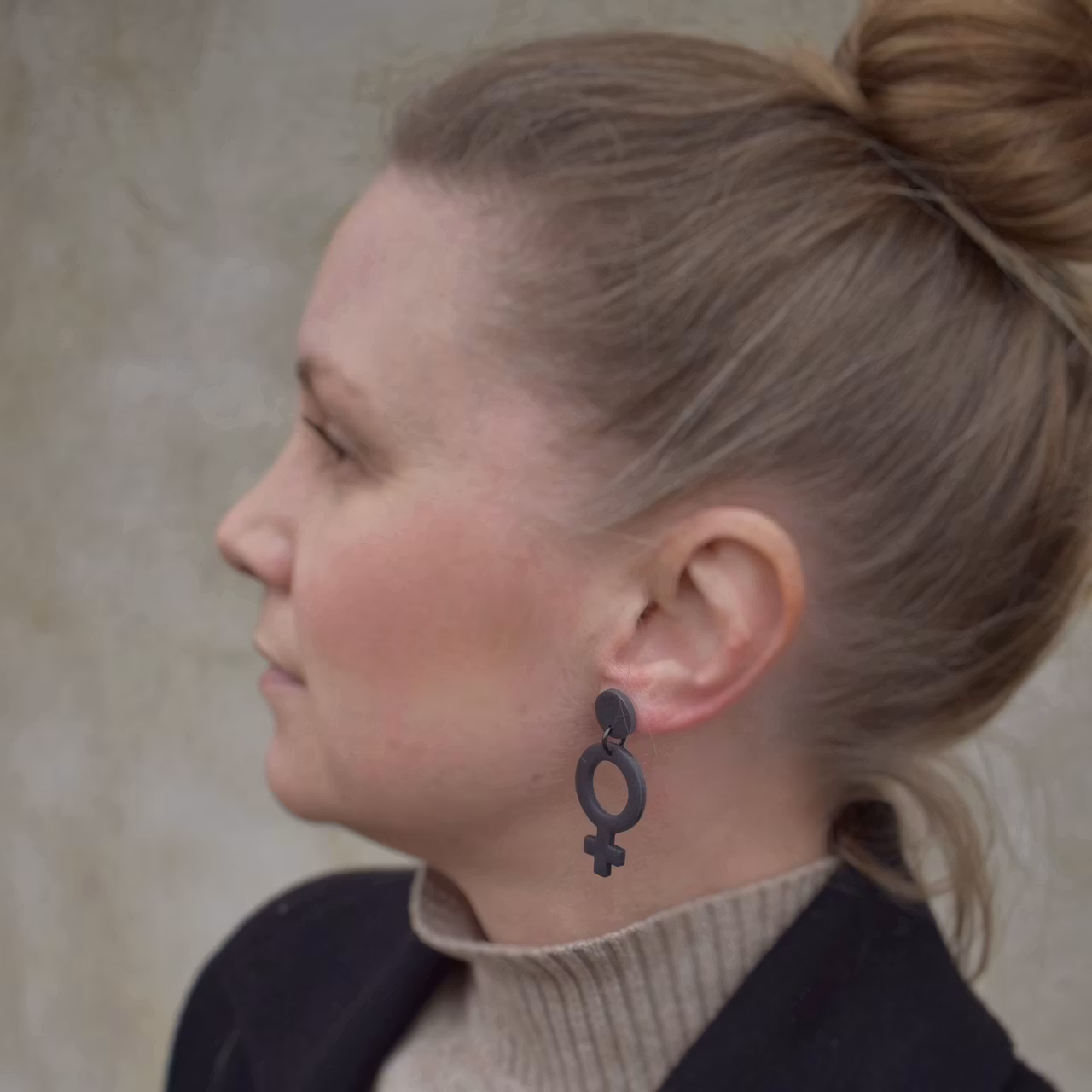 Det här är ett läckert statement-örhänge gjort i lättviktslera. Örhänget har en liten platta och ett kvinnosymbol-format hänge med snygg matt yta. Observera att dessa är handgjorda så det finns små storleks-skillnader mellan exemplaren.