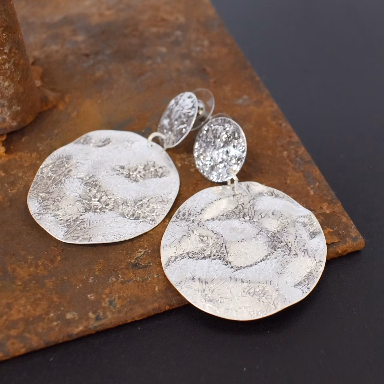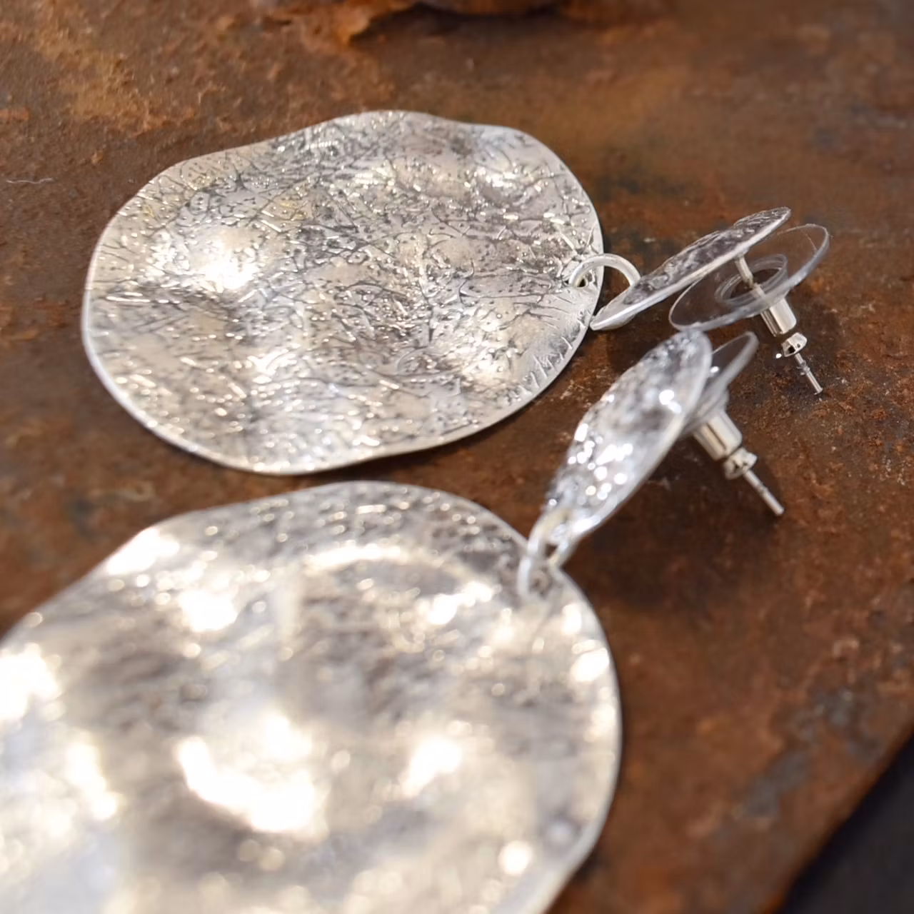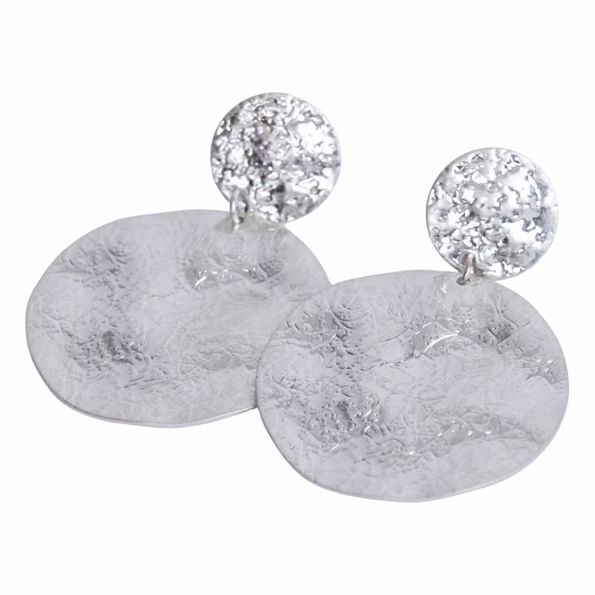 Det här är ett underbart iögonfallande örhänge med en tunn silverfärgad metallplatta med läckert hamrad/mönstrad yta. Örhänget har väldigt låg vikt och tynger inte.