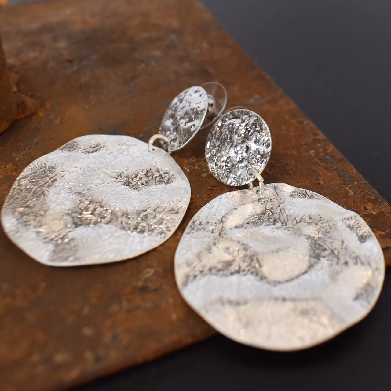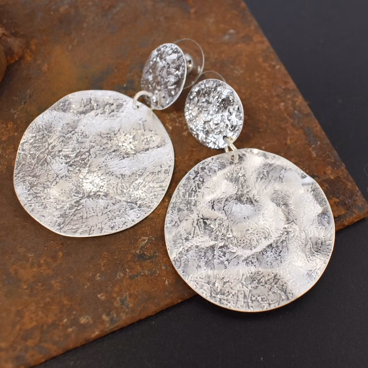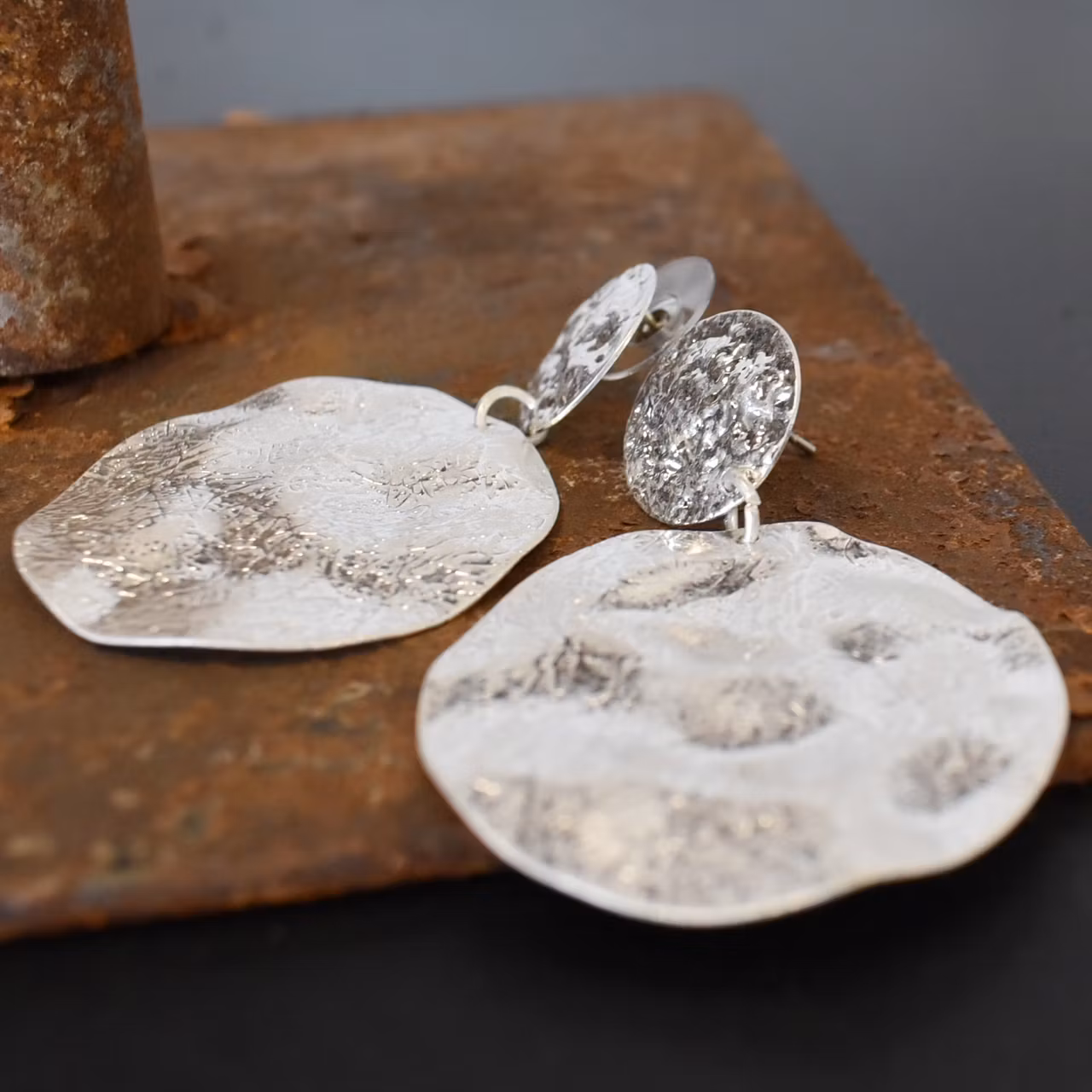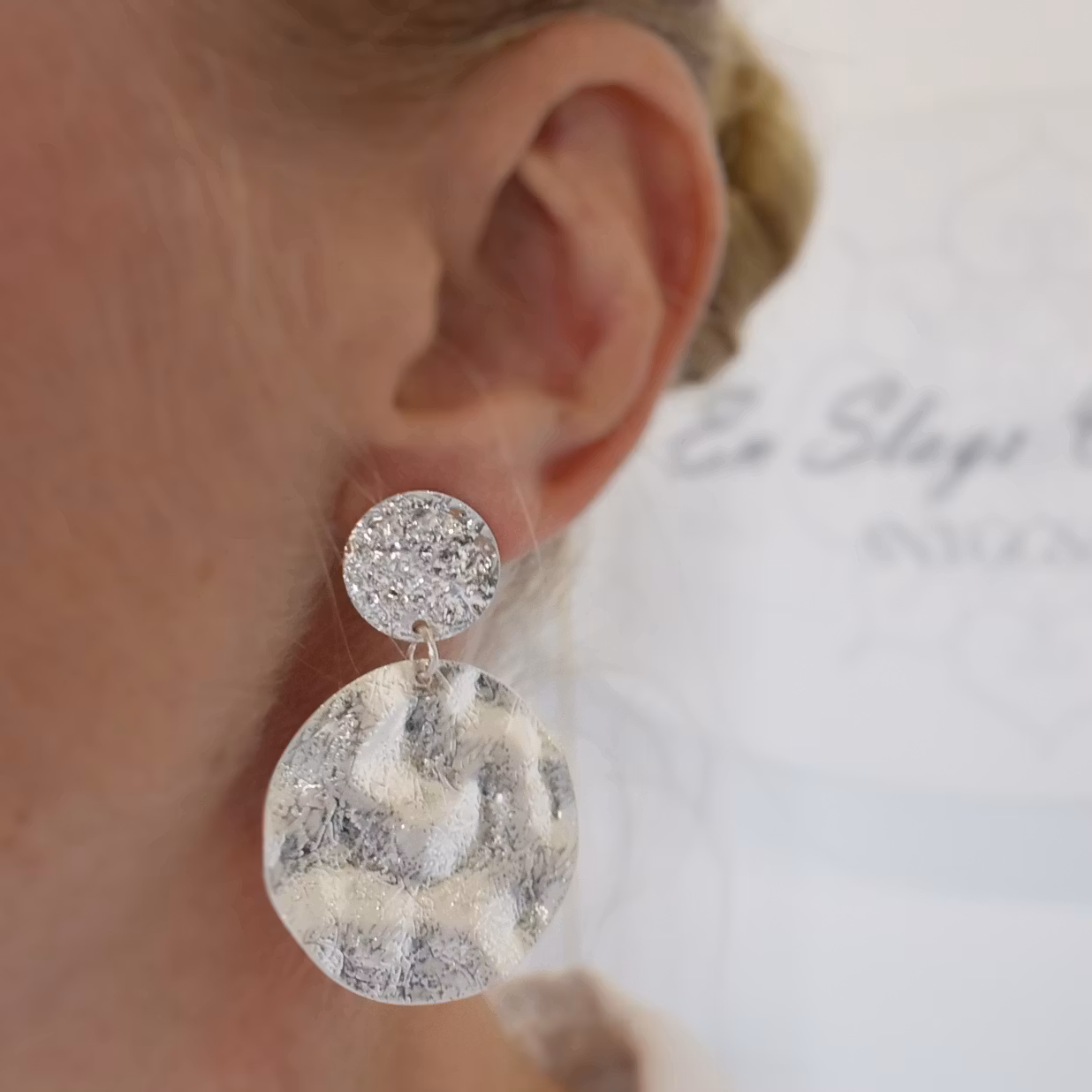 Det här är ett underbart iögonfallande örhänge med en tunn silverfärgad metallplatta med läckert hamrad/mönstrad yta. Örhänget har väldigt låg vikt och tynger inte.