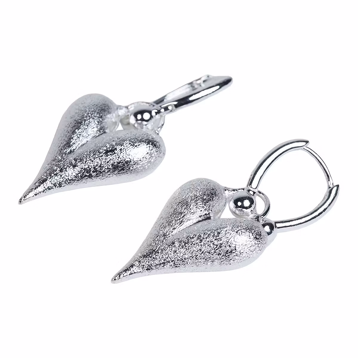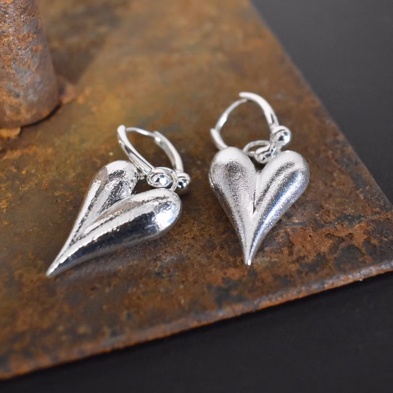 Det här är ett stort örhänge i två delar - ett spänne som enkelt knäpps av och på samt ett stort hängande hjärta med något oregelbunden yta. Spännet som sitter i örat kan man använda för sig själv då hjärtat går att plocka av.