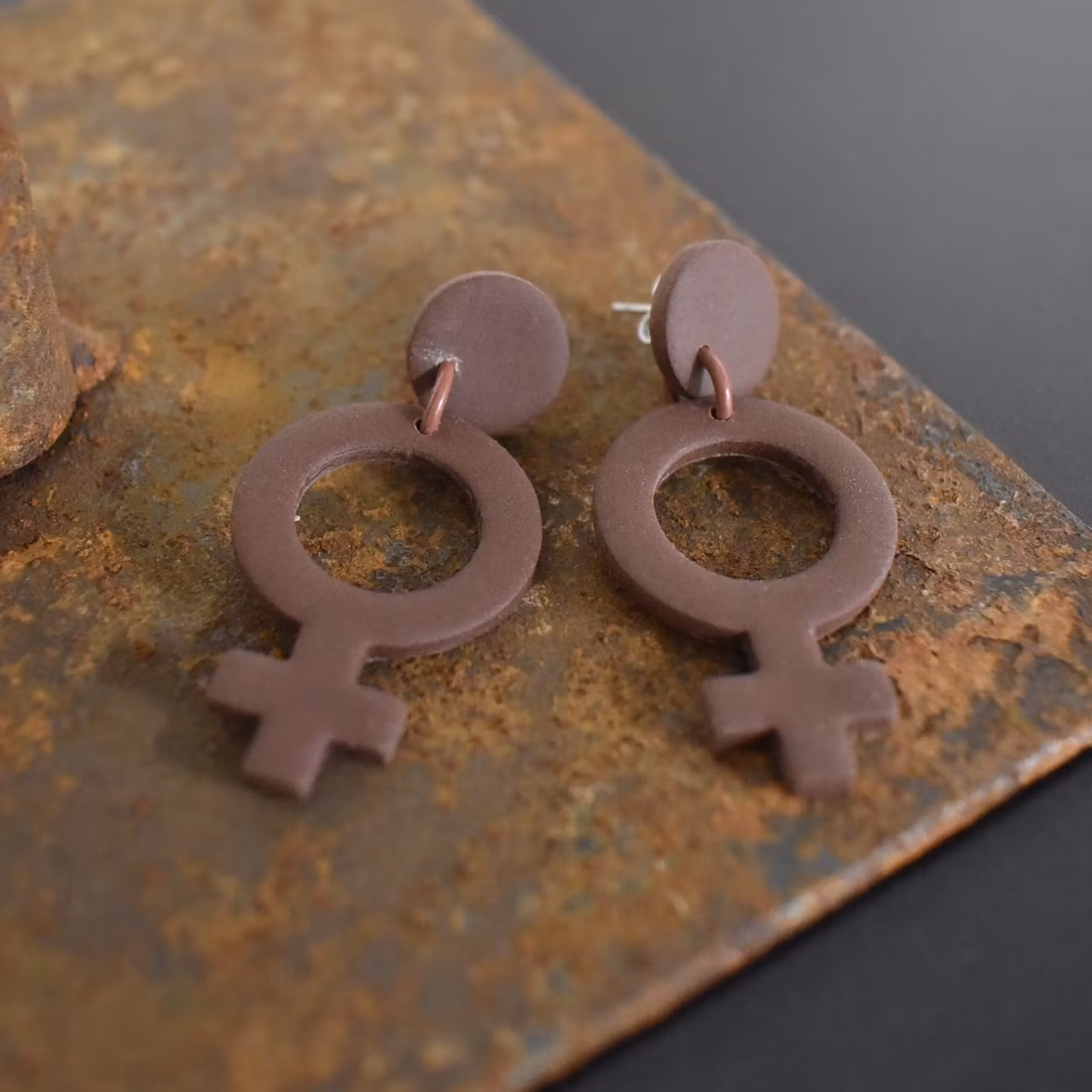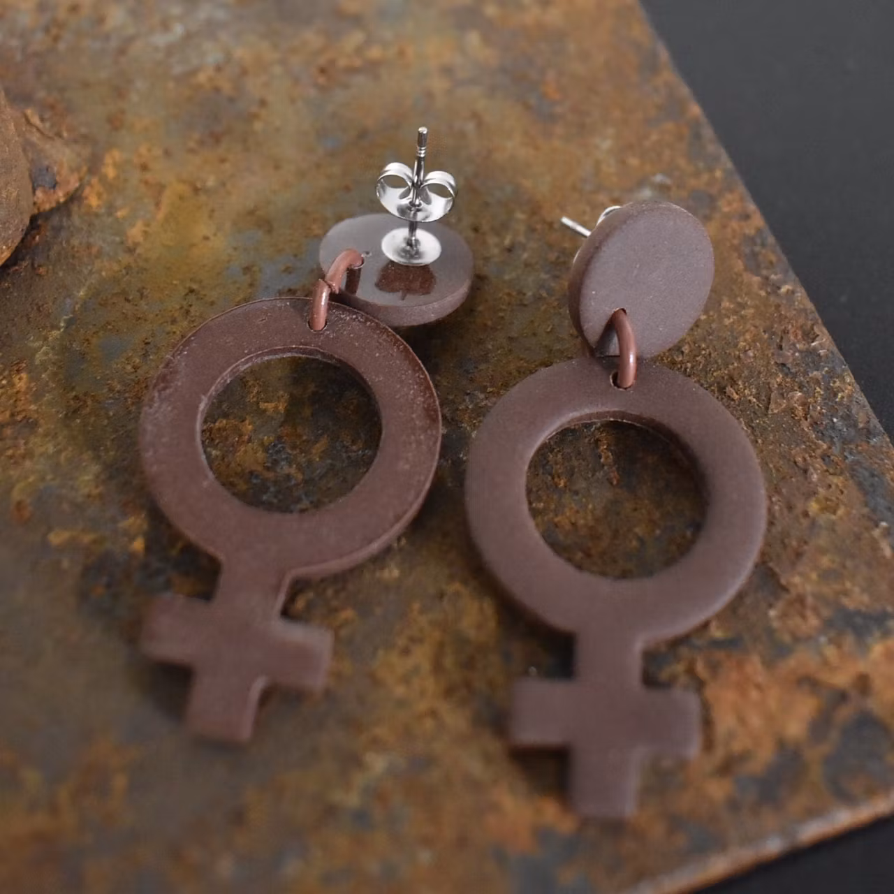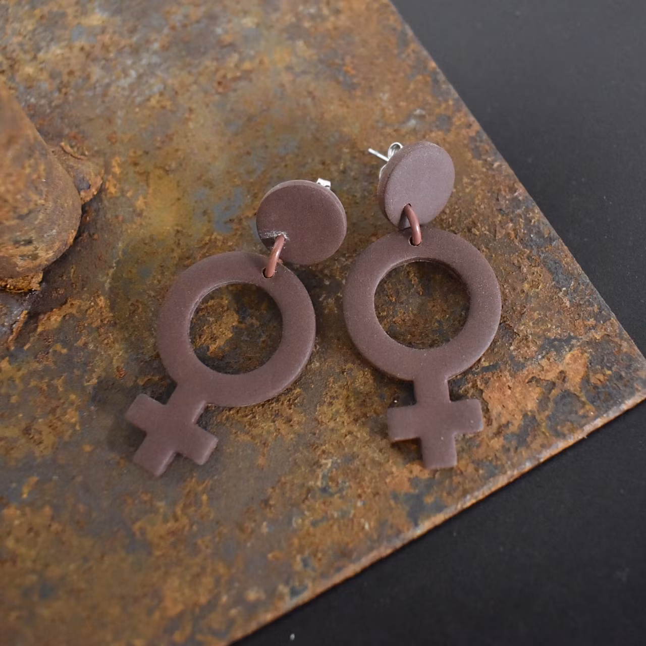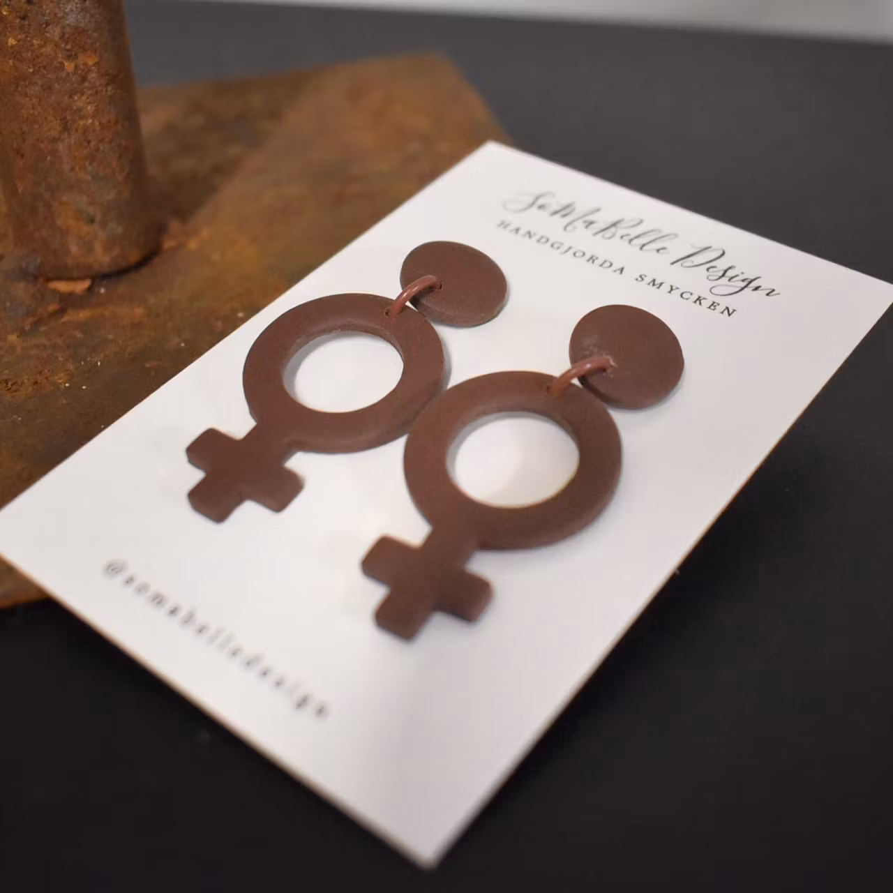Det här är ett läckert statement-örhänge gjort i lättviktslera. Örhänget har en liten platta och ett kvinnosymbol-format hänge med snygg matt yta. Observera att dessa är handgjorda så det finns små storleks-skillnader mellan exemplaren.
