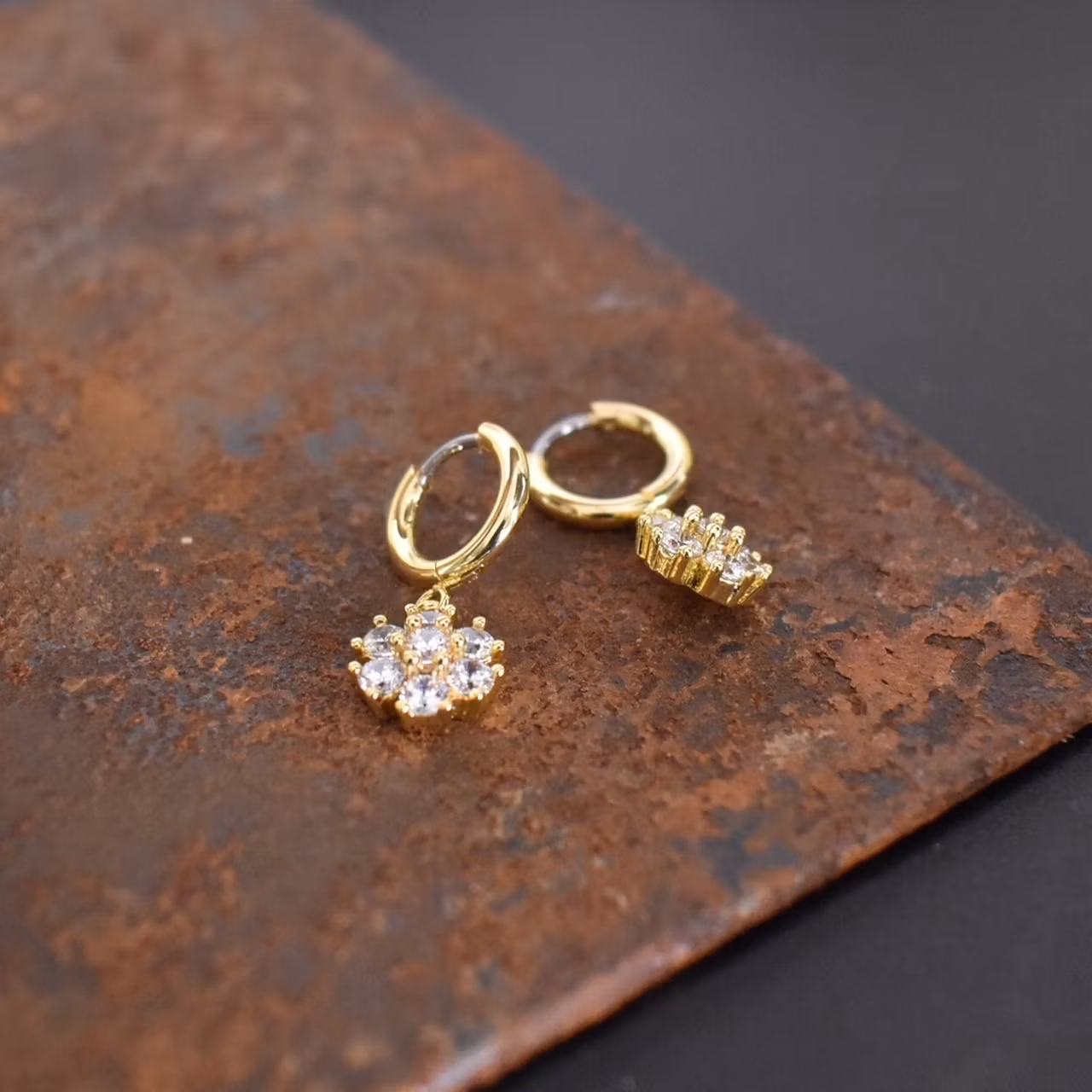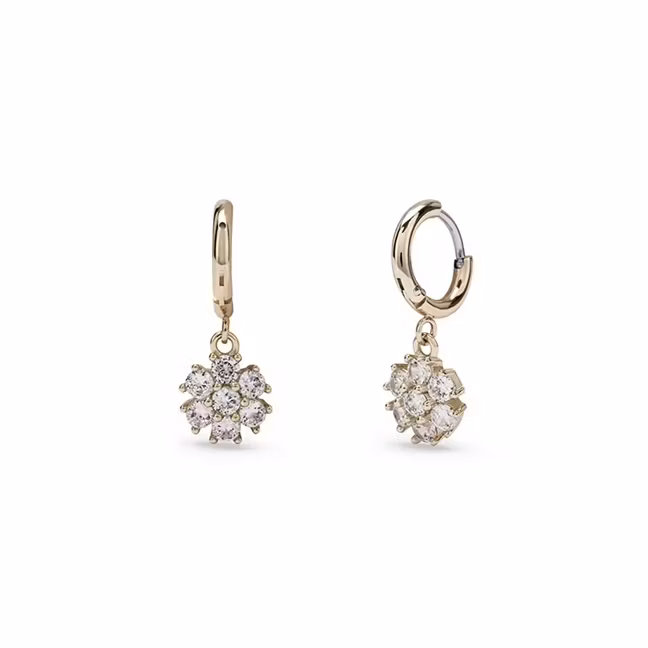 Det här är ett vackert örhänge i form av en liten ring med ett blomformat hänge med glittrande sten. Knäpps enkelt på och av med stift. Veramés smycken är utformade för alla smaker och stilar, de kan bäras individuellt eller kombineras med varandra, och samtidigt slippa oroa sig för eventuell allergi.