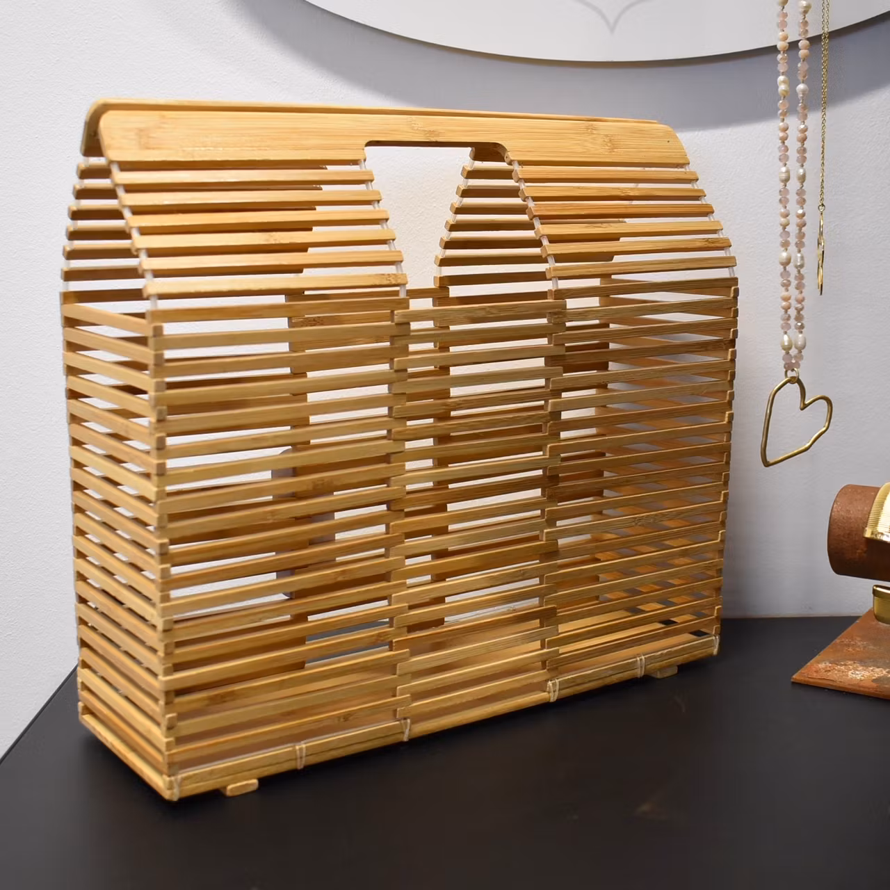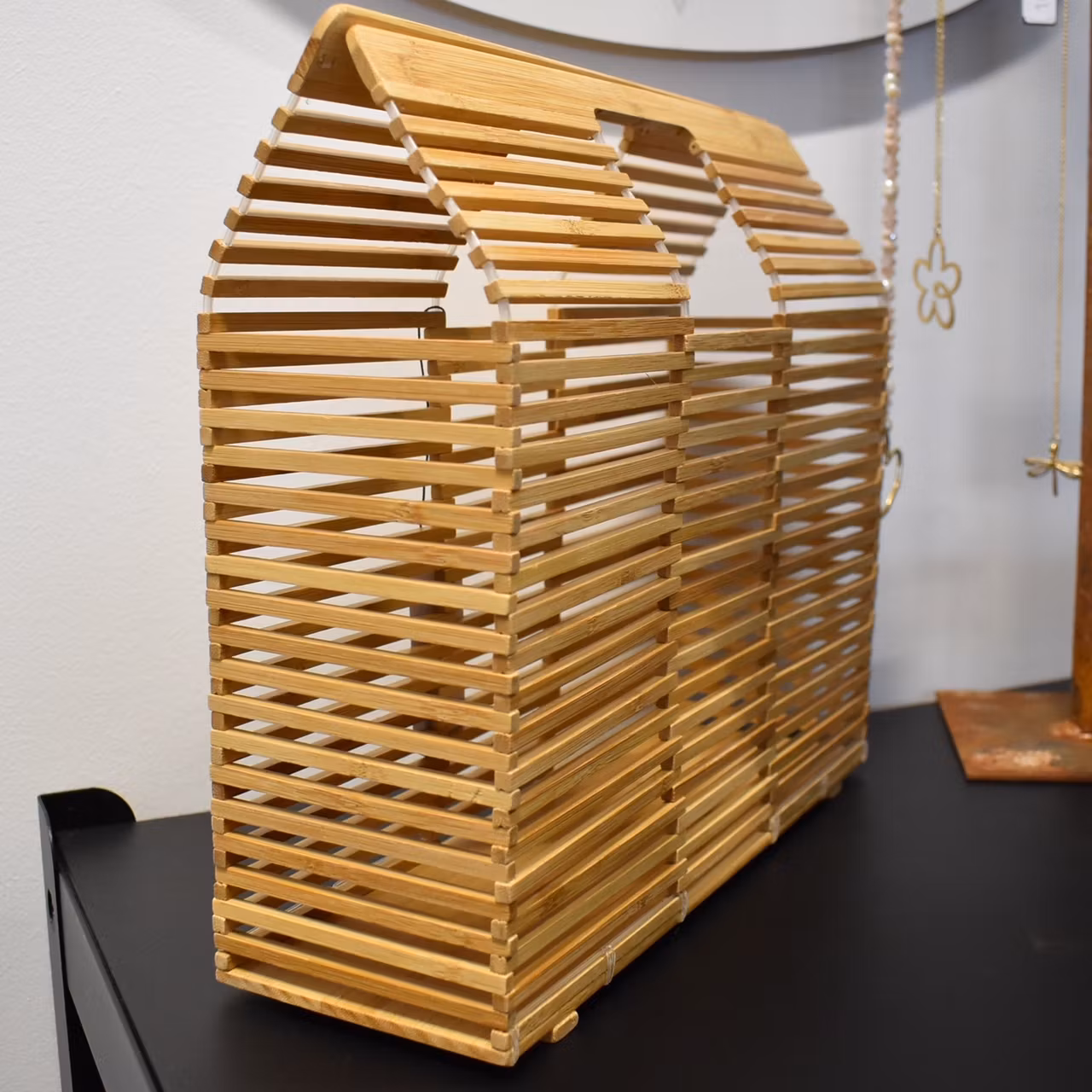 Det här är en läcker och lite annorlunda handväska som är tillverkad av ihopsatta i trä-pinnar. Se ungefärliga mått längre ner i beskrivningen.