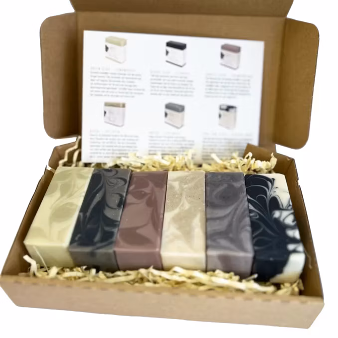 Boxens innehåll: Green Clay Lemongrass, Black Clay Licorice, Purple Clay Frankinsence, Rasul Lava Clay Vetiver, Indigo Lavender och Coal & Clay Tea Tree Mint. Man får även med ett fint kort som beskriver varje tvål. Boxen är packad med lokalt producerad träull i Värmland.