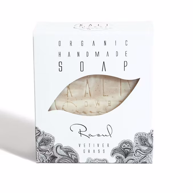 Det här är en vacker handgjord tvål som kan användas till hela kroppen - även som ansiktsrengöring och handtvål. Rasul-leran har detox-egenskaper, den är djuprengörande och milt exfolierande. Trots absorberande och djuprengörande egenskaper, fungerar rasul fint även för torr och känslig hud. Tvålen har en härlig, lite dov doft av vetivergräs, som kan påminna om sandelträ. Tvålen är överfettad med 5% vilket betyder att den inte är uttorkande utan återfuktar huden.