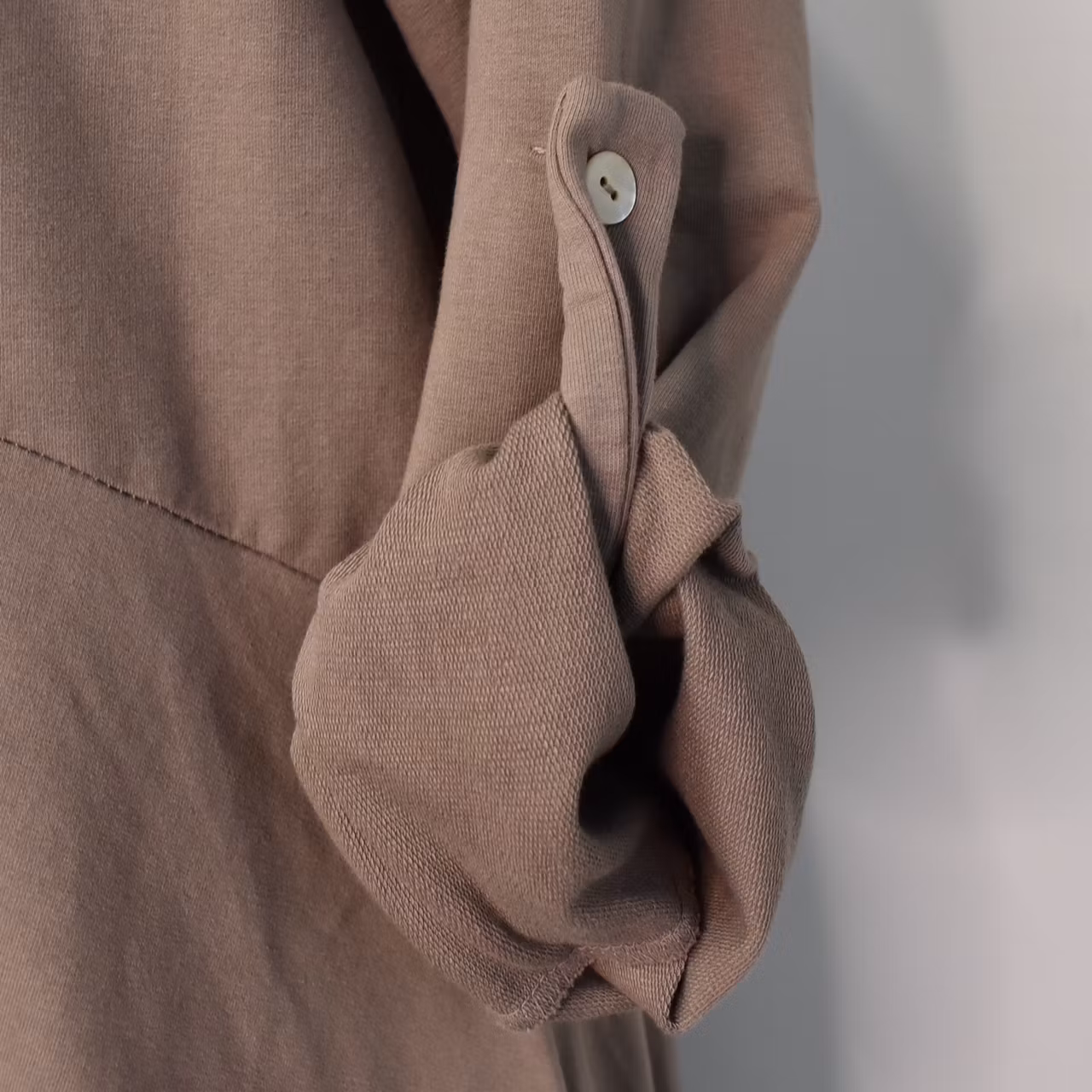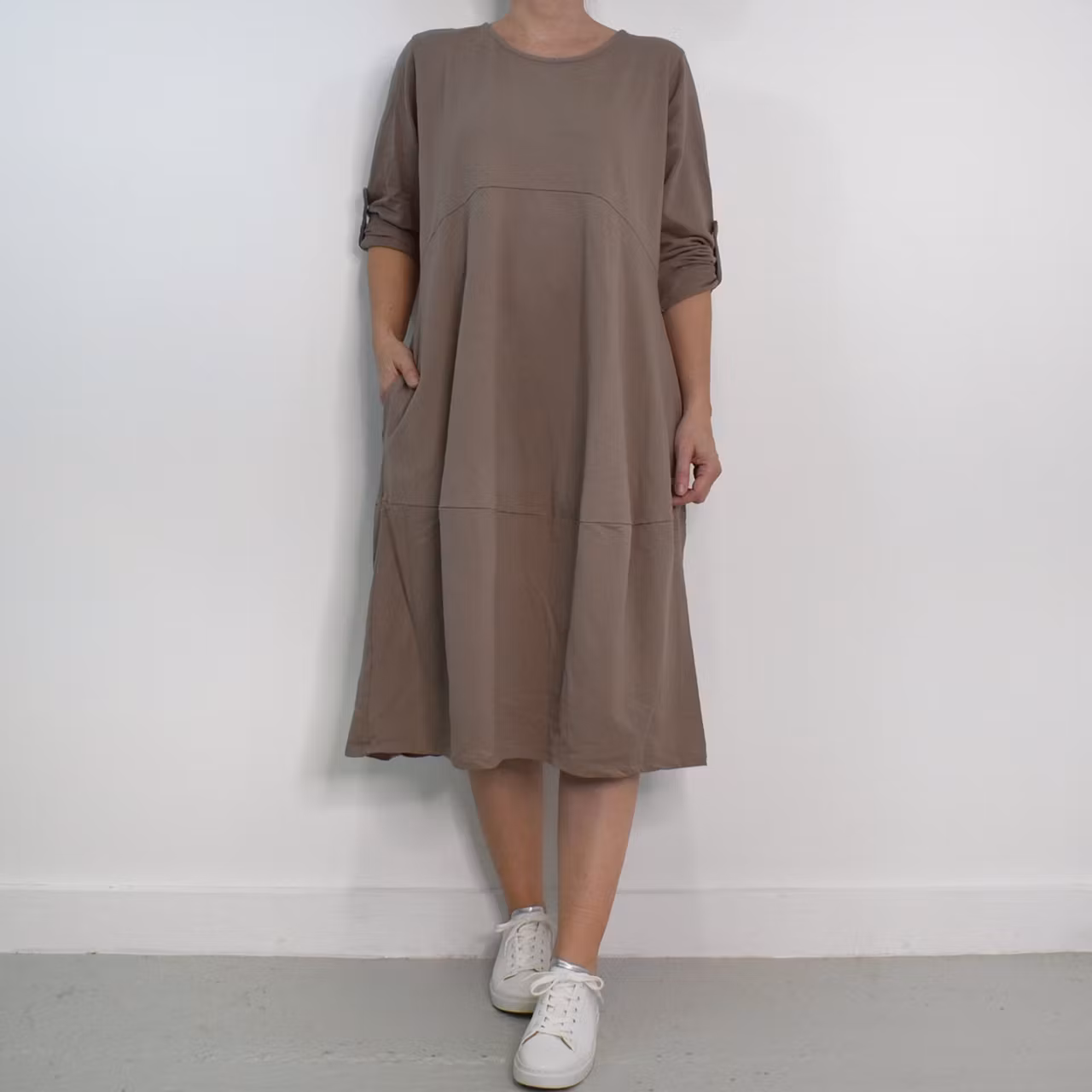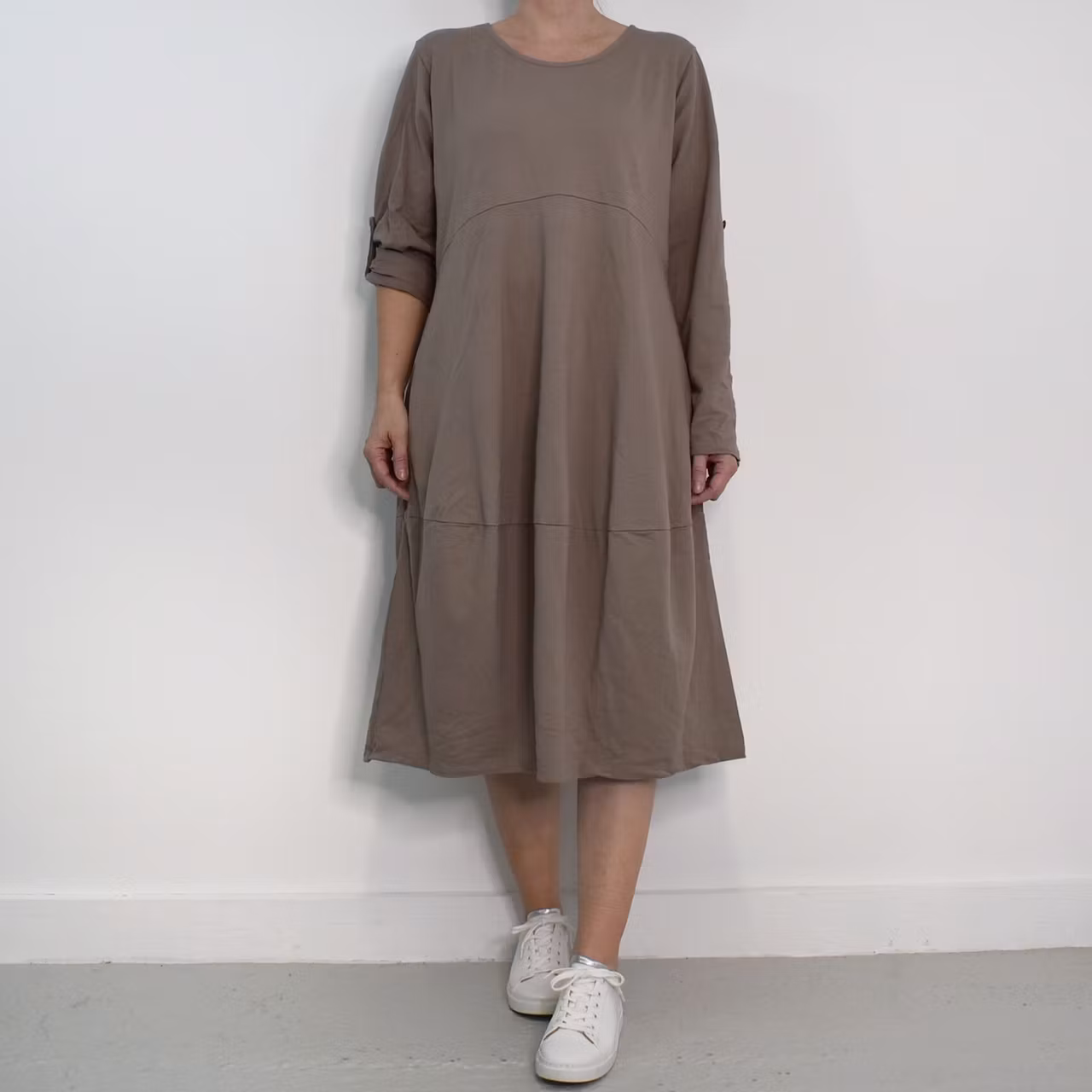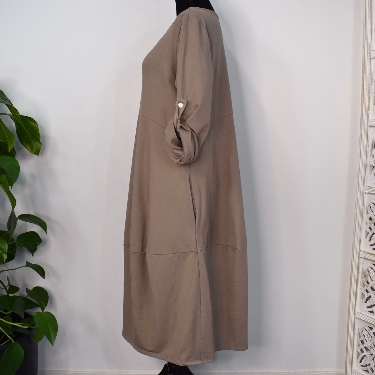Det här är en fin och skön medellång klänning i tunt, mjukt sweatshirt-tyg. Halsen är enkelt rundad och det finns gömda fickor i sidorna. Det är en härlig vidd i den något ballongformade nederdelen och passformen är avslappnad. Ärmen är lång men kan fästas upp. Det går en söm under bysten och på ryggen samt en nertill på klänningen. Materialet är töjbart men innehåller inte stretch. Modellen har en bröstvidd på cirka 88cm, är 163cm lång och bär storlek S/M.
