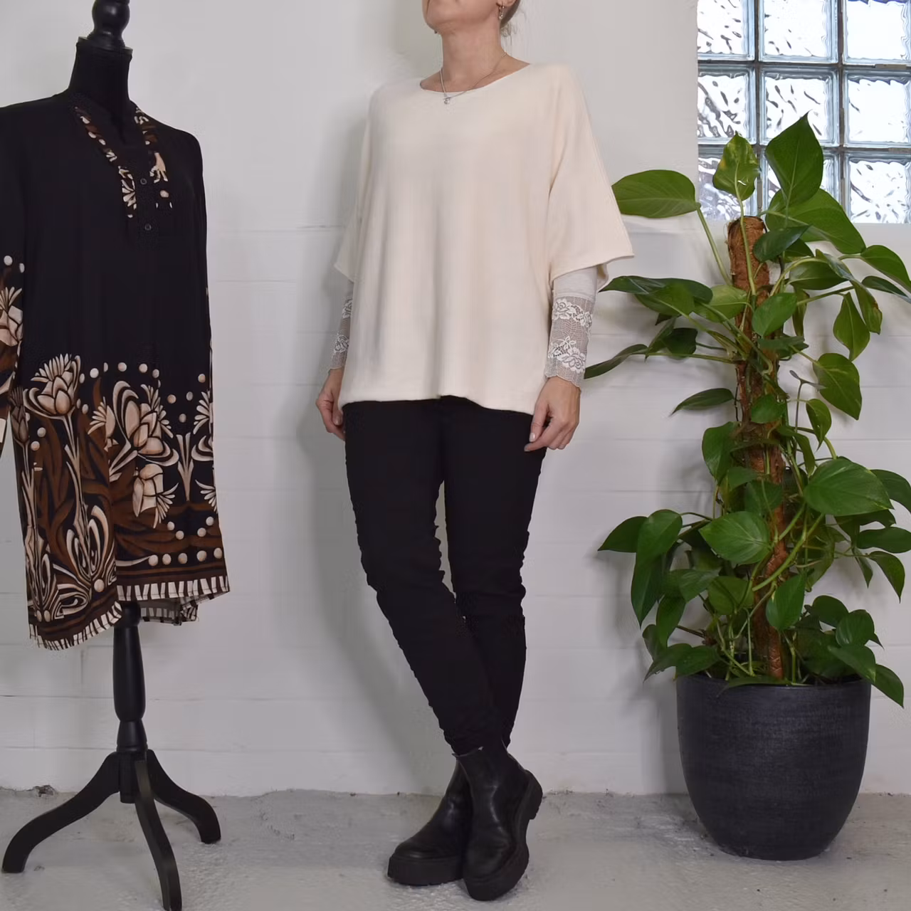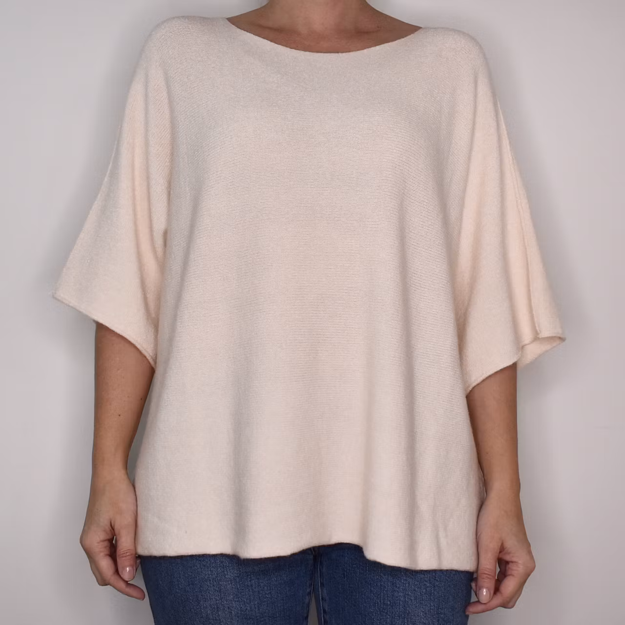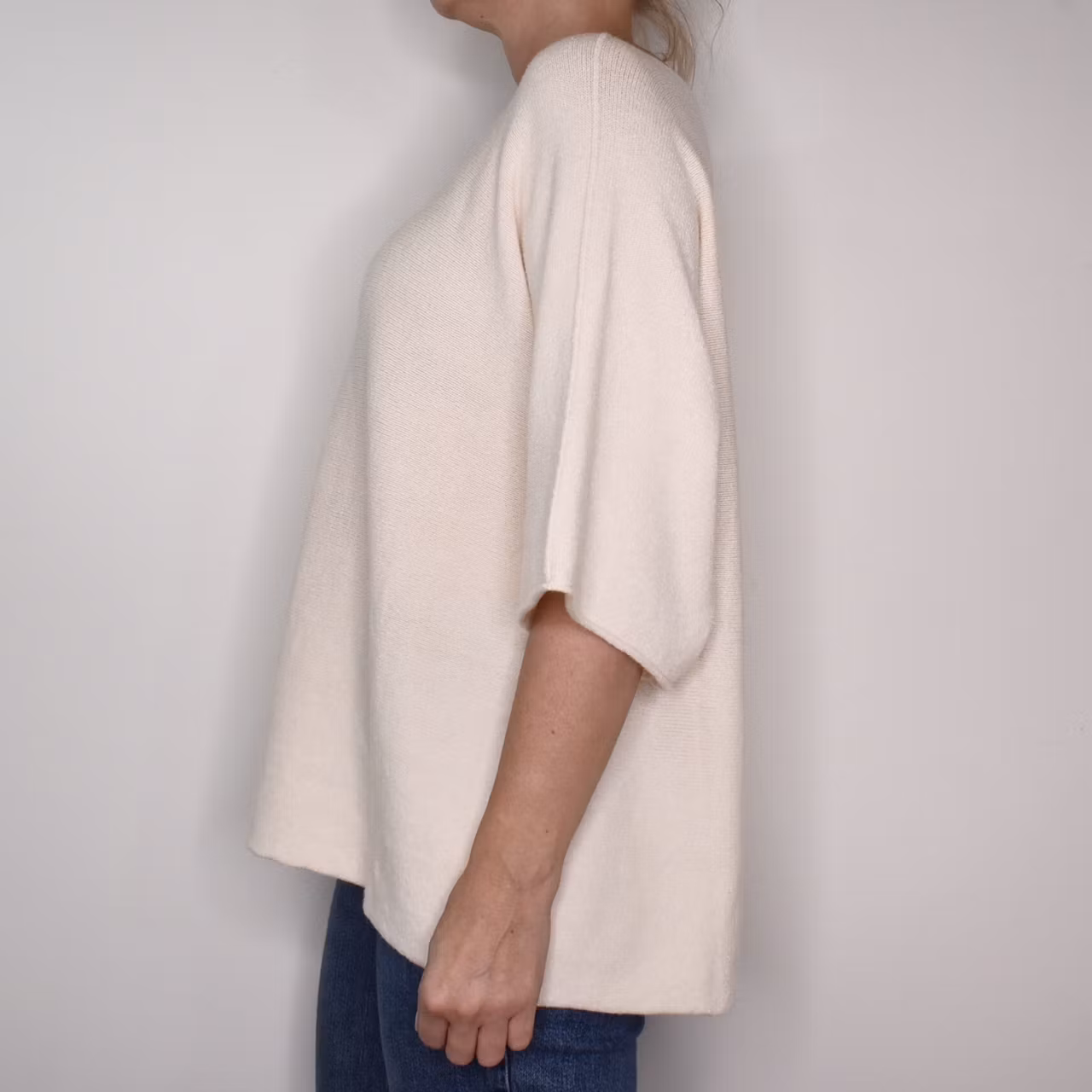 Det här är en härlig finstickad ponchotröja i mjukt och skönt material. Ponchotröjan är kort och vid och har kort ärm. Halsen är tjusigt rundad. Materialet är mjukt och följsamt. Avslappnad passform. Modellen har en bröstvidd på cirka 88cm och är 163cm lång.