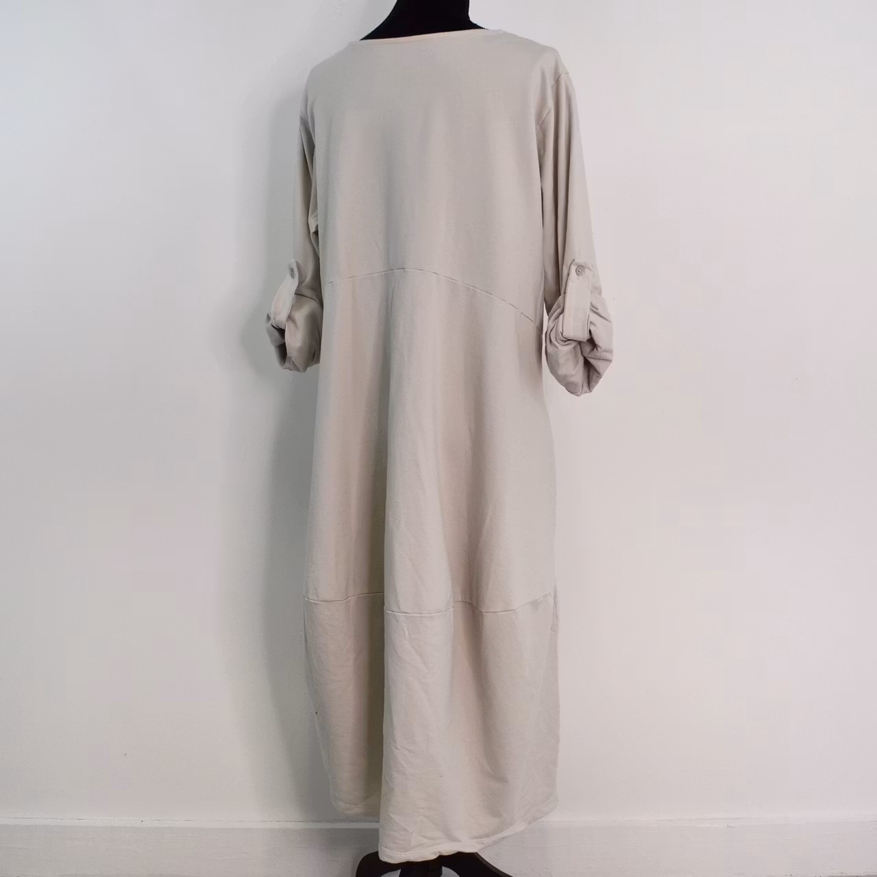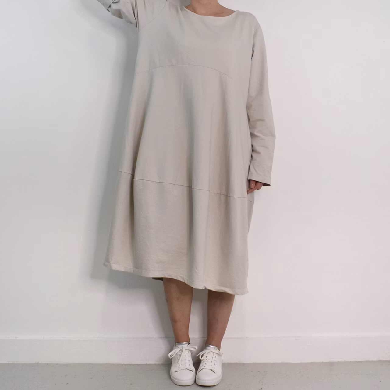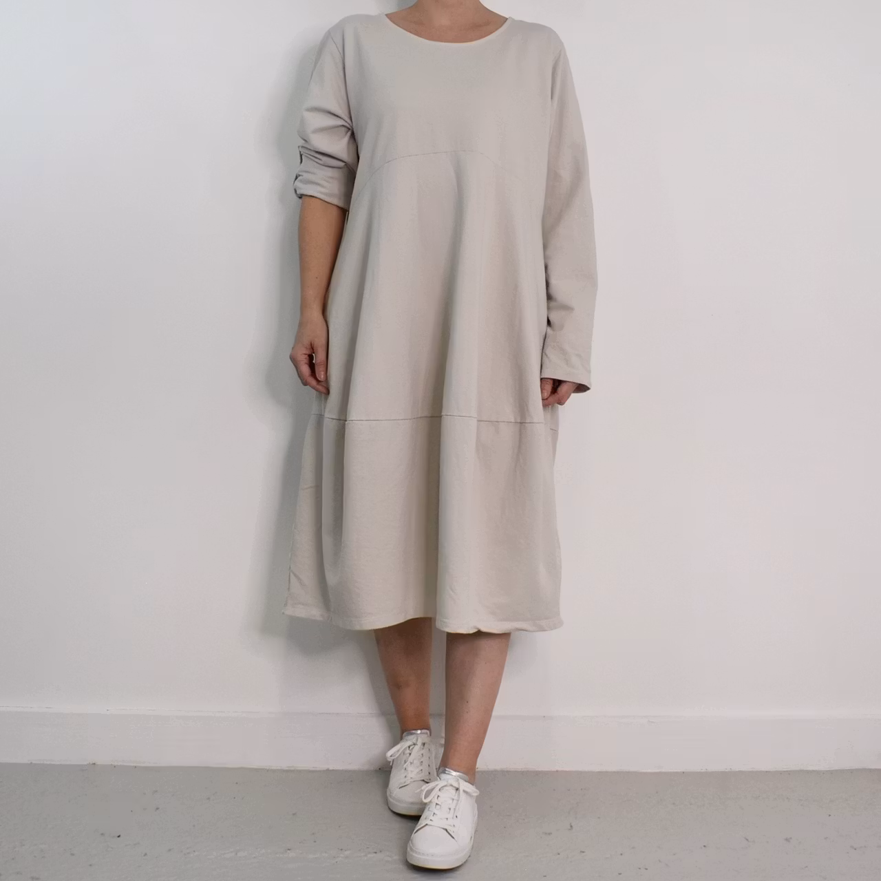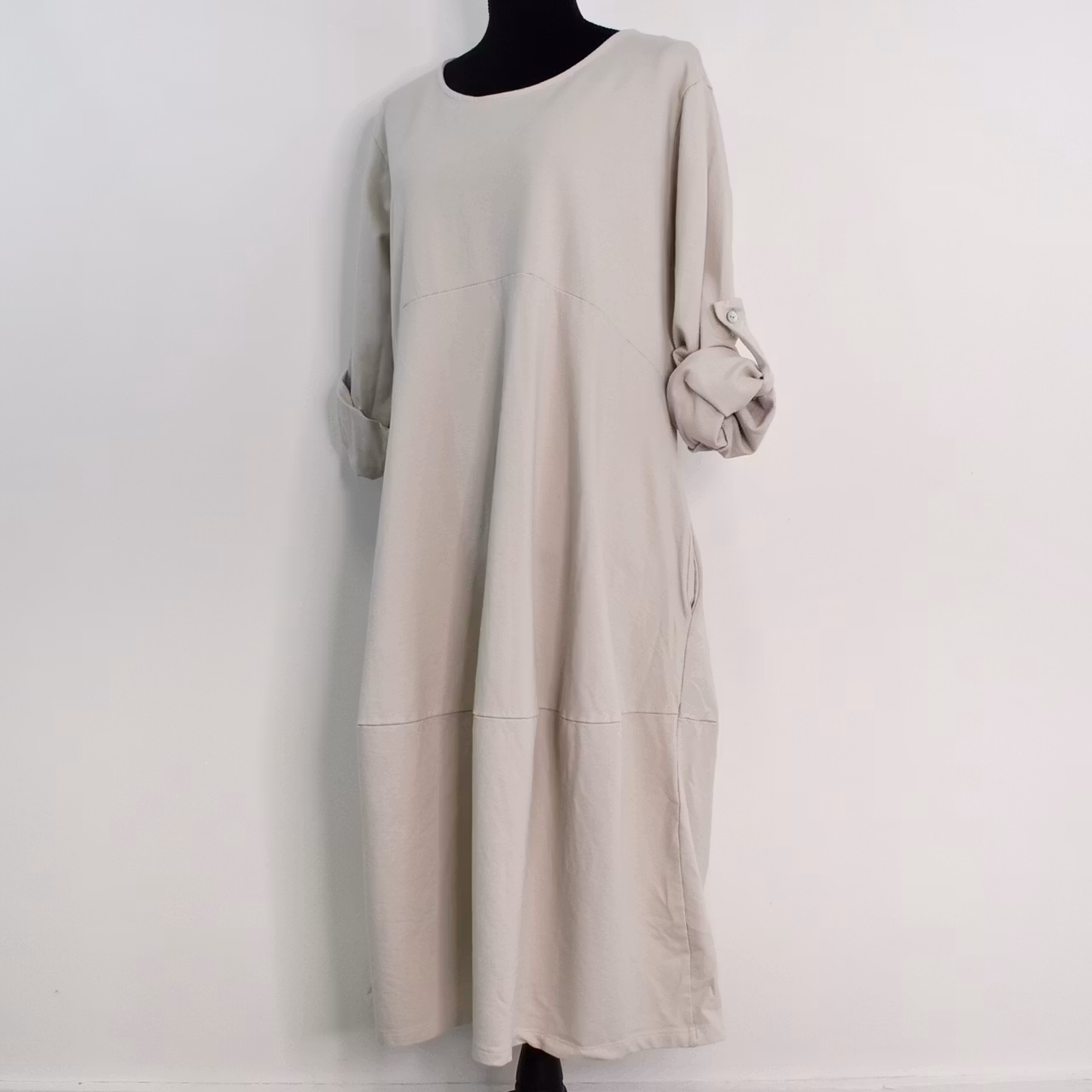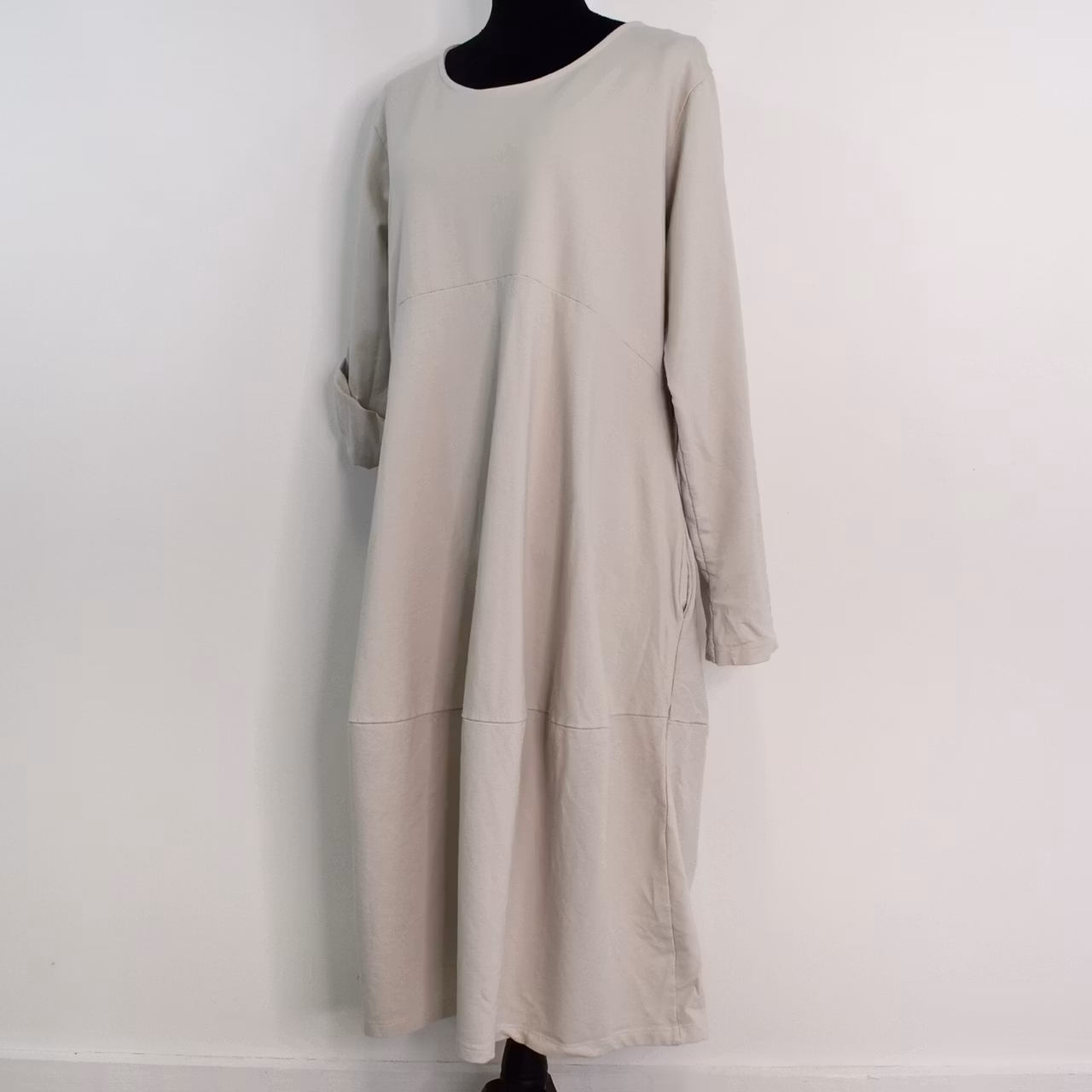 Det här är en fin och skön medellång klänning i tunt, mjukt sweatshirt-tyg. Halsen är enkelt rundad och det finns gömda fickor i sidorna. Det är en härlig vidd i den något ballongformade nederdelen och passformen är avslappnad. Ärmen är lång men kan fästas upp. Det går en söm under bysten och på ryggen samt en nertill på klänningen. Materialet är töjbart men innehåller inte stretch. Då det är individuellt hur man upplever storlekar, och vi alla är olika formade, så rekommenderar vi att ta hjälp av måtten längre ner i beskrivningen för att se vilken storlek som kan passa. Modellen har en bröstvidd på cirka 88cm, är 163cm lång och bär storlek S/M.