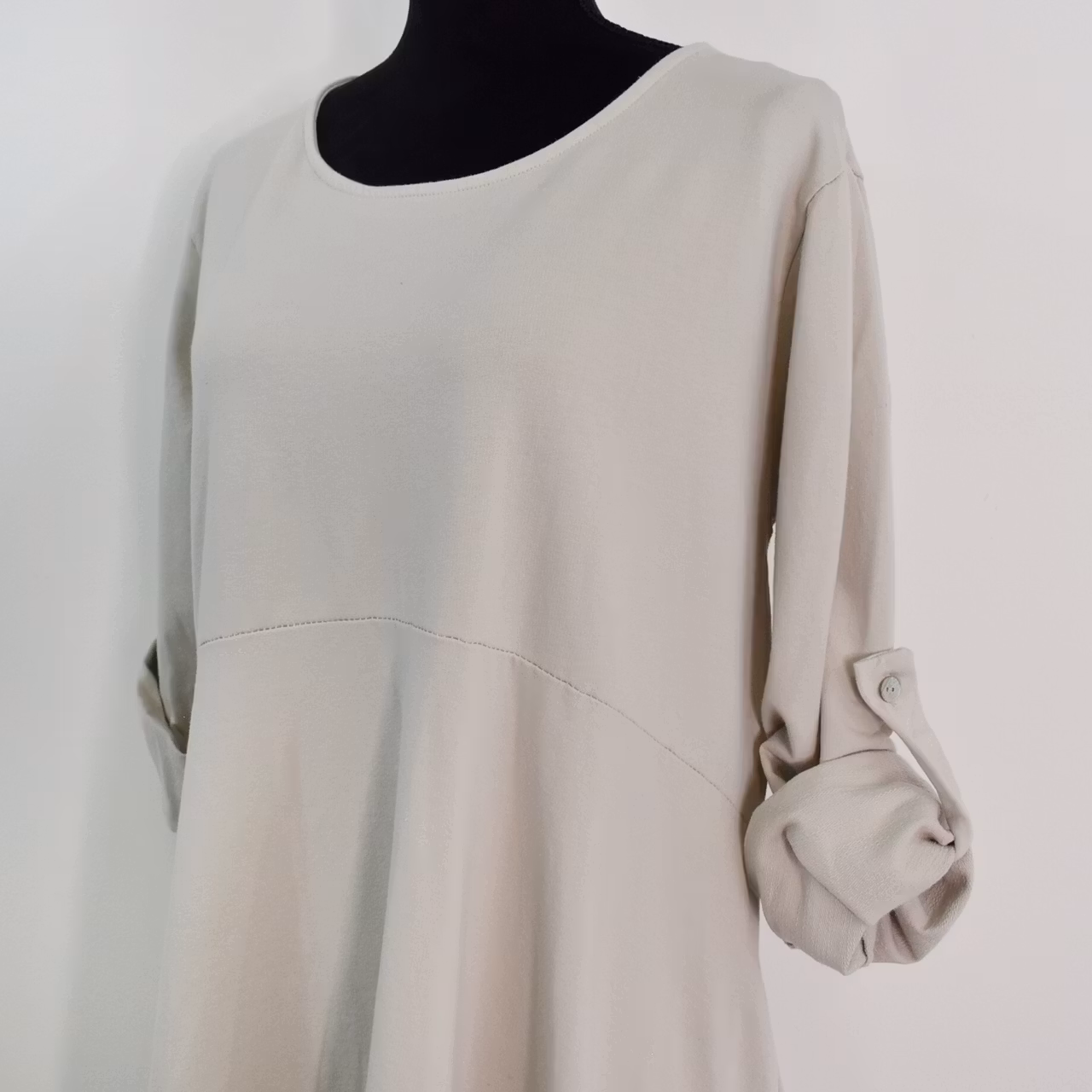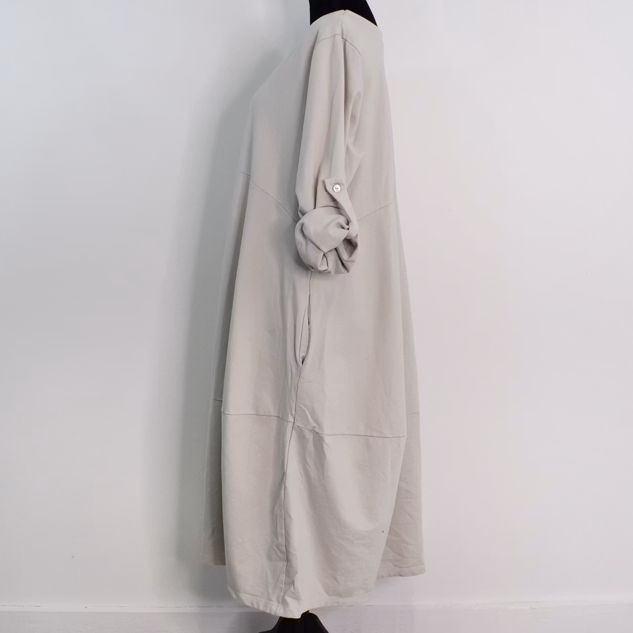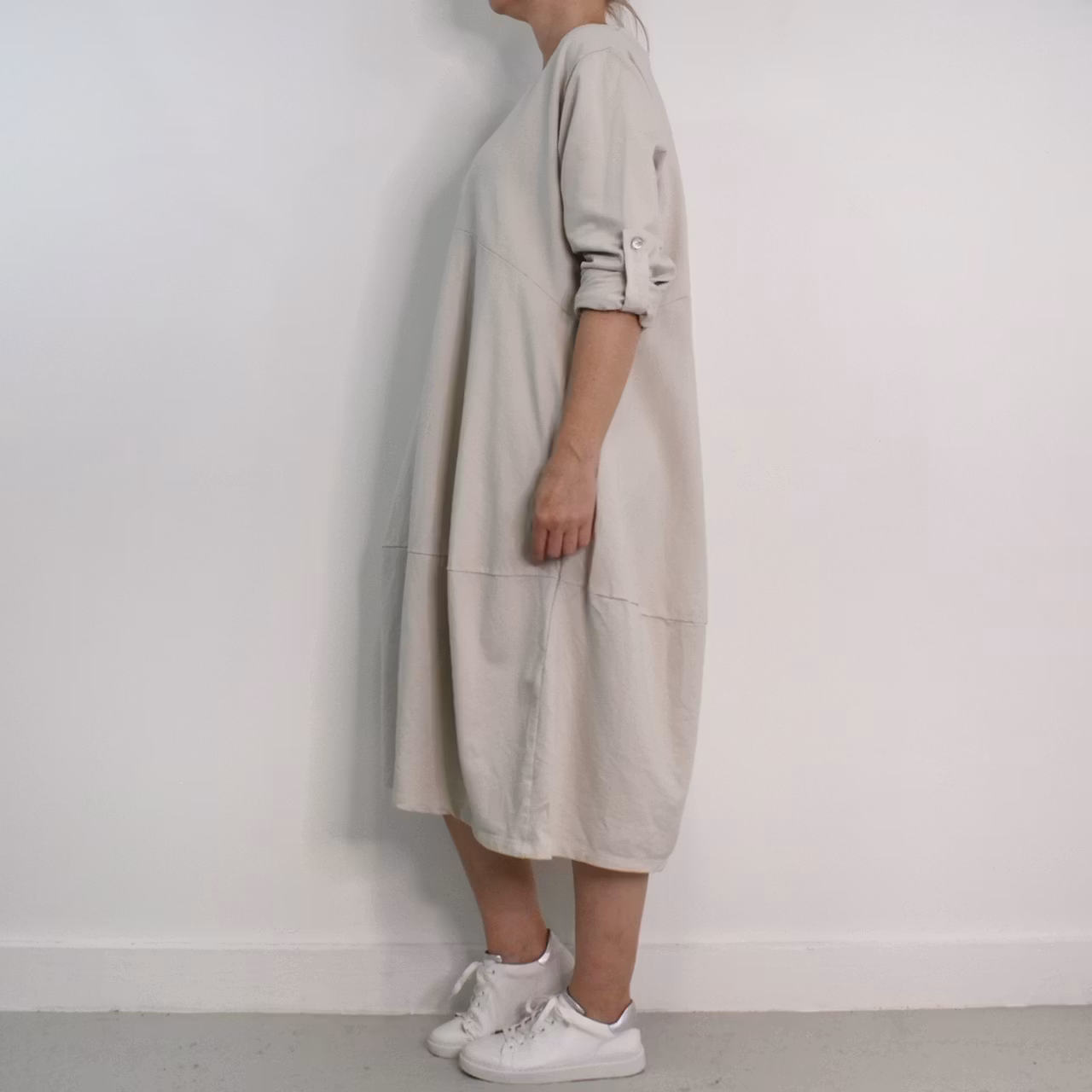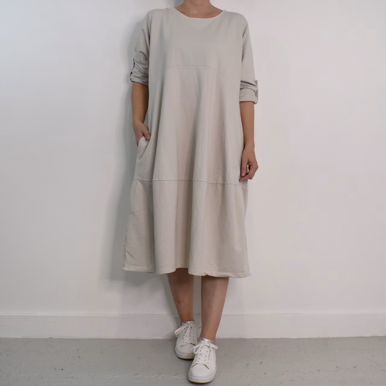 Det här är en fin och skön medellång klänning i tunt, mjukt sweatshirt-tyg. Halsen är enkelt rundad och det finns gömda fickor i sidorna. Det är en härlig vidd i den något ballongformade nederdelen och passformen är avslappnad. Ärmen är lång men kan fästas upp. Det går en söm under bysten och på ryggen samt en nertill på klänningen. Materialet är töjbart men innehåller inte stretch. Då det är individuellt hur man upplever storlekar, och vi alla är olika formade, så rekommenderar vi att ta hjälp av måtten längre ner i beskrivningen för att se vilken storlek som kan passa. Modellen har en bröstvidd på cirka 88cm, är 163cm lång och bär storlek S/M.