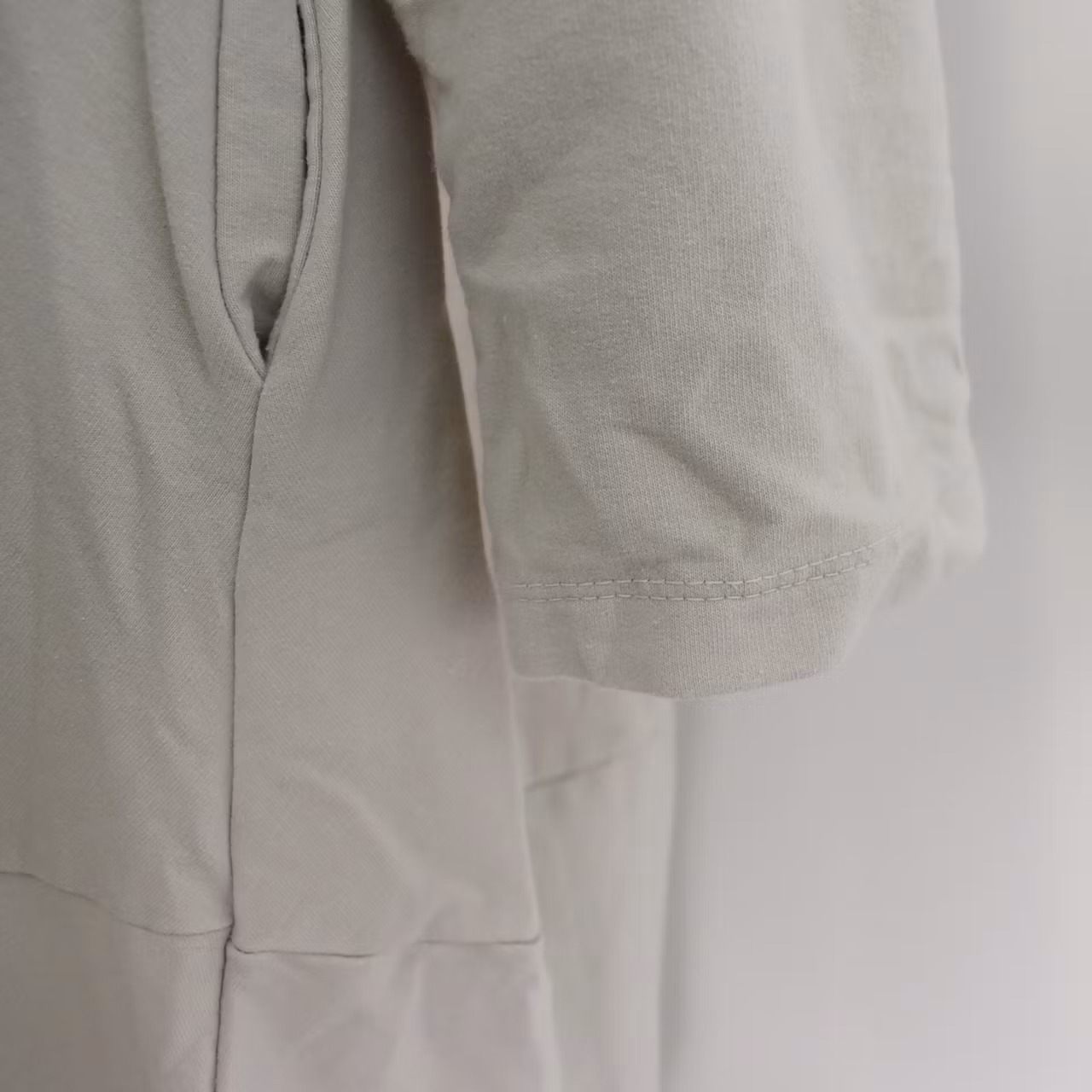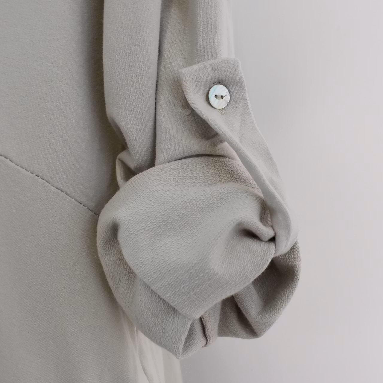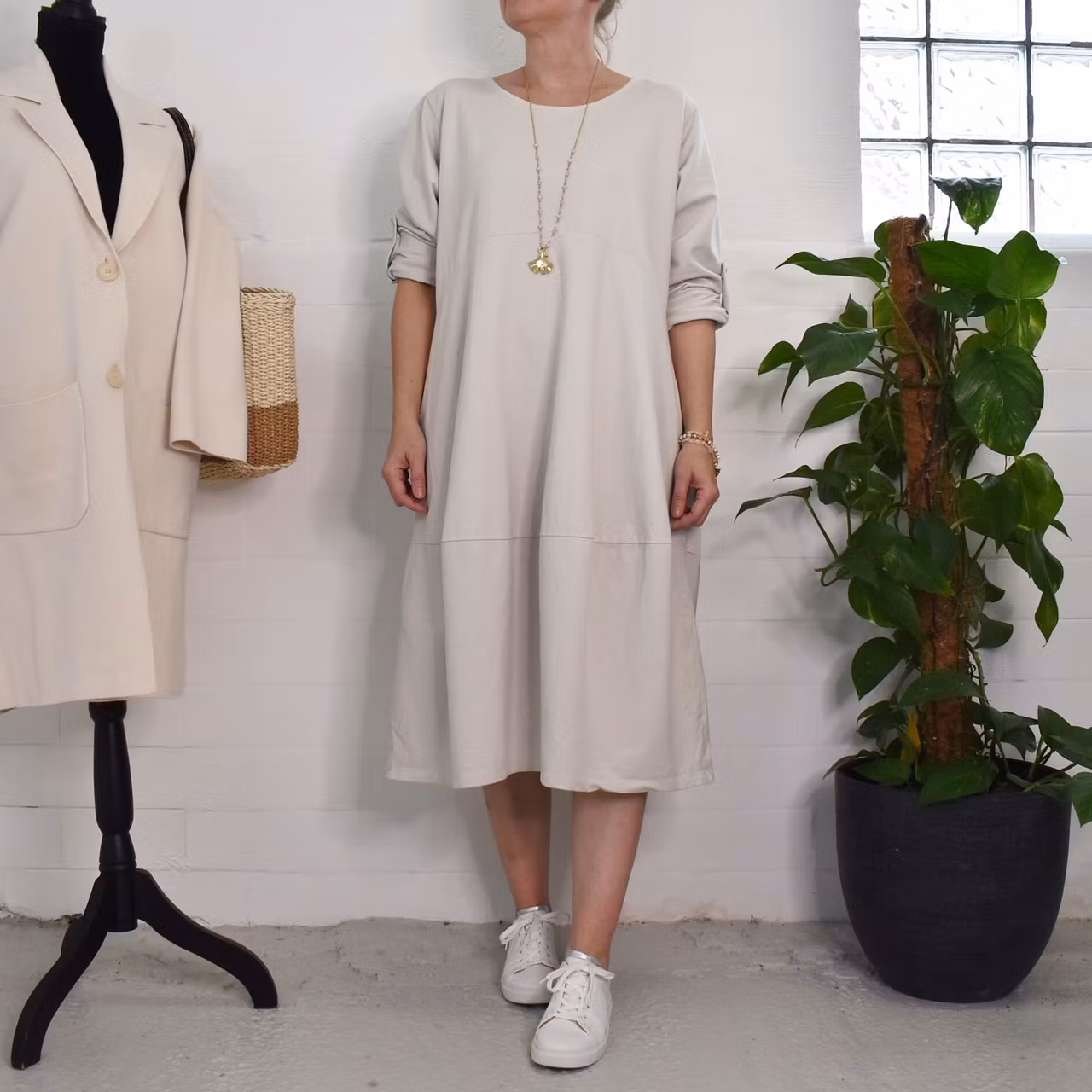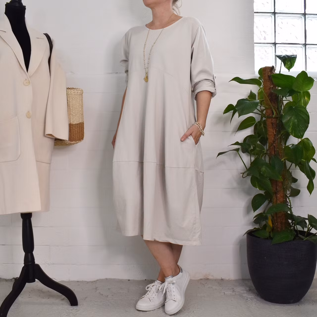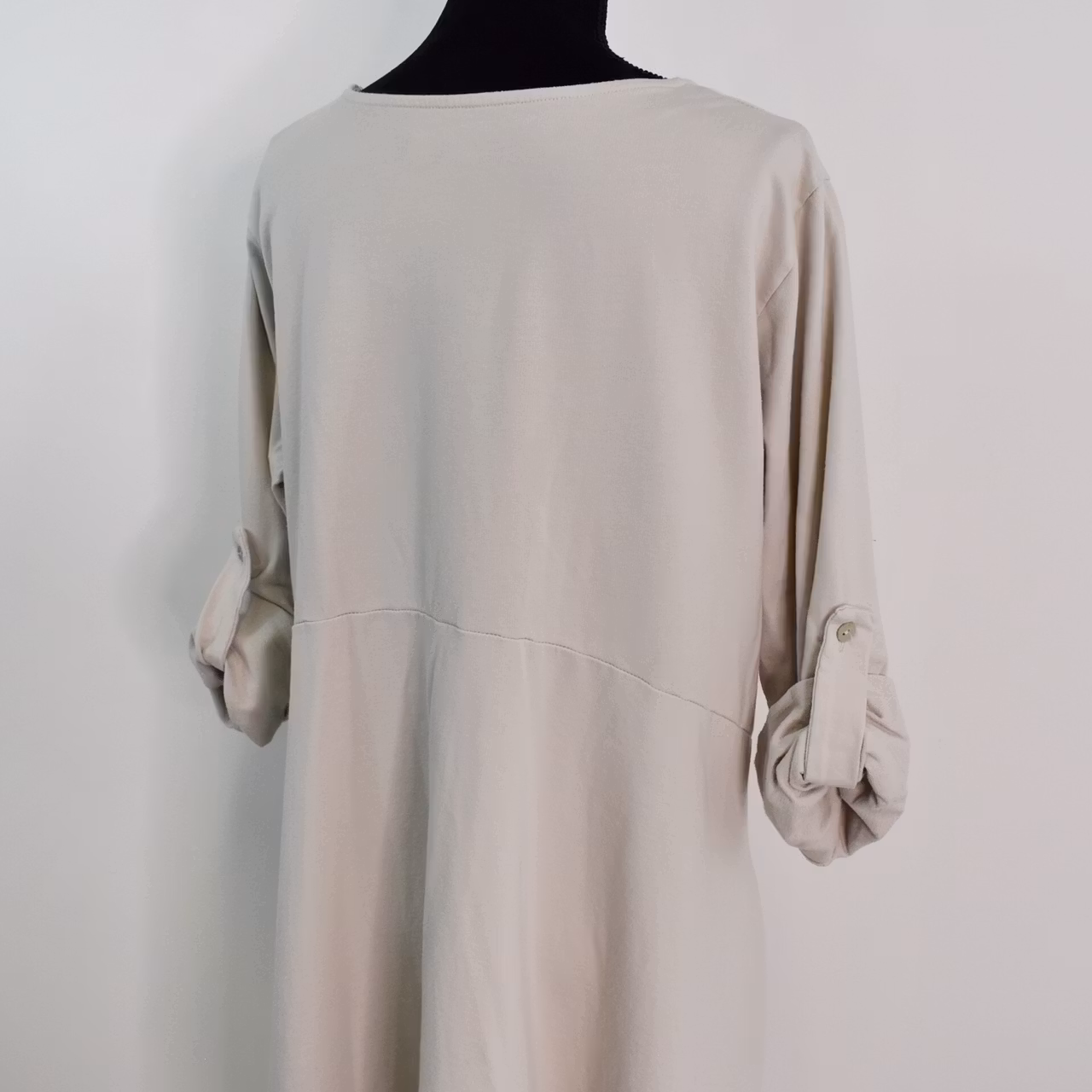 Det här är en fin och skön medellång klänning i tunt, mjukt sweatshirt-tyg. Halsen är enkelt rundad och det finns gömda fickor i sidorna. Det är en härlig vidd i den något ballongformade nederdelen och passformen är avslappnad. Ärmen är lång men kan fästas upp. Det går en söm under bysten och på ryggen samt en nertill på klänningen. Materialet är töjbart men innehåller inte stretch. Då det är individuellt hur man upplever storlekar, och vi alla är olika formade, så rekommenderar vi att ta hjälp av måtten längre ner i beskrivningen för att se vilken storlek som kan passa. Modellen har en bröstvidd på cirka 88cm, är 163cm lång och bär storlek S/M.