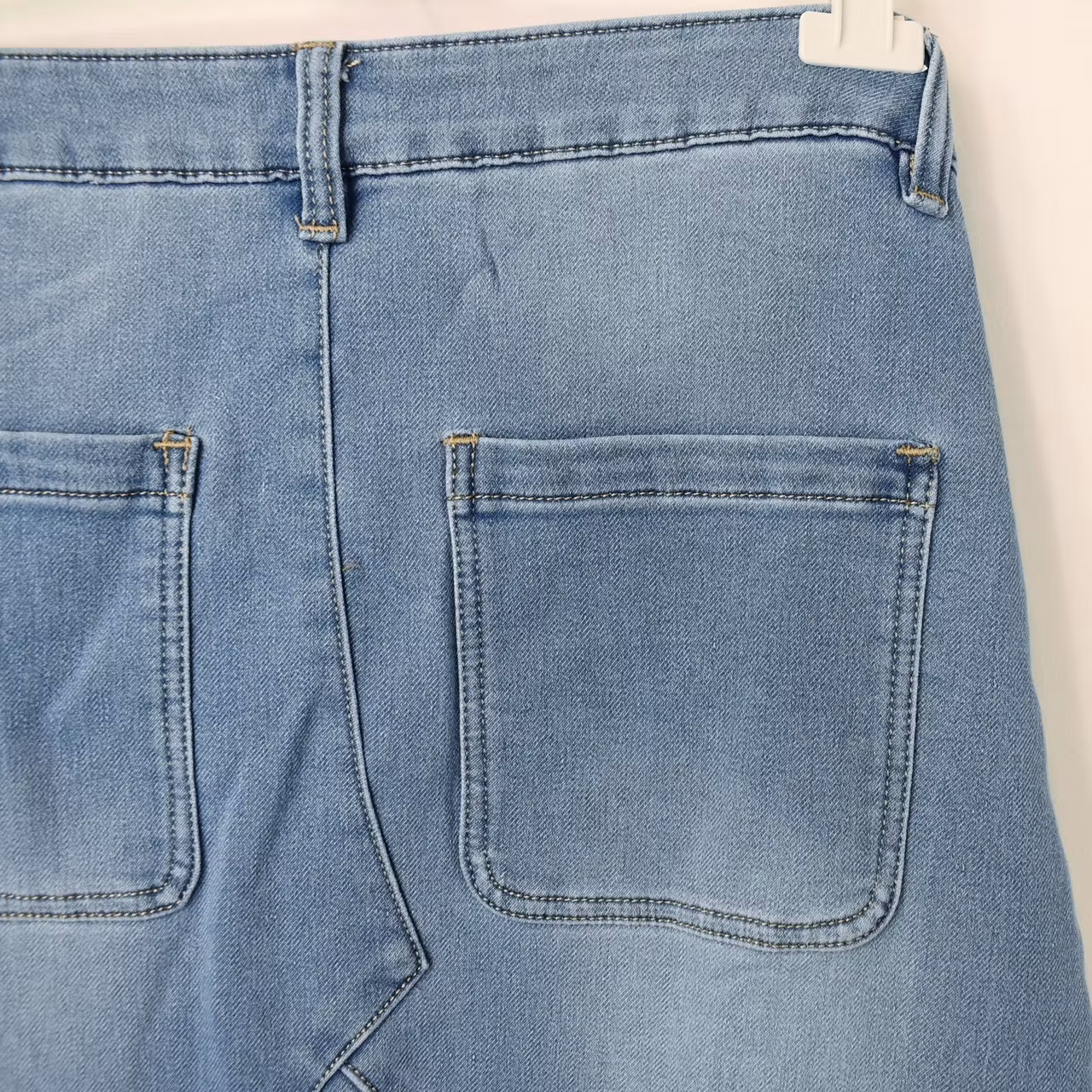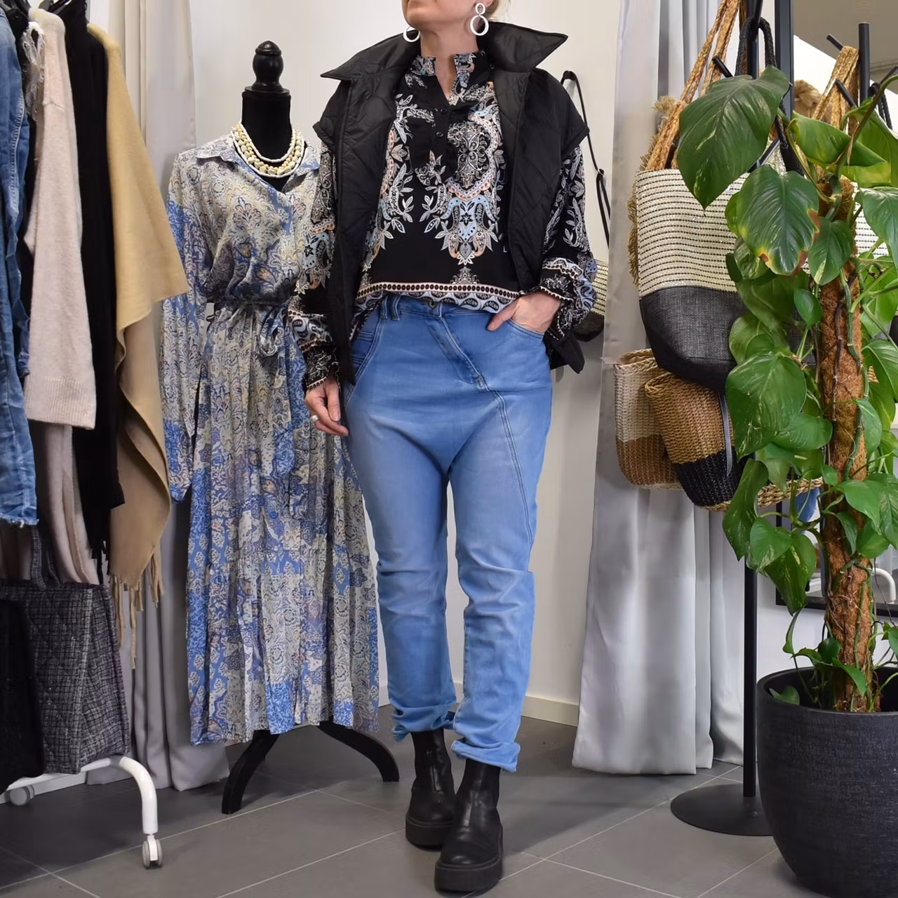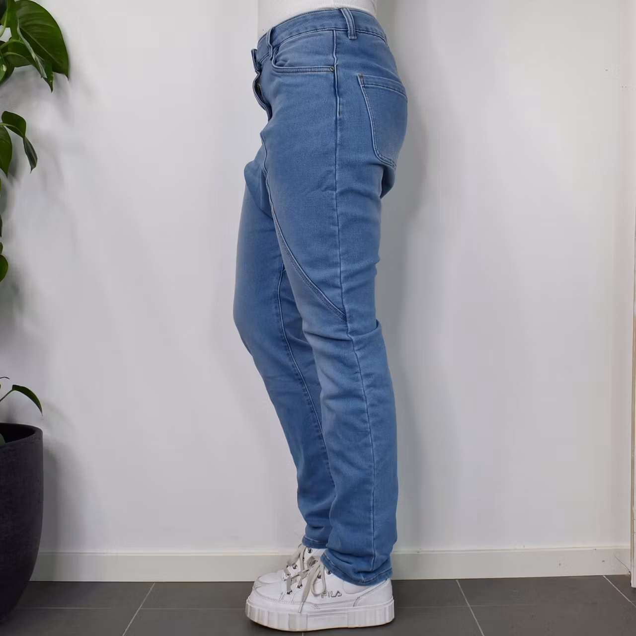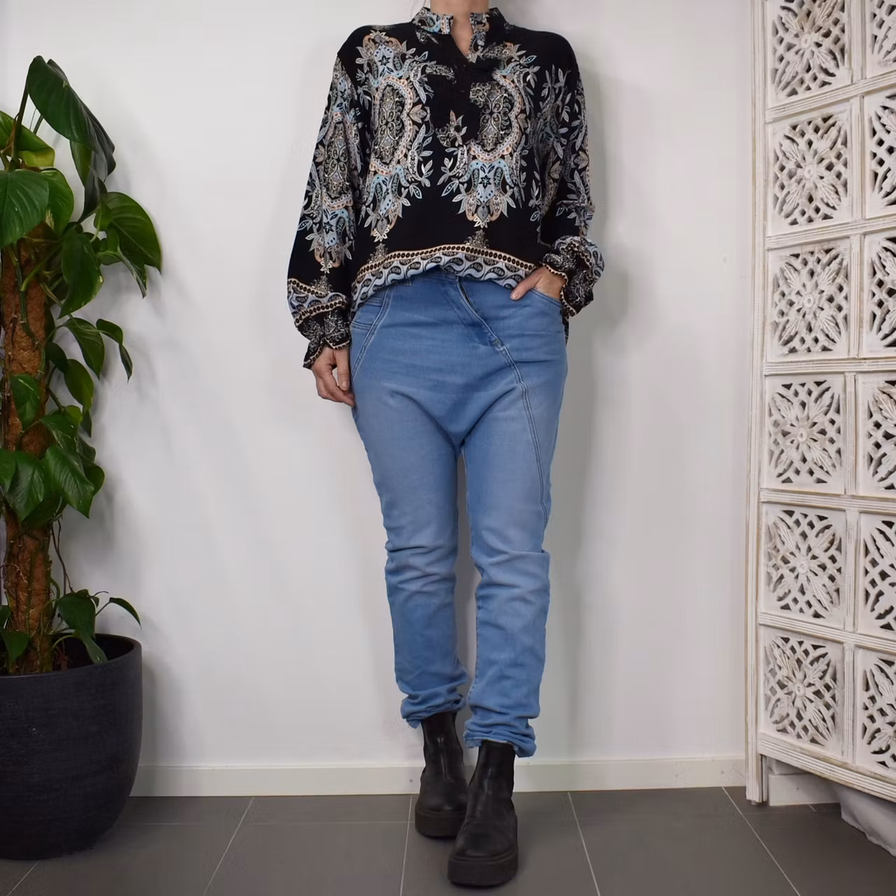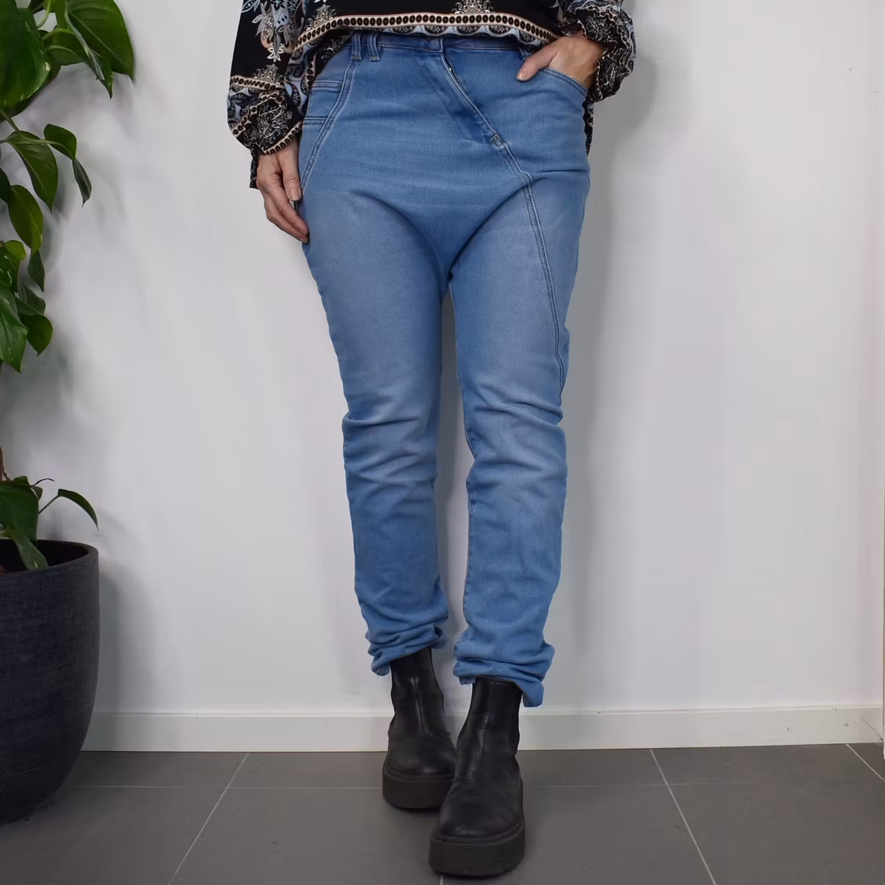 Det här är snygga baggyjeans i mjuk och skön joggerdenim. Jeansen stängs med knapp och gylf. Det finns en ficka på vänster sida fram samt på baktill. Fickan på höger sida är endast dekorativ och på vänster lår går en sned söm. Benen är raka från knäet och ner. Materialet innehåller stretch. Eftersom alla jeans är olika i mått och modell, då det är individuellt hur man upplever storlekar samt att vi alla är olika formade, så rekommenderar vi att ta hjälp av måtten längre ner i beskrivningen för att hitta rätt storlek. Storlekar XS-XL. Modellen har en midjevidd på cirka 76cm, en stuss på cirka 98cm, är 163cm lång, och bär storlek S.
