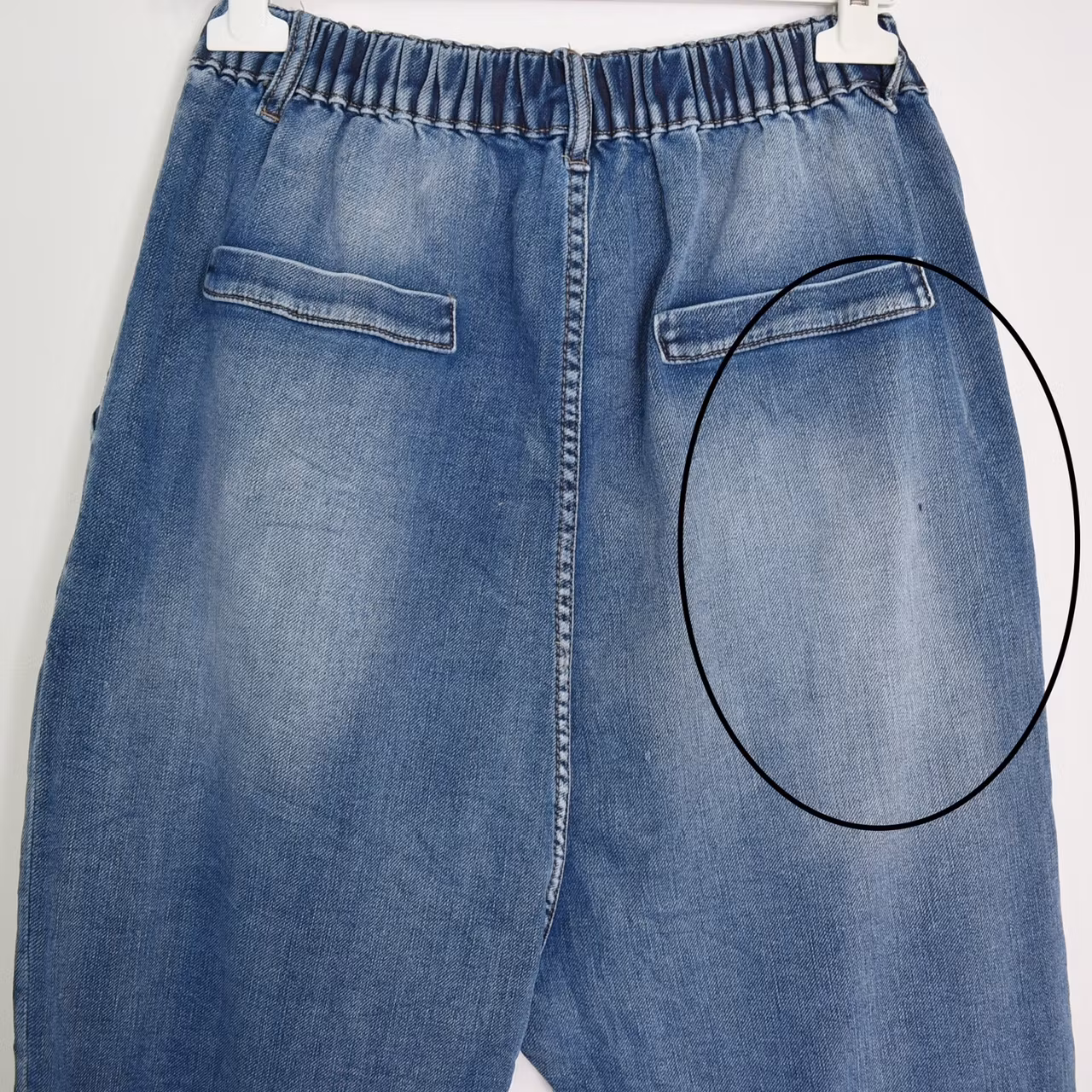 Det här är sköna och rejält pösiga baggy-jeans med dekorativa veck fram och stretchig resår bak i midjan. Jeansen har lös och rymlig passform med avsmalnande ben. Två fickor finns fram och de baktill är endast dekorativa. Jeansen stängs med knapp och gylf med blixtlås. Hällor för skärp finns. Eftersom alla jeans är olika i mått och modell samt att vi alla är olika formade, så rekommenderar vi att man alltid tar hjälp av måtten för att hitta rätt storlek. Modellen har en midjevidd på cirka 76cm, en stuss på cirka 98cm, är 163cm lång, och bär storlek S.