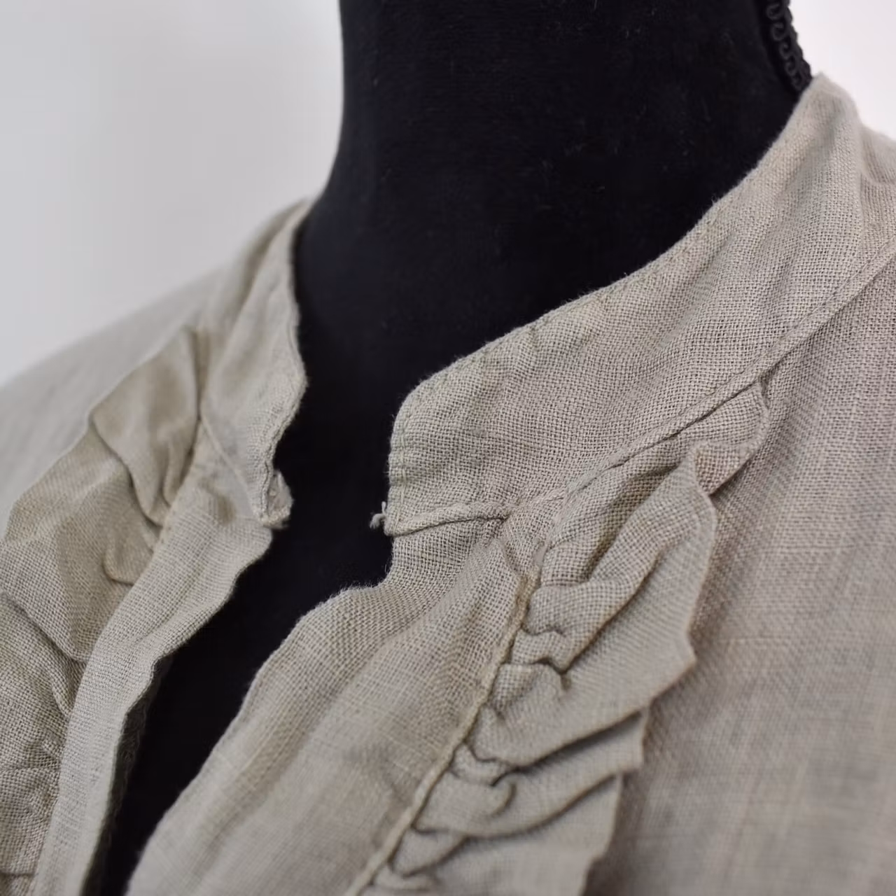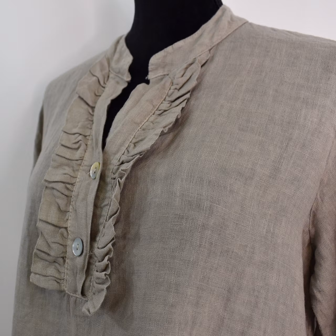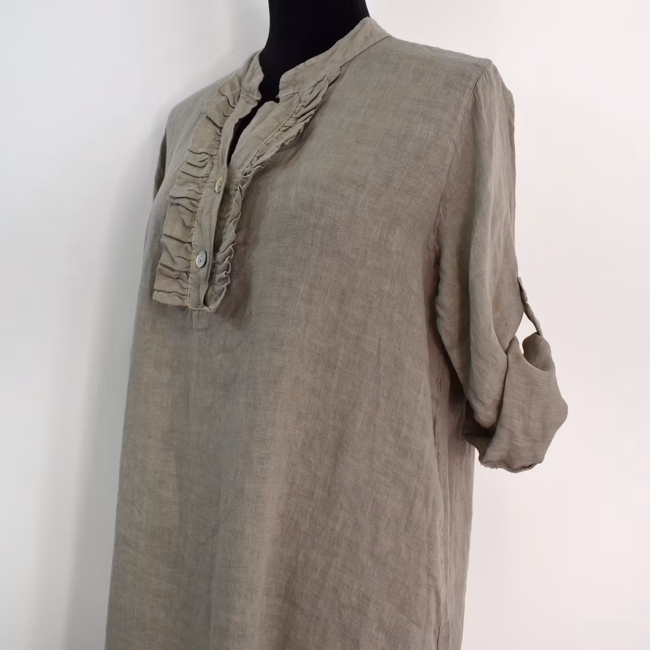 Det här är en vacker medellång linneklänning med liten ståkrage och krås framtill. Där är två pärlemorskimrande knappar fram samt en på den smala, trekvartslånga ärmen så att den kan fästas upp. Tyget är glesvävt och något genomskinligt. Modellen har en bröstvidd på cirka 88cm, är 163cm lång och bär storlek S/M. Observera att förekomsten av streck, färgskiftningar etc. inte är defekter utan en del av det som gör tyget vackert.