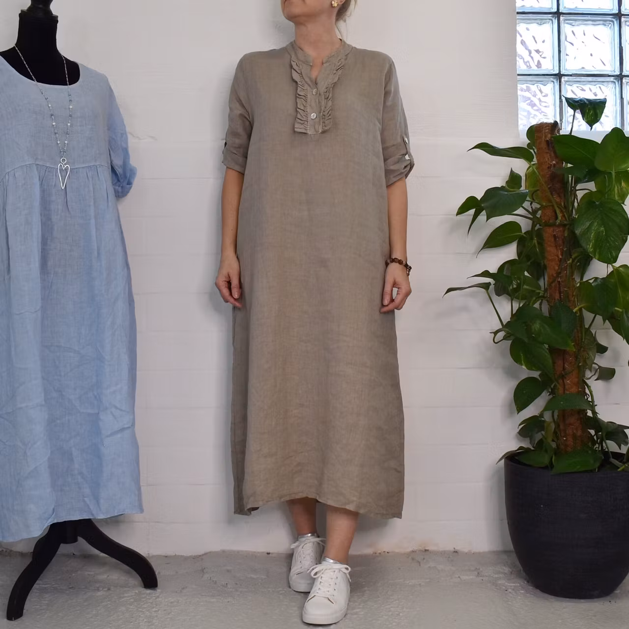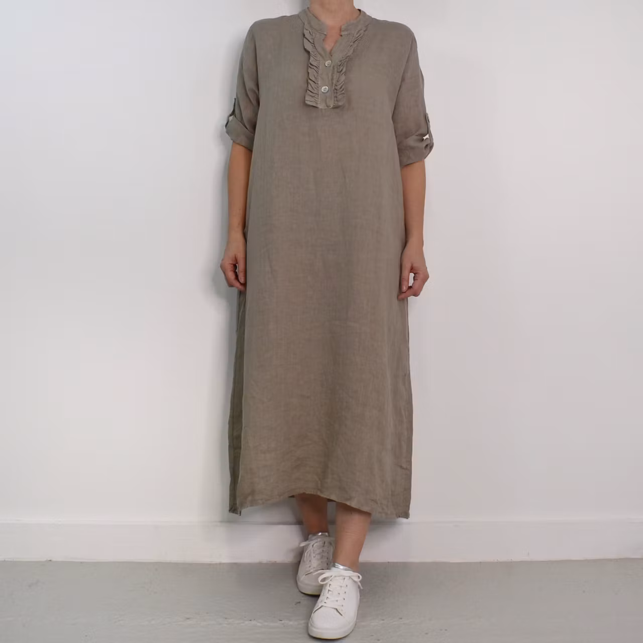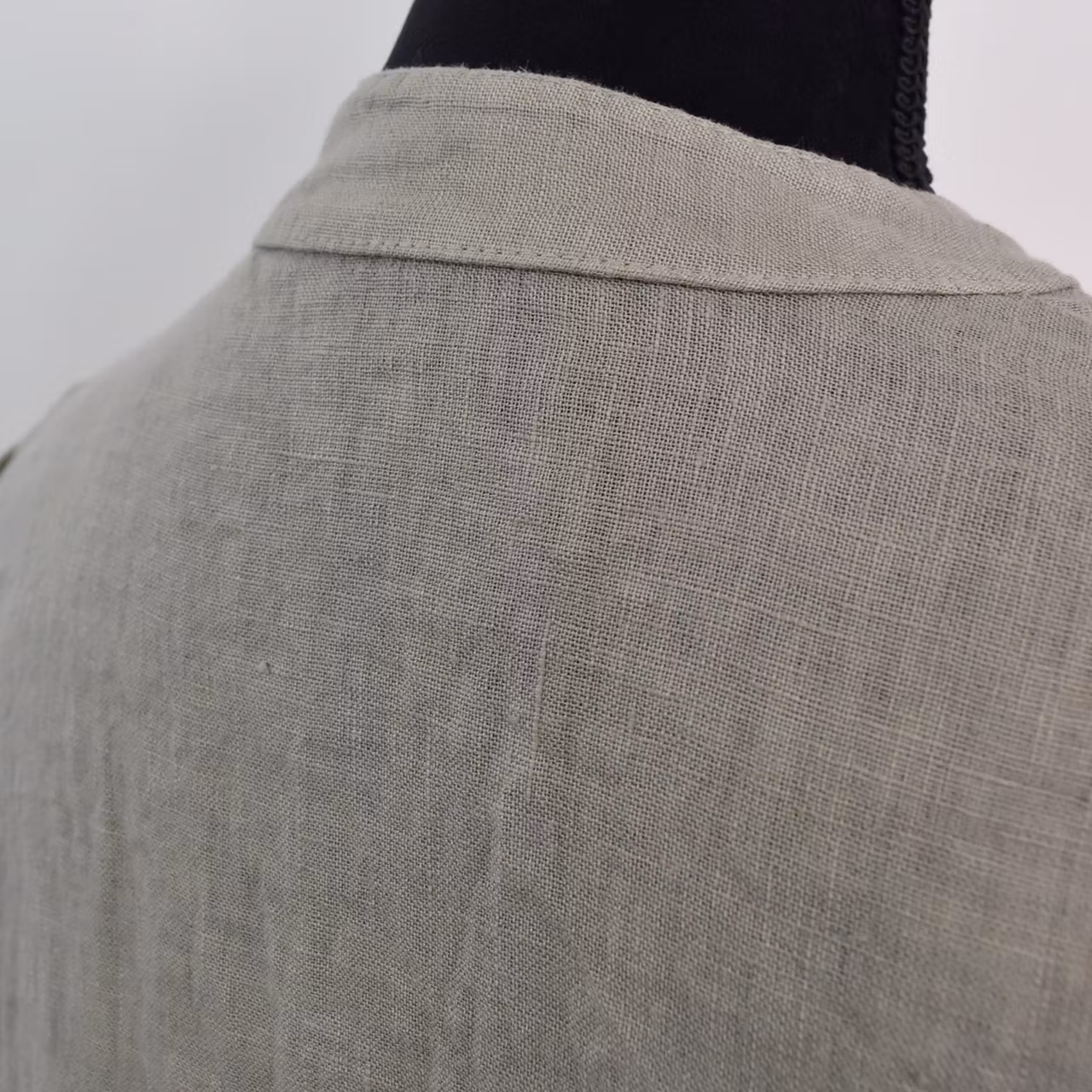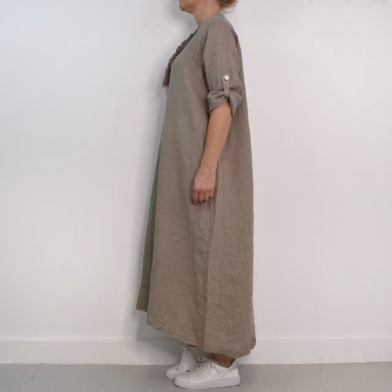 Det här är en vacker medellång linneklänning med liten ståkrage och krås framtill. Där är två pärlemorskimrande knappar fram samt en på den smala, trekvartslånga ärmen så att den kan fästas upp. Tyget är glesvävt och något genomskinligt. Modellen har en bröstvidd på cirka 88cm, är 163cm lång och bär storlek S/M. Observera att förekomsten av streck, färgskiftningar etc. inte är defekter utan en del av det som gör tyget vackert.