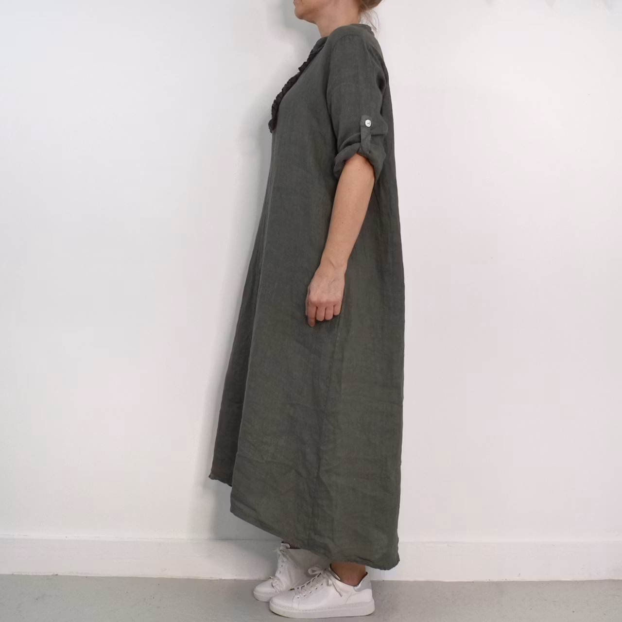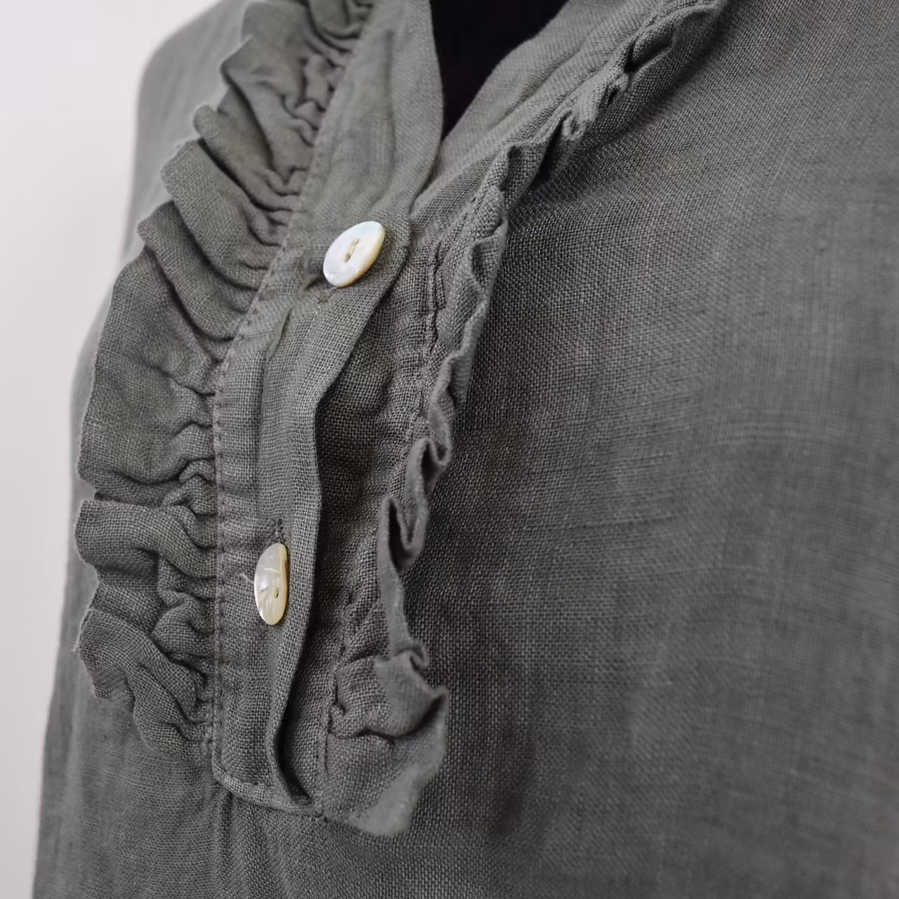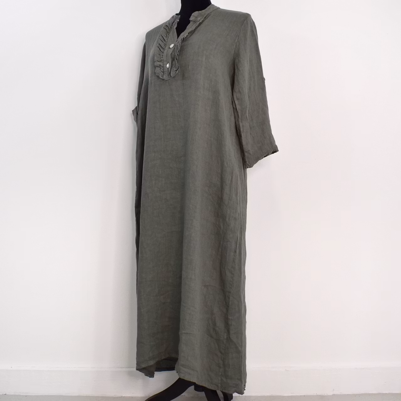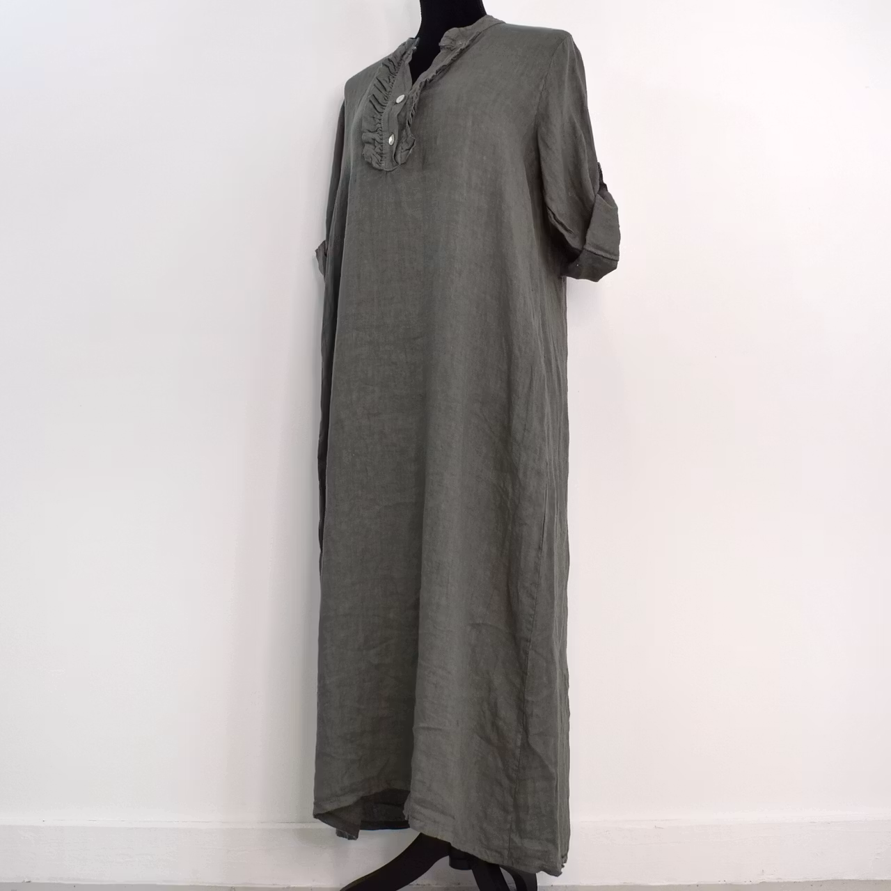 Det här är en vacker medellång linneklänning med liten ståkrage och krås framtill. Där är två pärlemorskimrande knappar fram samt en på den trekvartslånga ärmen så att den kan fästas upp. Tyget är glesvävt och något genomskinligt. Modellen har en bröstvidd på cirka 88cm, är 163cm lång och bär storlek S/M. Observera att förekomsten av streck, färgskiftningar etc. inte är defekter utan en del av det som gör tyget vackert.