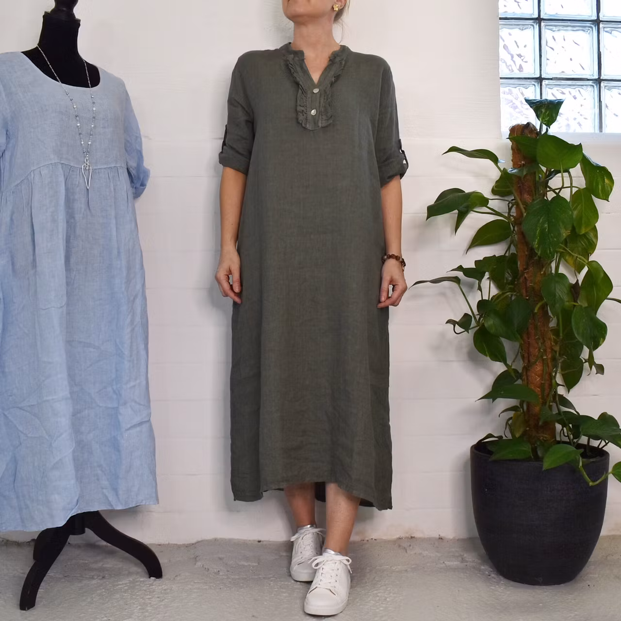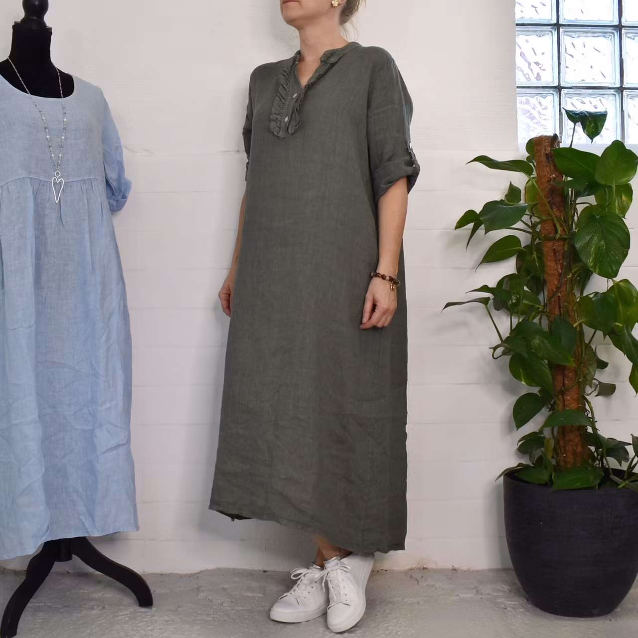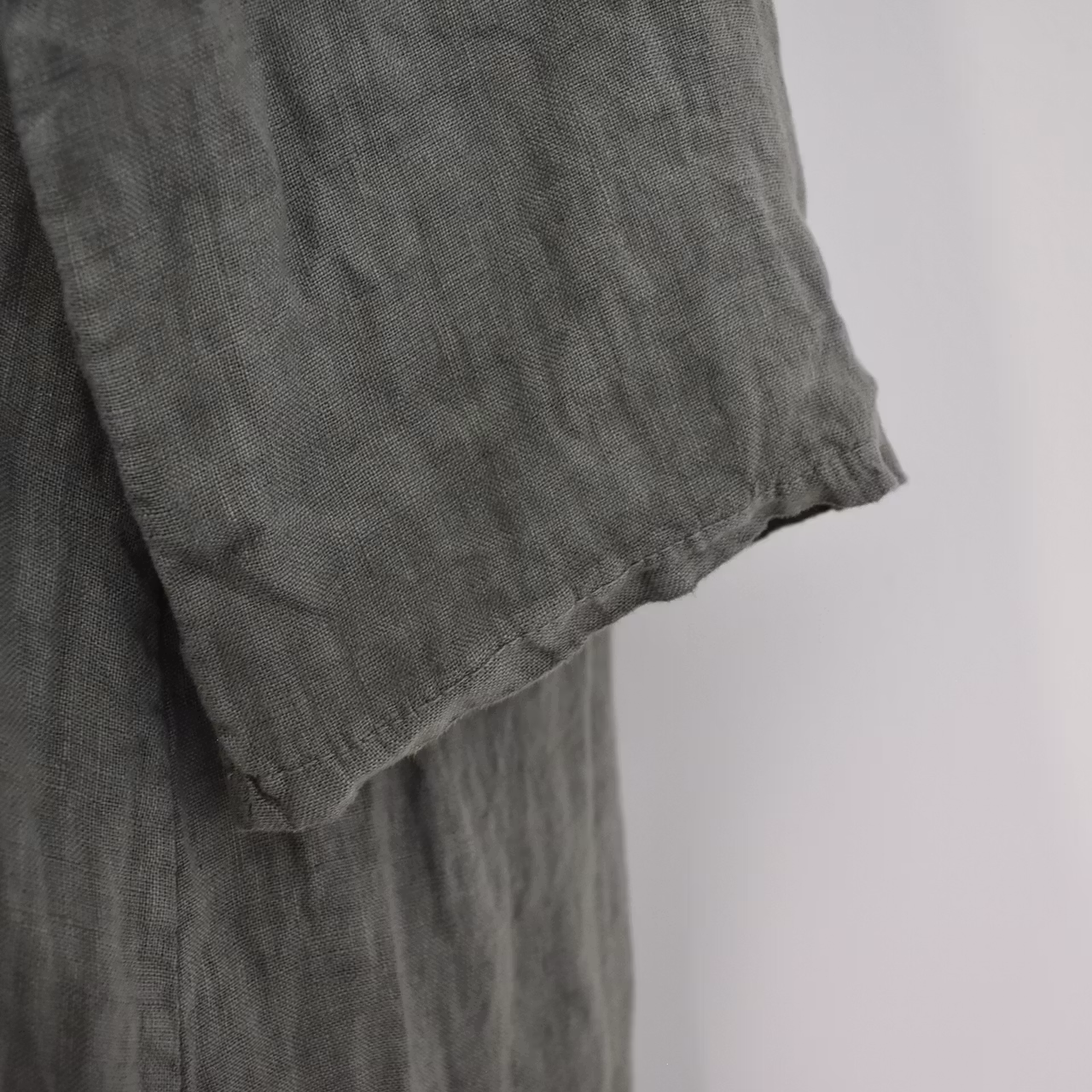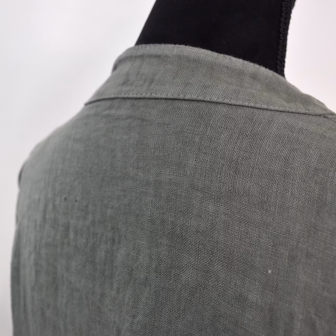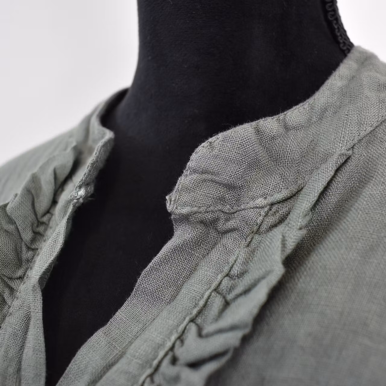 Det här är en vacker medellång linneklänning med liten ståkrage och krås framtill. Där är två pärlemorskimrande knappar fram samt en på den trekvartslånga ärmen så att den kan fästas upp. Tyget är glesvävt och något genomskinligt. Modellen har en bröstvidd på cirka 88cm, är 163cm lång och bär storlek S/M. Observera att förekomsten av streck, färgskiftningar etc. inte är defekter utan en del av det som gör tyget vackert.