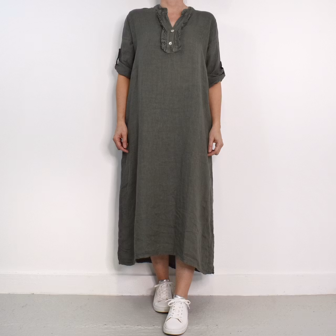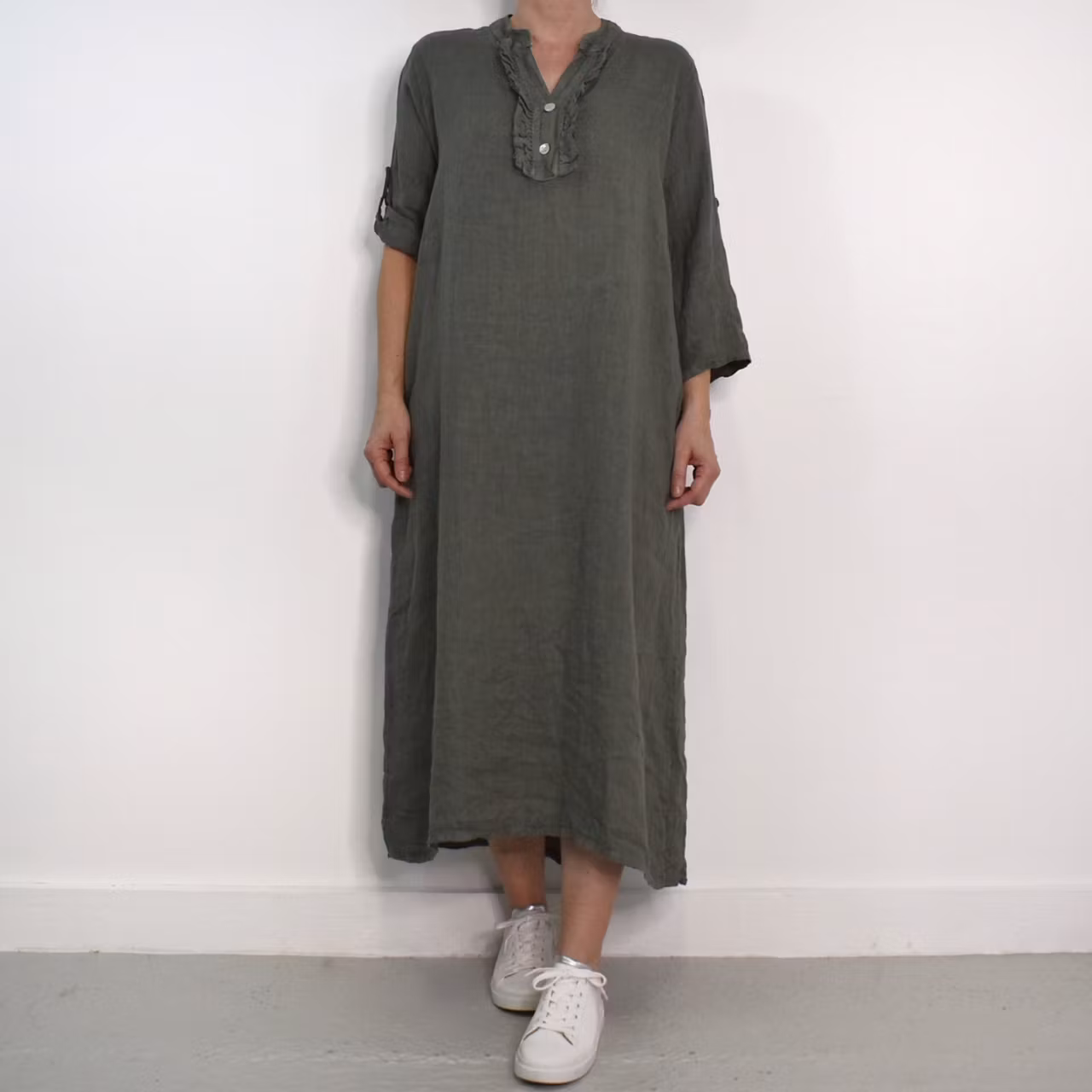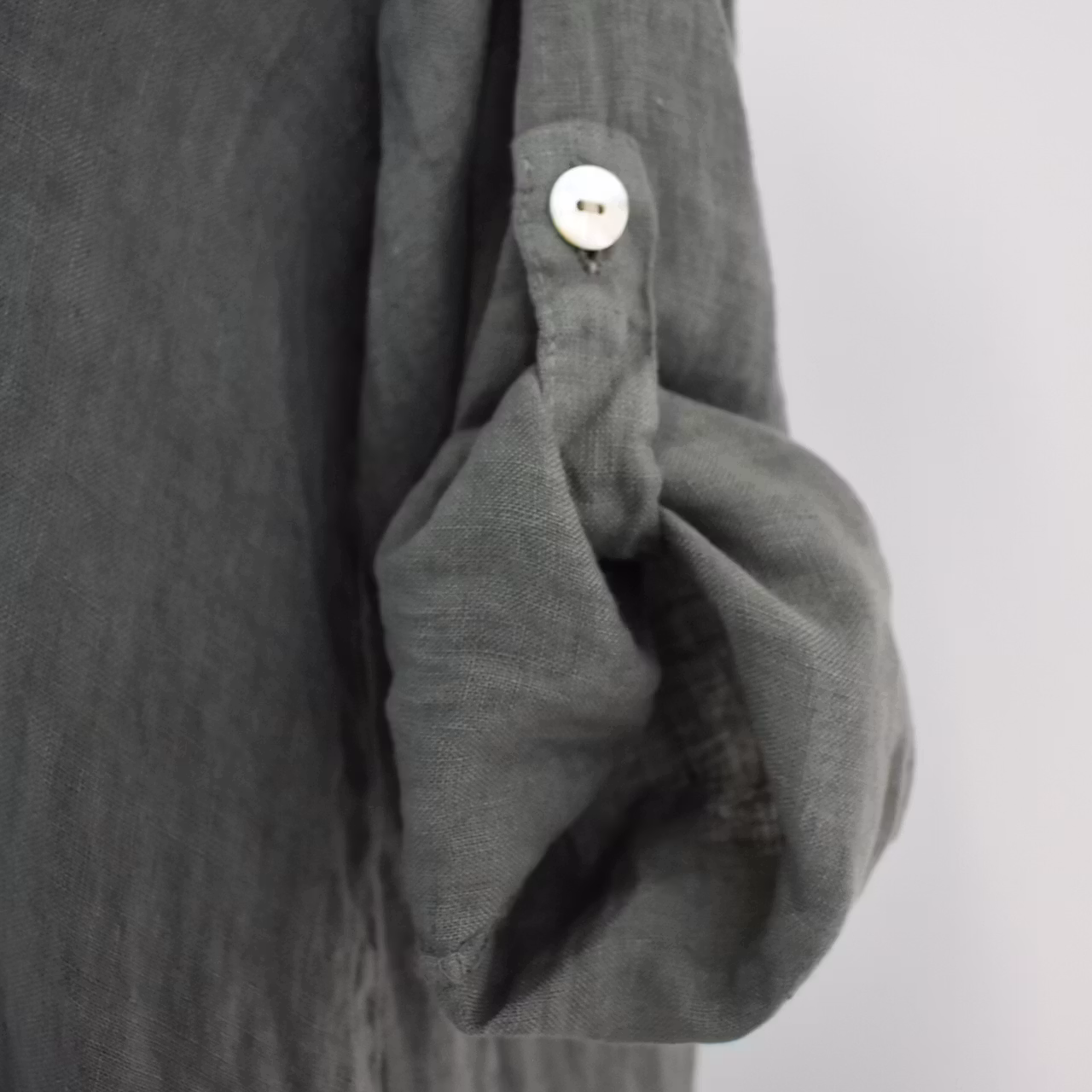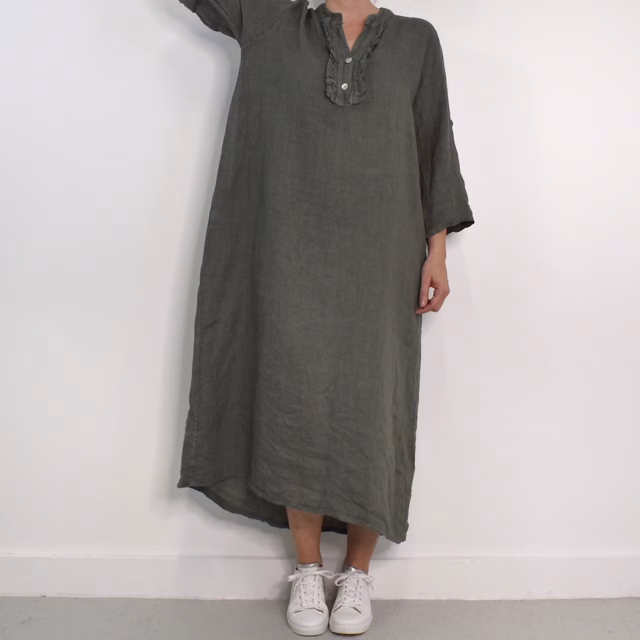 Det här är en vacker medellång linneklänning med liten ståkrage och krås framtill. Där är två pärlemorskimrande knappar fram samt en på den trekvartslånga ärmen så att den kan fästas upp. Tyget är glesvävt och något genomskinligt. Modellen har en bröstvidd på cirka 88cm, är 163cm lång och bär storlek S/M. Observera att förekomsten av streck, färgskiftningar etc. inte är defekter utan en del av det som gör tyget vackert.