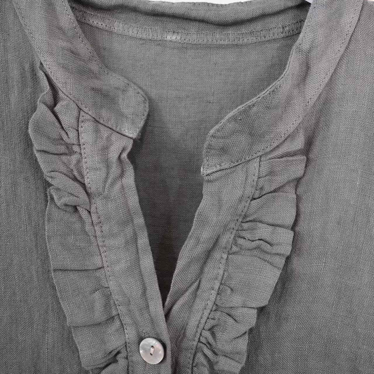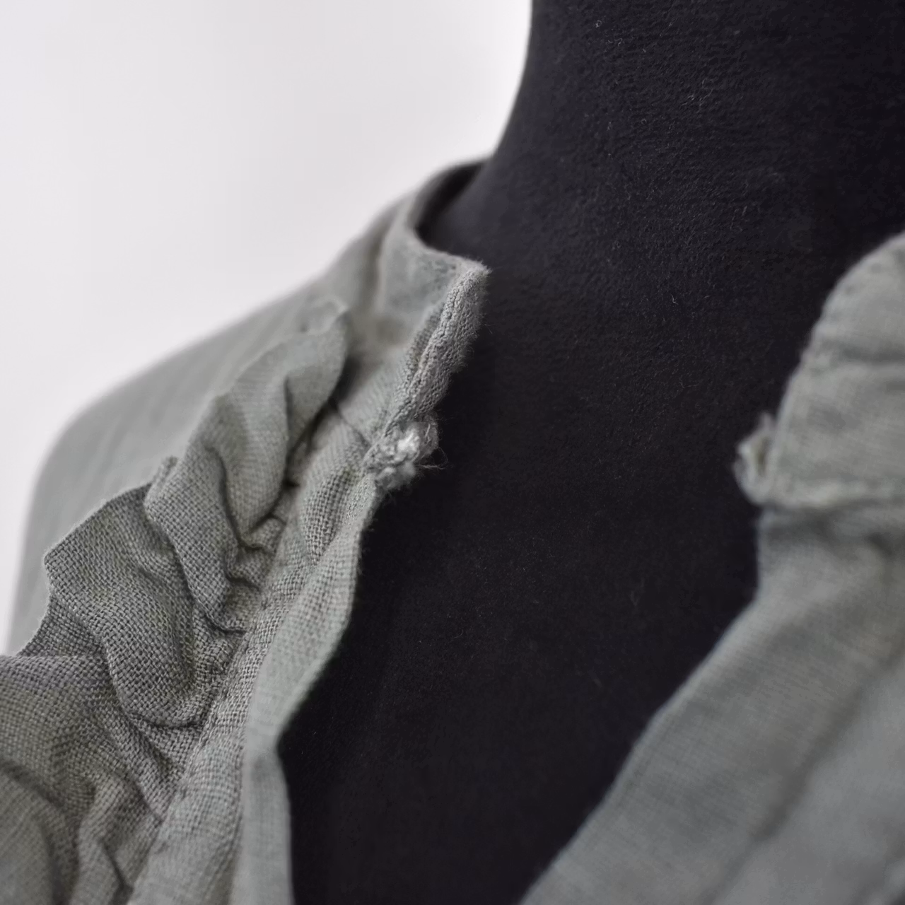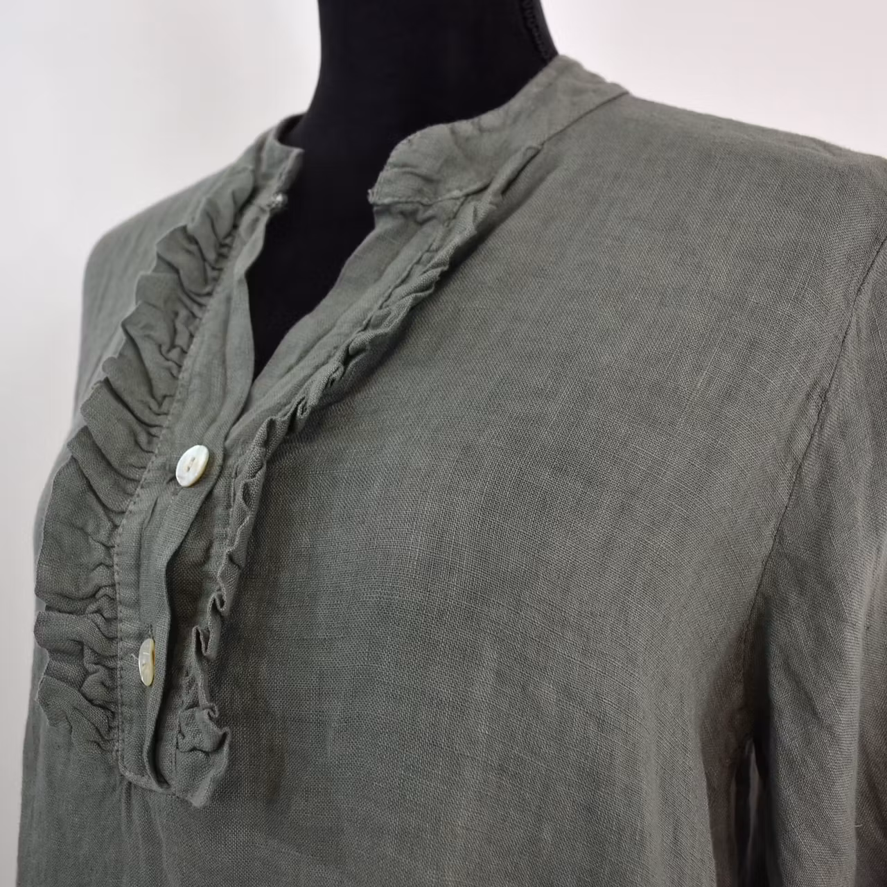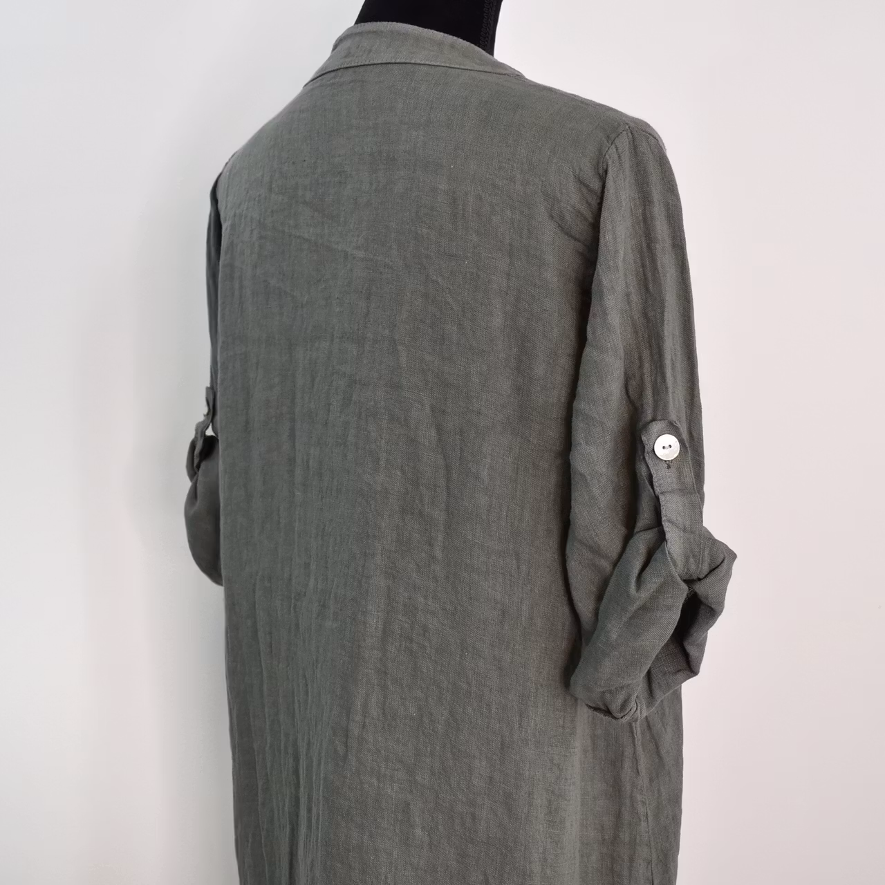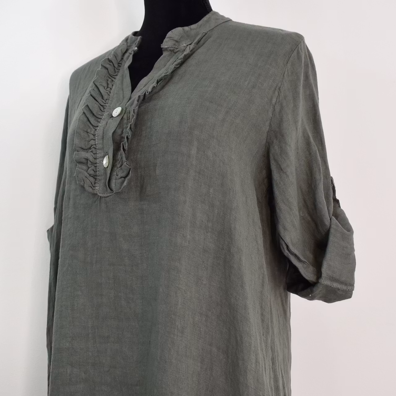 Det här är en vacker medellång linneklänning med liten ståkrage och krås framtill. Där är två pärlemorskimrande knappar fram samt en på den trekvartslånga ärmen så att den kan fästas upp. Tyget är glesvävt och något genomskinligt. Modellen har en bröstvidd på cirka 88cm, är 163cm lång och bär storlek S/M. Observera att förekomsten av streck, färgskiftningar etc. inte är defekter utan en del av det som gör tyget vackert.