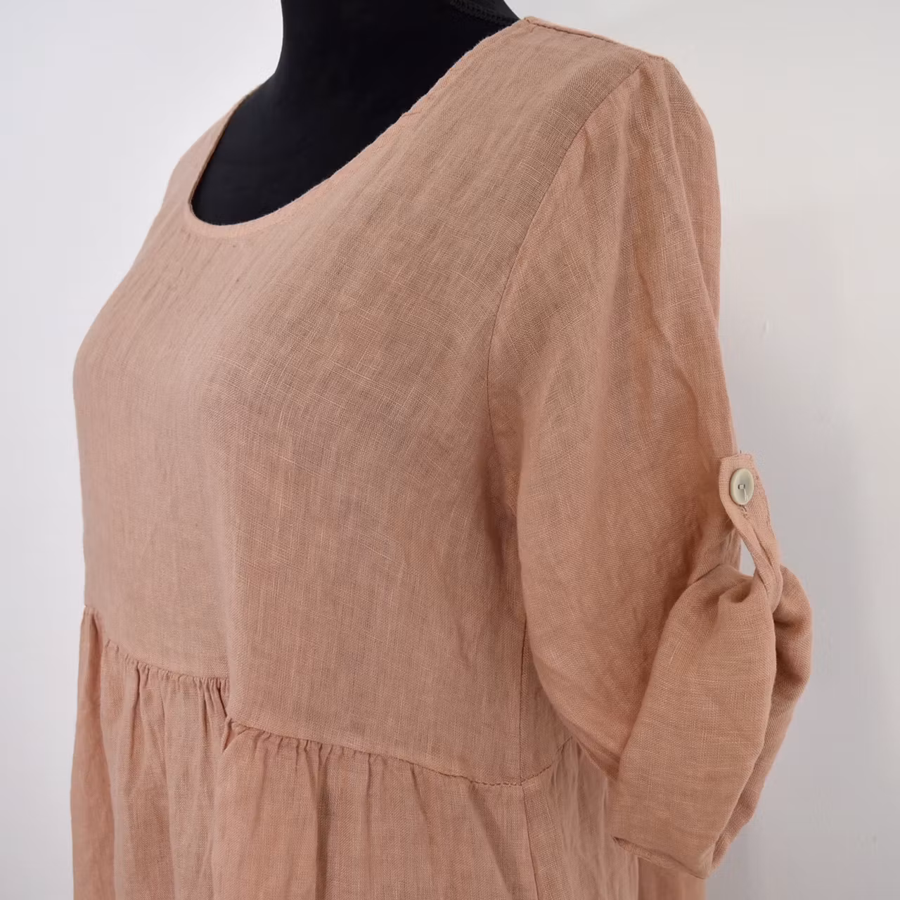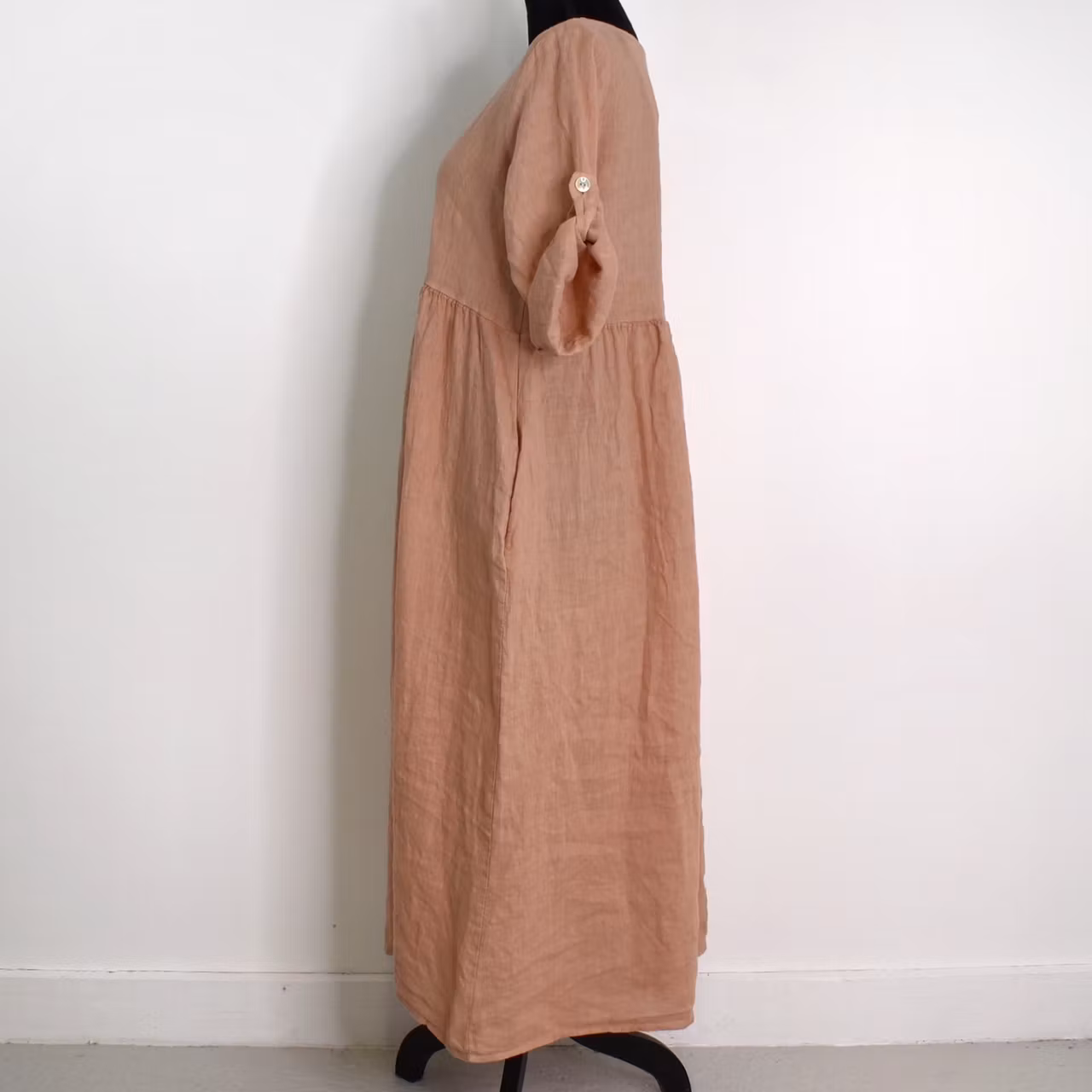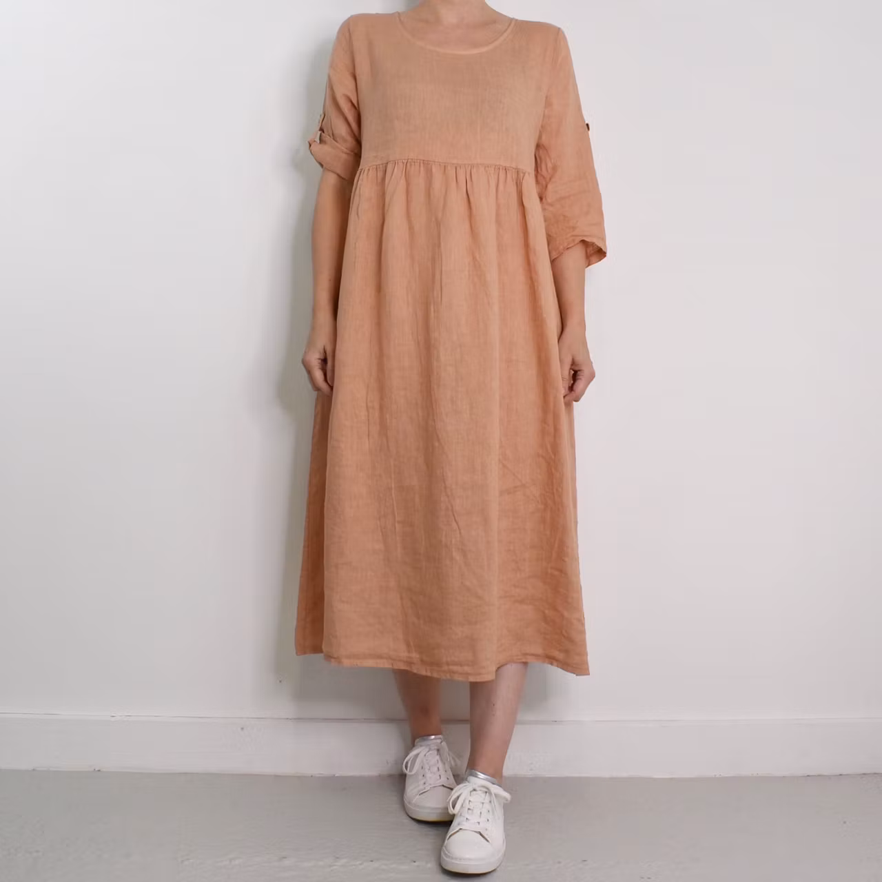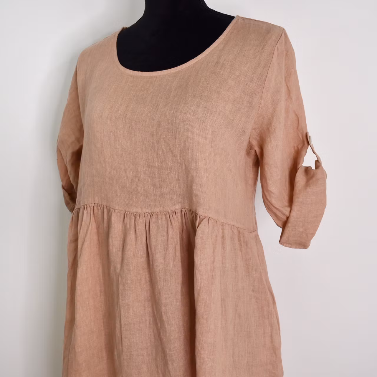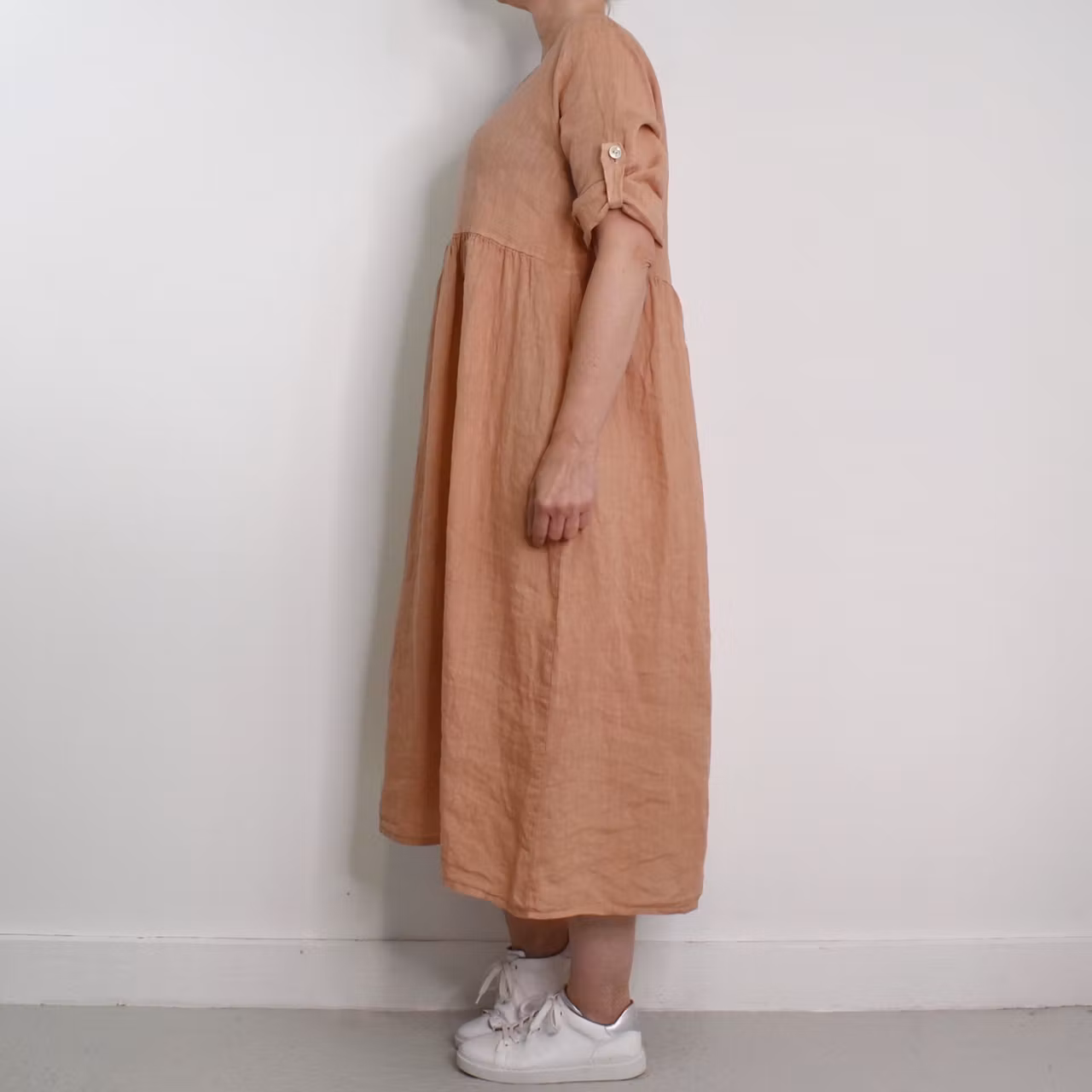 Det här är en underbar medellång klänning i tunt, mjukt linnetyg. Halsen är enkelt rundringad. Ärmen är smal och trekvartslång. Det går en söm runt midjan och från den är nederdelens tyg vackert rynkat. I sidorna finns gömda fickor. Materialet innehåller inte stretch och tyget är en aning genomskinligt. Observera att tyget, som halsringningen är förstärkt med på baksidan, kan vara synligt. Modellen har en bröstvidd på cirka 88cm, är 163cm lång och bär storlek S/M. Förekomsten av streck, färgskiftningar etc. inte är defekter utan en del av det som gör tyget vackert.
