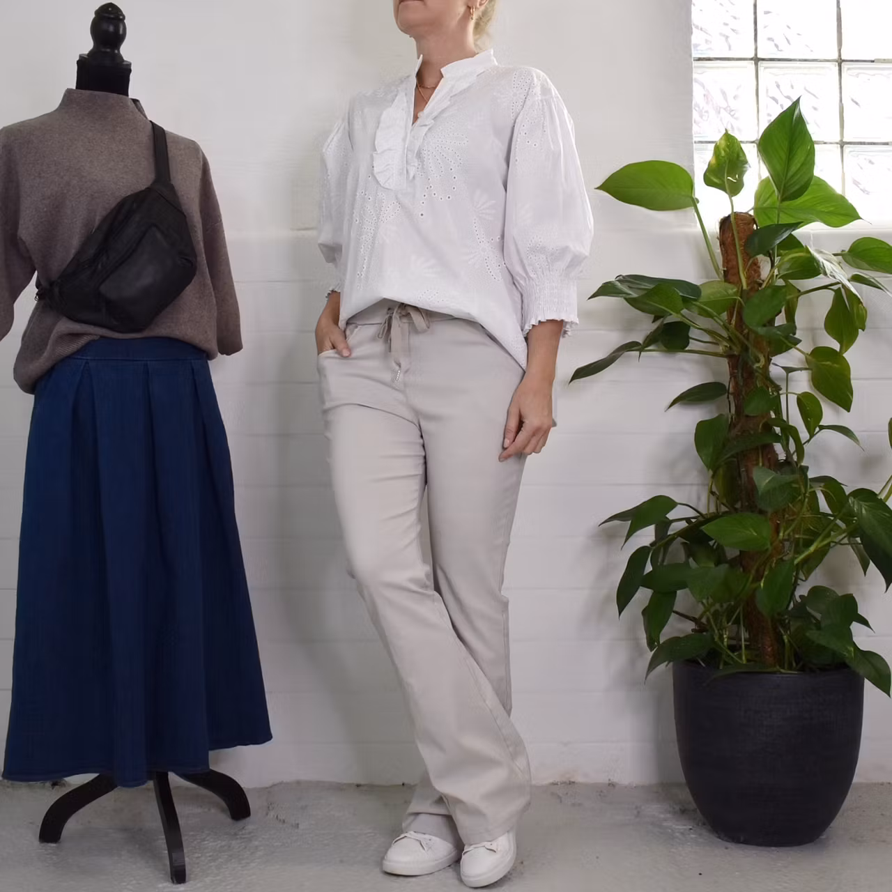 Bra att veta: Obs! Andrasortering! Blusens krage är snedsydd och det skiljer mellan höger och vänster sida (se detaljbild). Brodyr i tyget. Ståkrage, krås och knappar fram. Trekvartslång är med stretchig smock. Materialet är en aning stretchigt.