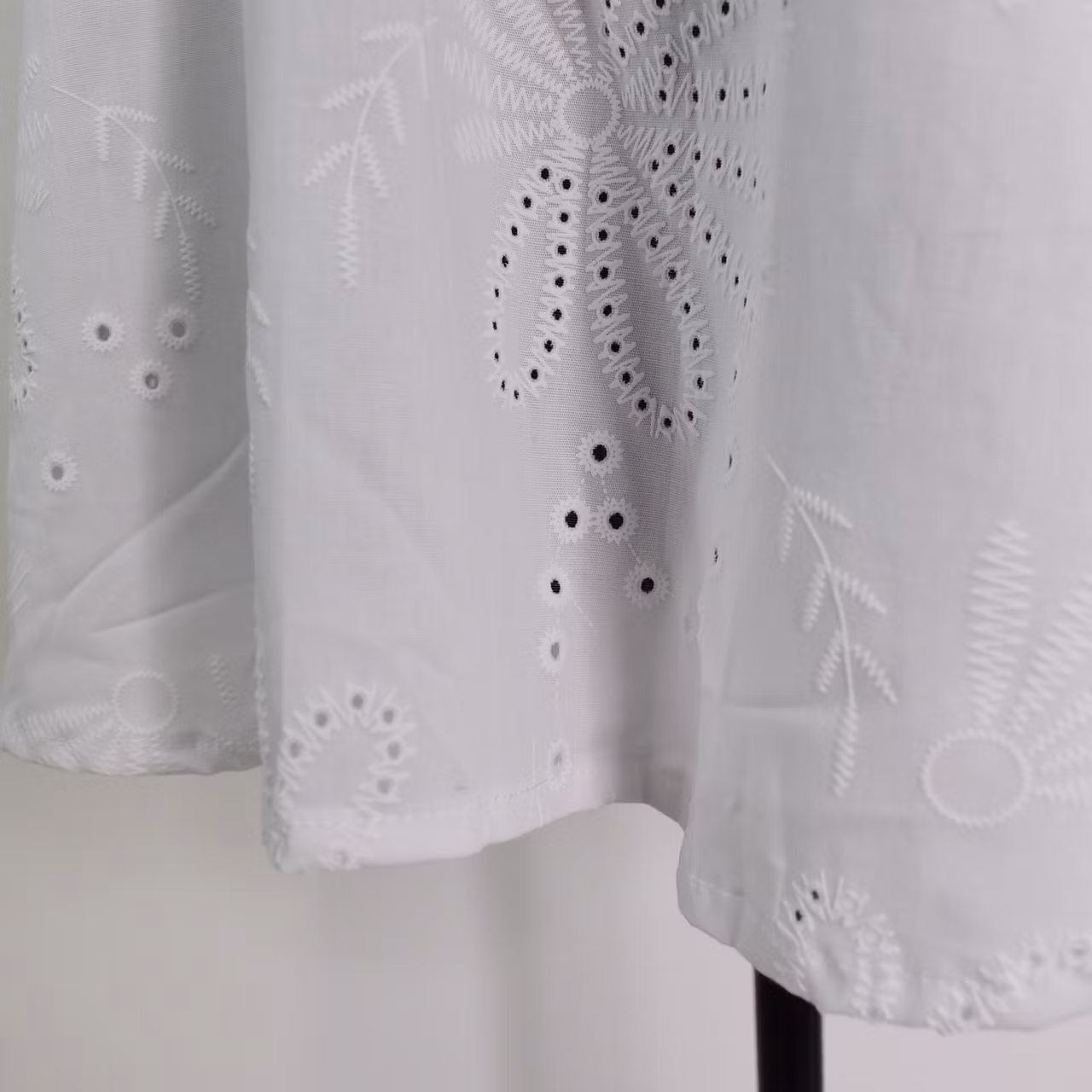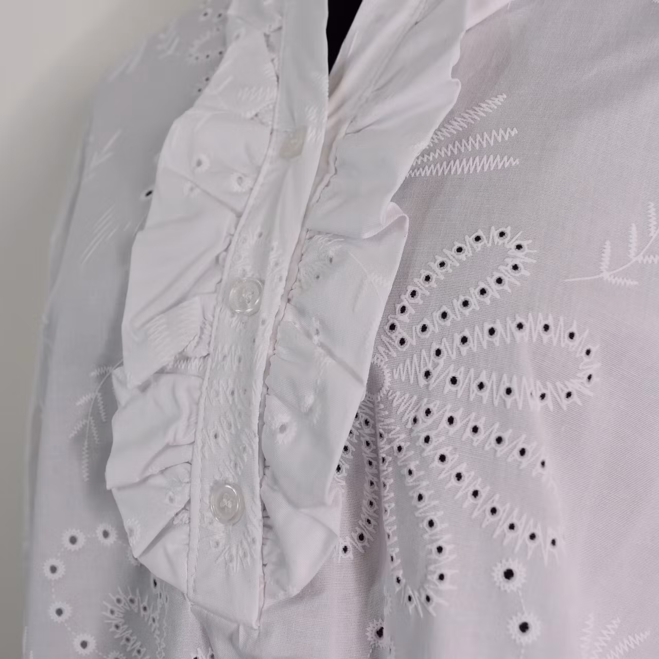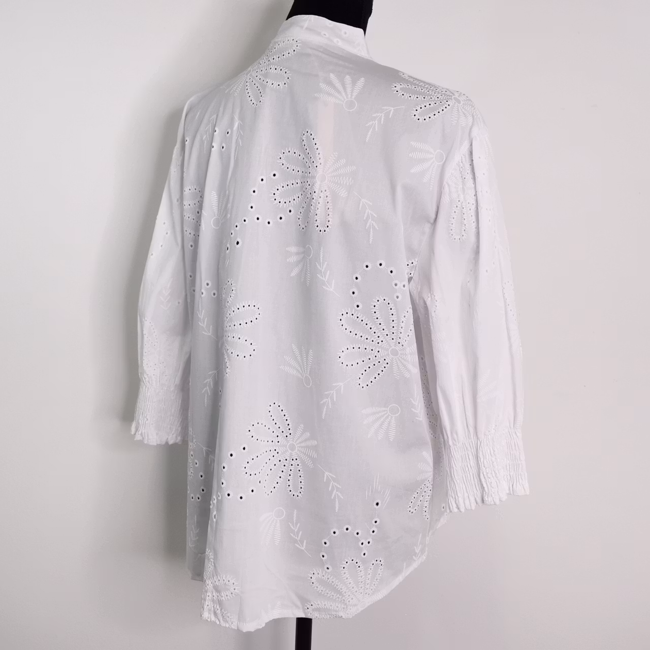 Det här är en söt skjorta med blommig brodyr (några med hål) och krås. Skjortan har ståkrage och två knappar fram samt en bred smock med resår i ärmslutet. Ärmen är trekvartslång. Tyget är en aning stretchigt. Modellen har en bröstvidd på cirka 88cm, är 163cm lång och bär S/M.