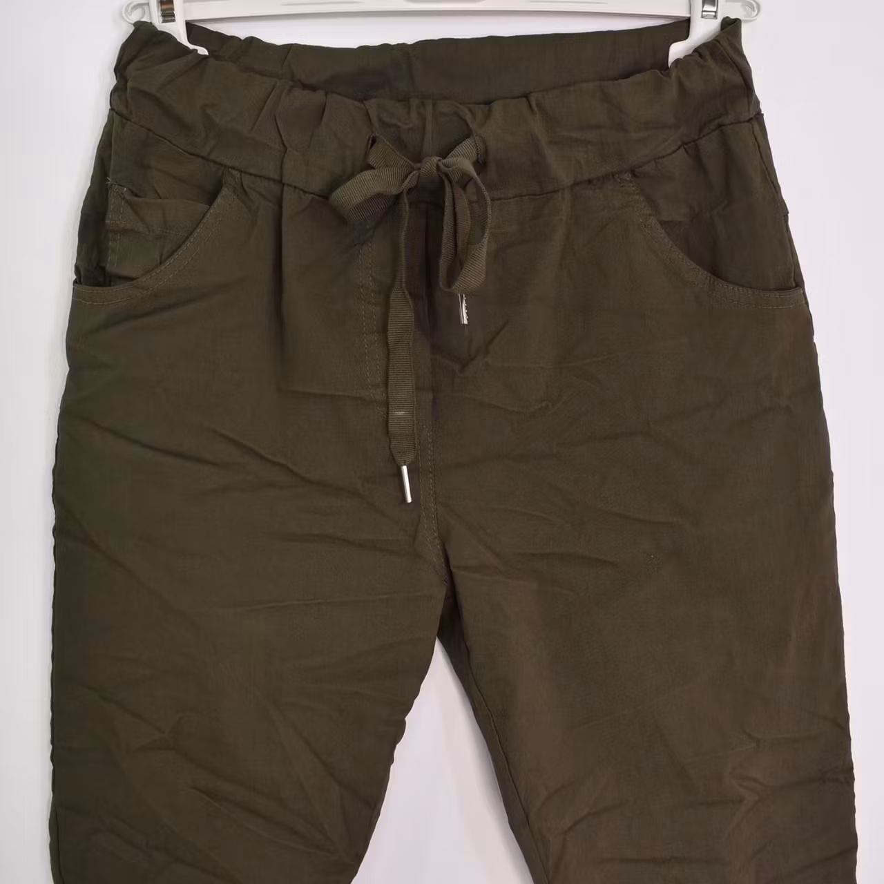 Det här är en bekväm, snygg och användbar komfortbyxa i femficks-modell med låga fickor bak. I midjan är där knytband och stretchig resår. Fejkgylf finns framtill. Midjan är mellanhög. Materialet är tunt, behagligt och väldigt stretchigt. Modellen har ett midjemått på cirka 78cm, en stussvidd på cirka 98cm, är 163cm lång och bär 36/38. Observera: Dessa byxor har en skrynkeleffekt som kan variera något och effekten försvinner vid tvätt så att tyget slätas ut. På grund av byxans speciella modell och det mycket stretchiga materialet kan måtten skilja sig en aning mellan olika exemplar. Vid infärgning krymper tyget olika mycket, vilket gör att byxan inte går att producera i exakta mått varje gång. Därför kan det förekomma en viss variation på cirka ±1–2 cm på alla mått. Det är också bra att känna till att tyget kan töja sig olika mycket både vid användning och tvätt (ha det i åtanke när du väljer storlek). Exakt hur det förändras går tyvärr inte att förutse, på grund av materialets speciella egenskaper och unika karaktär. Kulörer kan aldrig återskapas till exakt samma nyans och därför kan även färgen skilja lite mellan exemplar som är tillverkade vid olika tillfällen.