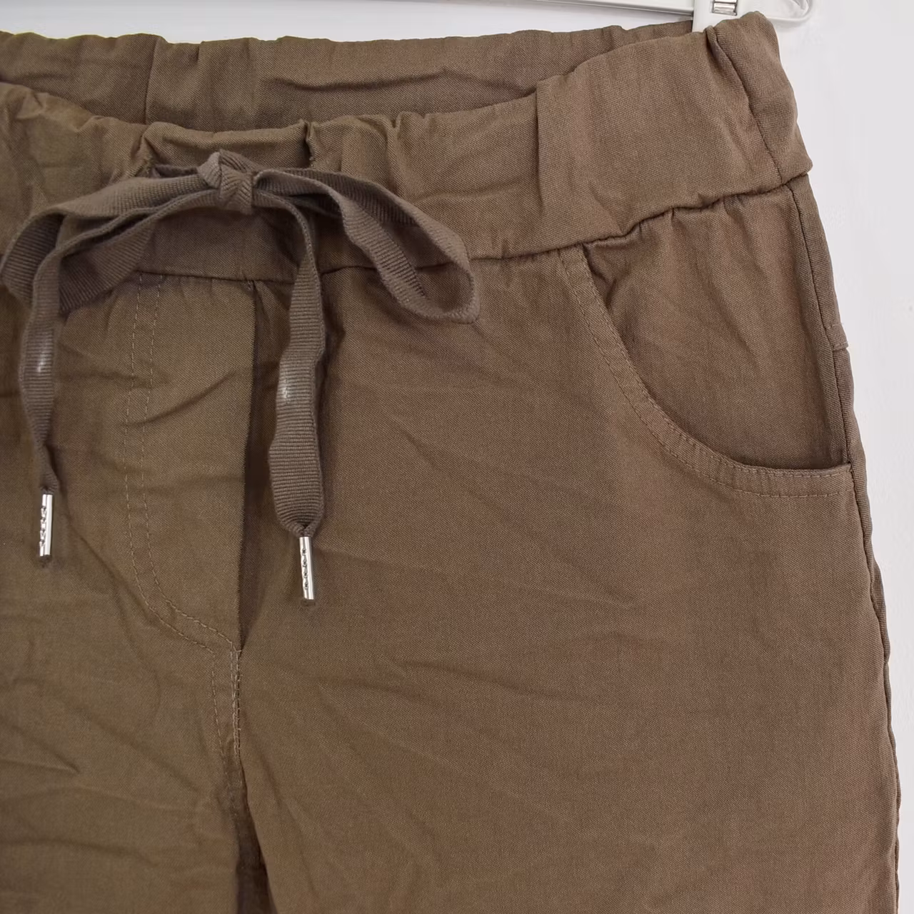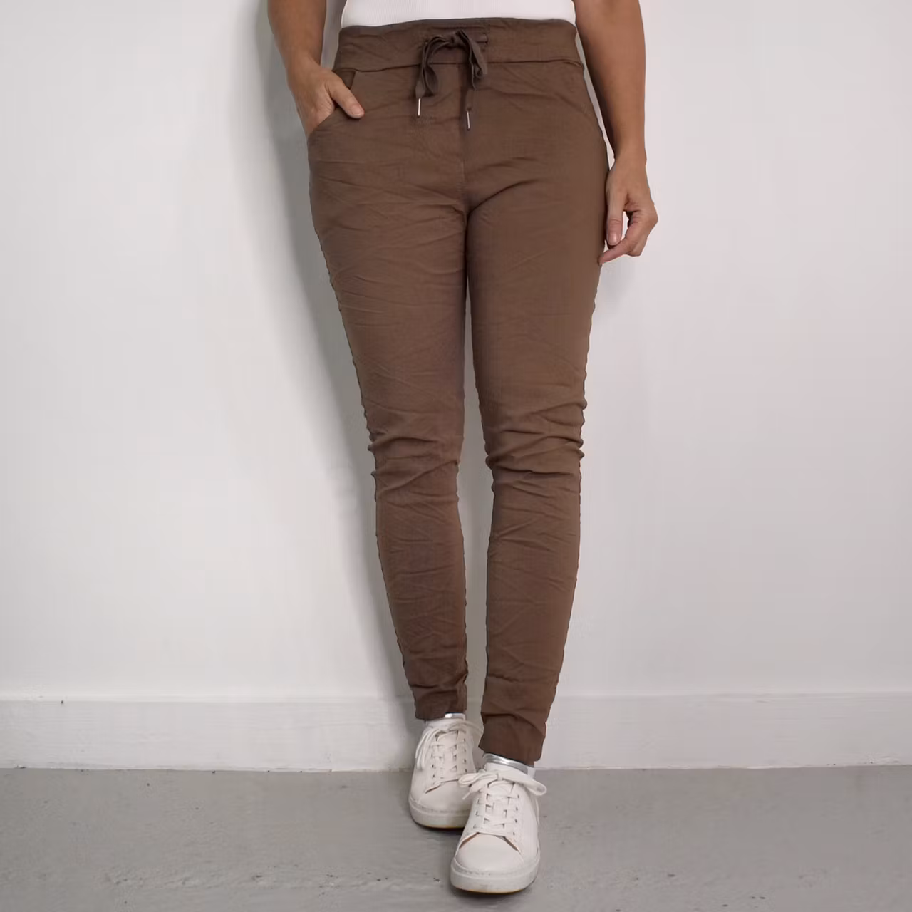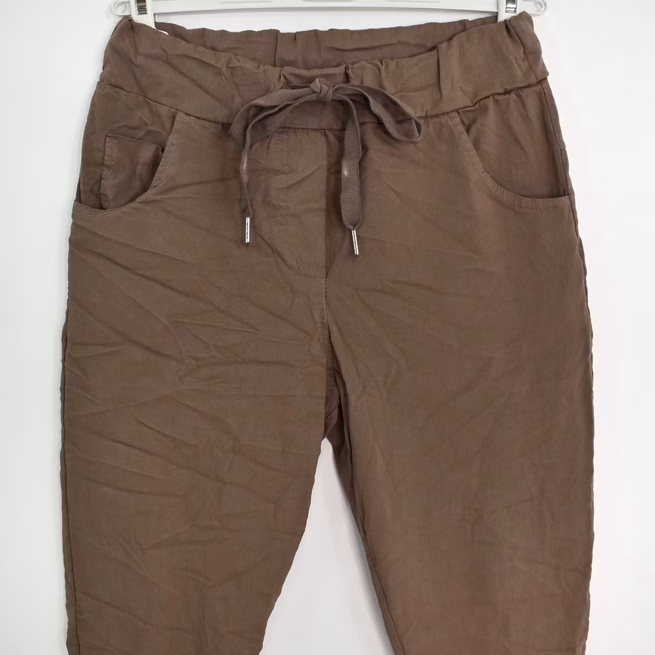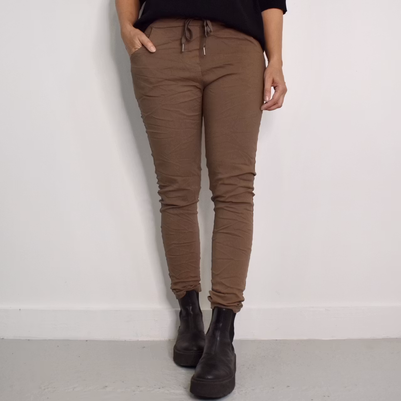 Det här är en bekväm, snygg och användbar komfortbyxa i femficks-modell med låga fickor bak. I midjan är där knytband och stretchig resår. Fejkgylf finns framtill. Midjan är mellanhög. Materialet är tunt, behagligt och väldigt stretchigt. Modellen har ett midjemått på cirka 78cm, en stussvidd på cirka 98cm, är 163cm lång och bär 36/38. Observera: Dessa byxor har en skrynkeleffekt som kan variera något och effekten försvinner vid tvätt så att tyget slätas ut. På grund av byxans speciella modell och det mycket stretchiga materialet kan måtten skilja sig en aning mellan olika exemplar. Vid infärgning krymper tyget olika mycket, vilket gör att byxan inte går att producera i exakta mått varje gång. Därför kan det förekomma en viss variation på cirka ±1–2 cm på alla mått. Det är också bra att känna till att tyget kan töja sig olika mycket både vid användning och tvätt (ha det i åtanke när du väljer storlek). Exakt hur det förändras går tyvärr inte att förutse, på grund av materialets speciella egenskaper och unika karaktär. Kulörer kan aldrig återskapas till exakt samma nyans och därför kan även färgen skilja lite mellan exemplar som är tillverkade vid olika tillfällen.