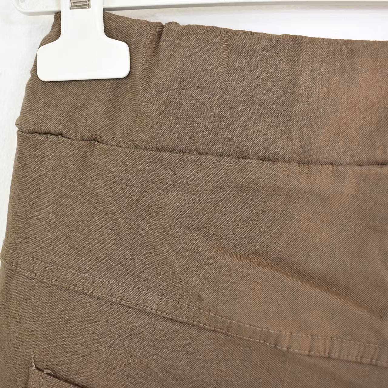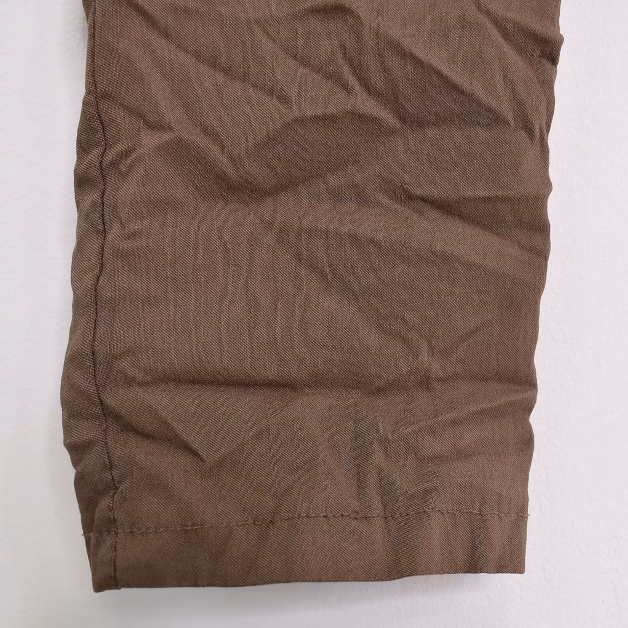 Byxans tyg har en viss skrynklad effekt (kan vara mer eller mindre) som försvinner vid tvätt. Tyget kan även töja sig 1–2 cm vid användning och tvätt, vilket är bra att ha i åtanke när du väljer storlek. Denna byxmodell är sydd med en något vriden bensöm.
