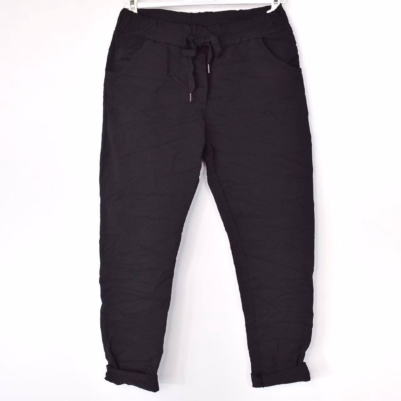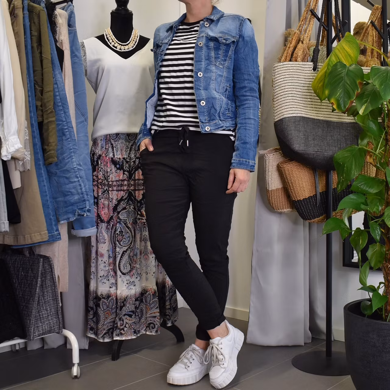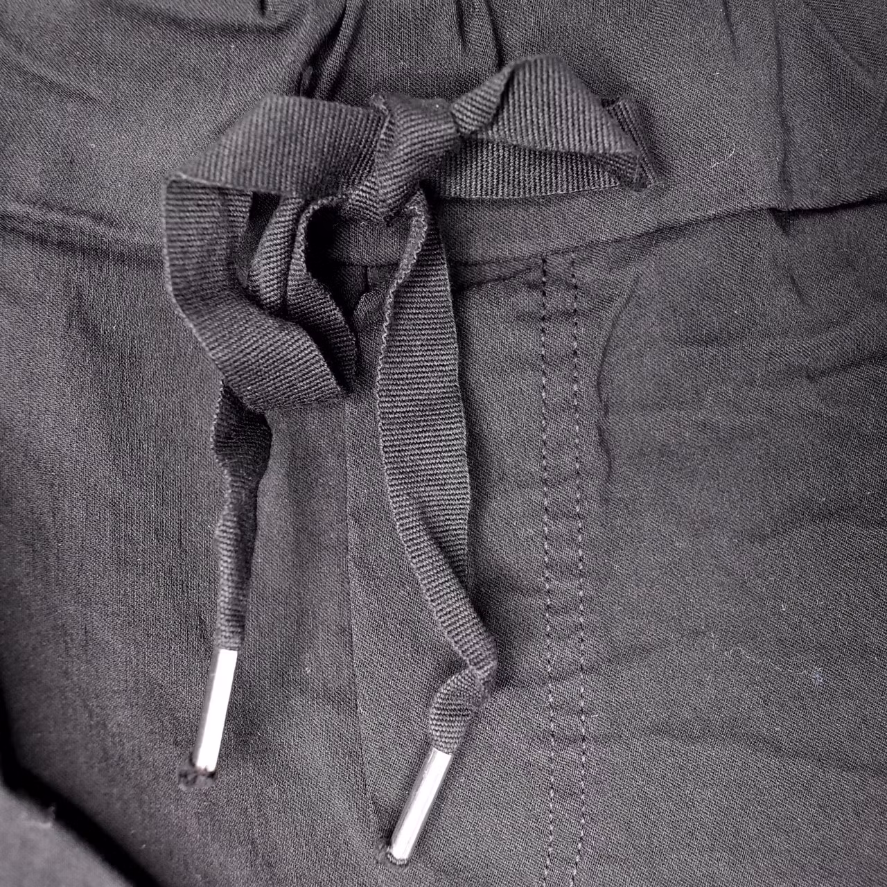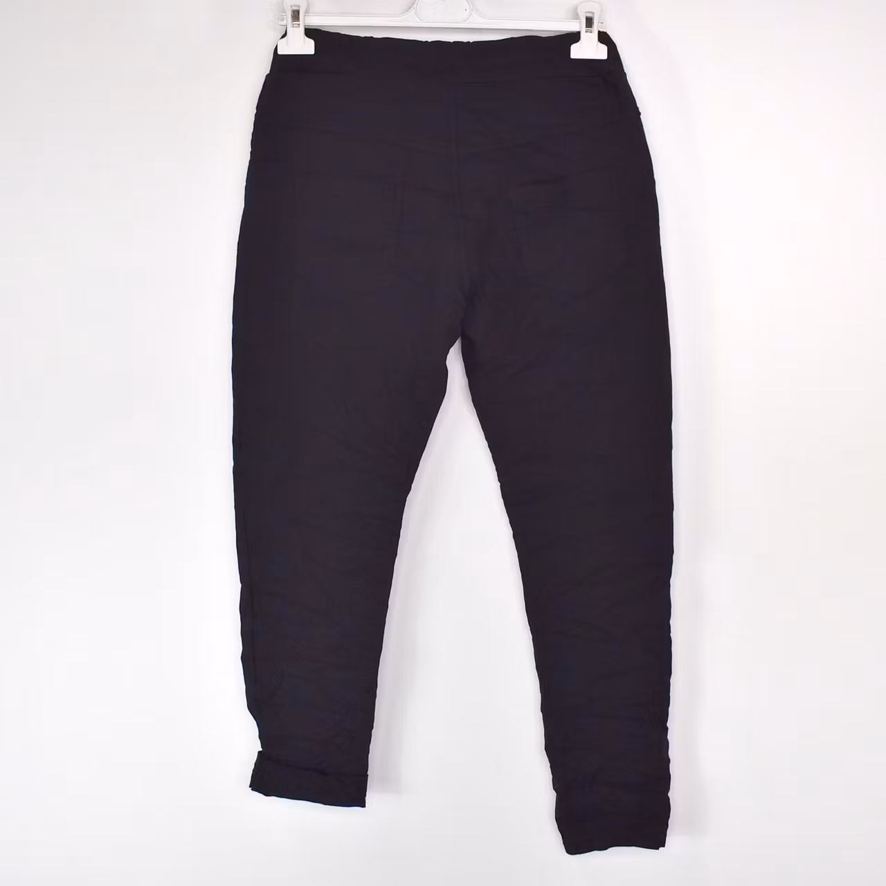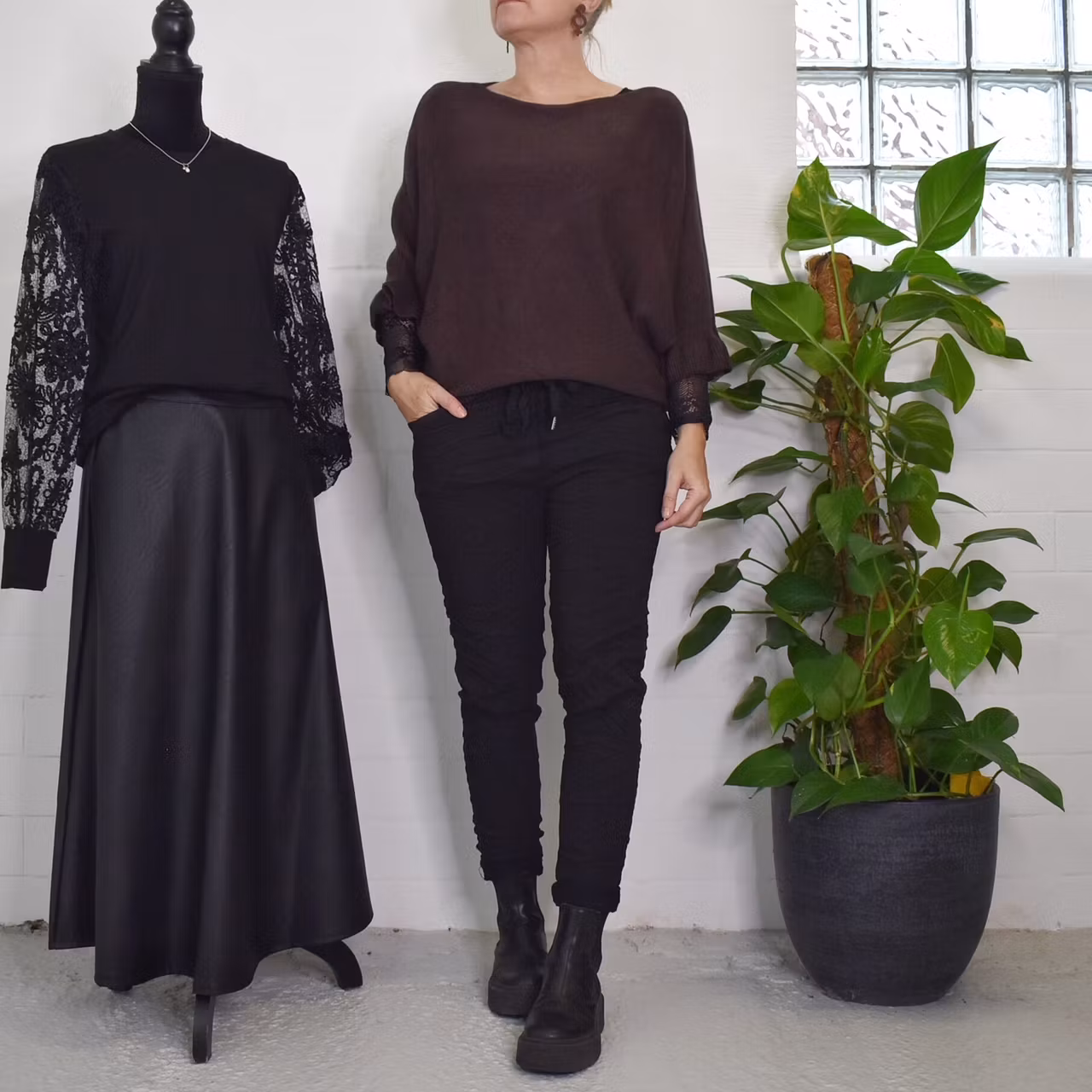 Det här är en bekväm, snygg och användbar komfortbyxa i femficks-modell med låga fickor bak. I midjan är där knytband och stretchig resår. Fejkgylf finns framtill. Midjan är mellanhög. Materialet är tunt, behagligt och väldigt stretchigt. Modellen har ett midjemått på cirka 76cm, en stussvidd på cirka 98cm, är 163cm lång och bär 36/38. Observera: Dessa byxor har en skrynkeleffekt som kan variera något och effekten försvinner vid tvätt så att tyget slätas ut. På grund av byxans speciella modell och det mycket stretchiga materialet kan måtten skilja sig en aning mellan olika exemplar. Vid infärgning krymper tyget olika mycket, vilket gör att byxan inte går att producera i exakta mått varje gång. Därför kan det förekomma en viss variation på cirka ±1–2 cm på alla mått. Det är också bra att känna till att tyget kan töja sig olika mycket både vid användning och tvätt (ha det i åtanke när du väljer storlek). Exakt hur det förändras går tyvärr inte att förutse, på grund av materialets speciella egenskaper och unika karaktär. Kulörer kan aldrig återskapas till exakt samma nyans och därför kan även färgen skilja lite mellan exemplar som är tillverkade vid olika tillfällen.