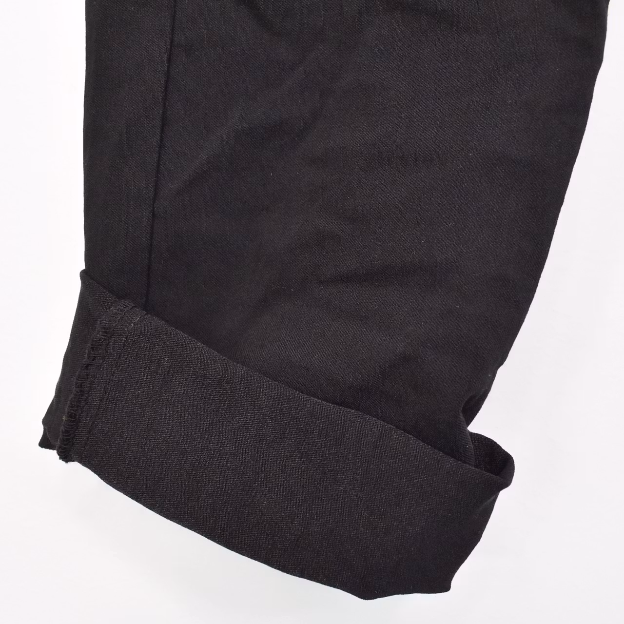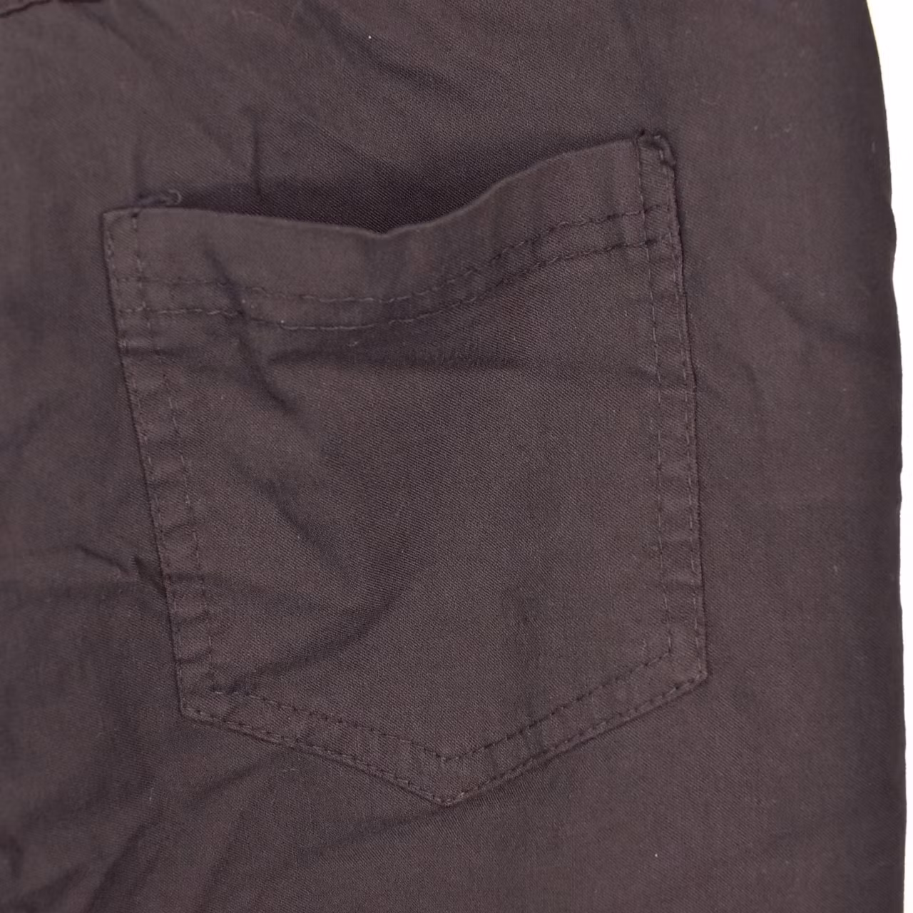 Byxans tyg har en viss skrynklad effekt (kan vara mer eller mindre) som försvinner vid tvätt. Tyget kan även töja sig 1–2 cm vid användning och tvätt, vilket är bra att ha i åtanke när du väljer storlek. Denna byxmodell är sydd med en något vriden bensöm.