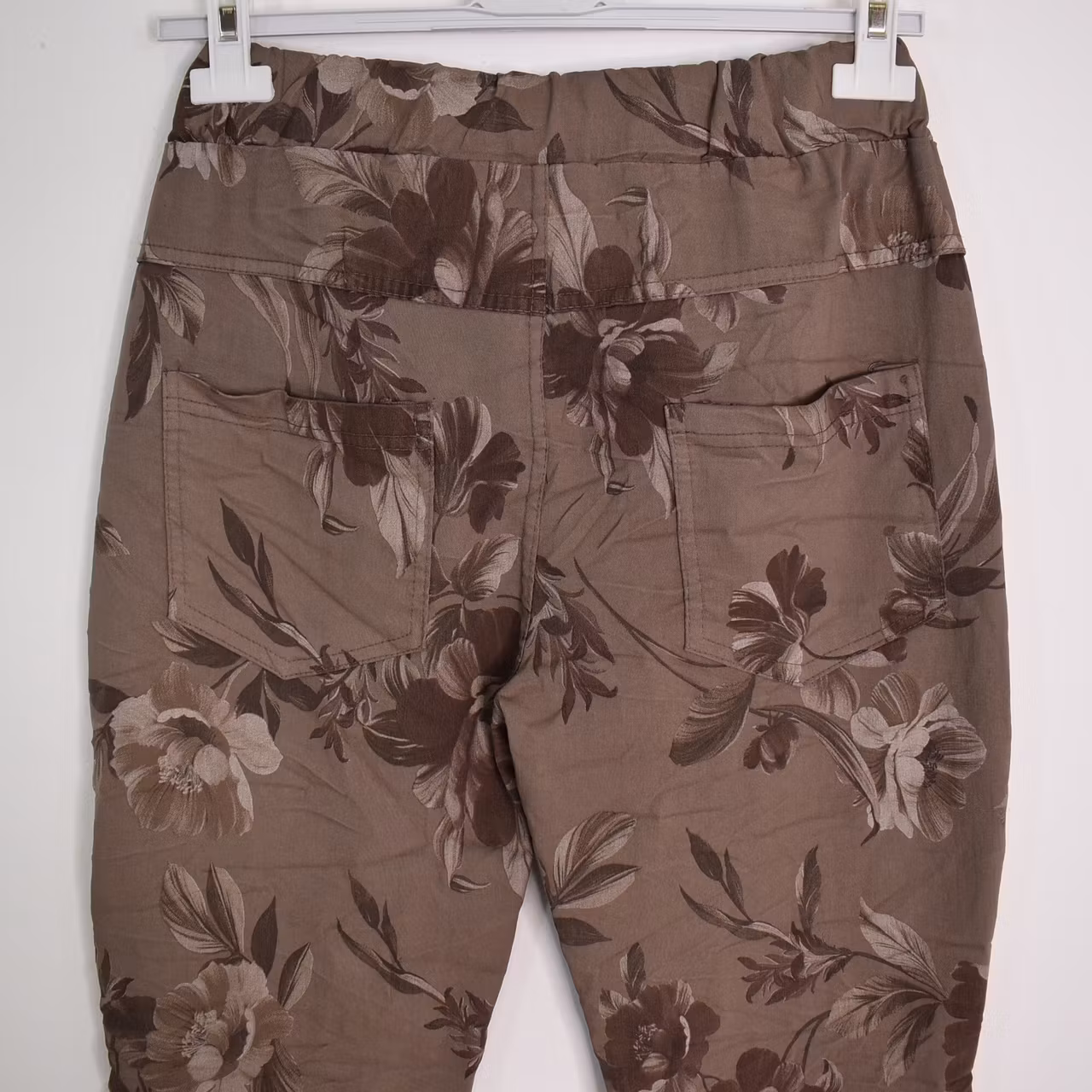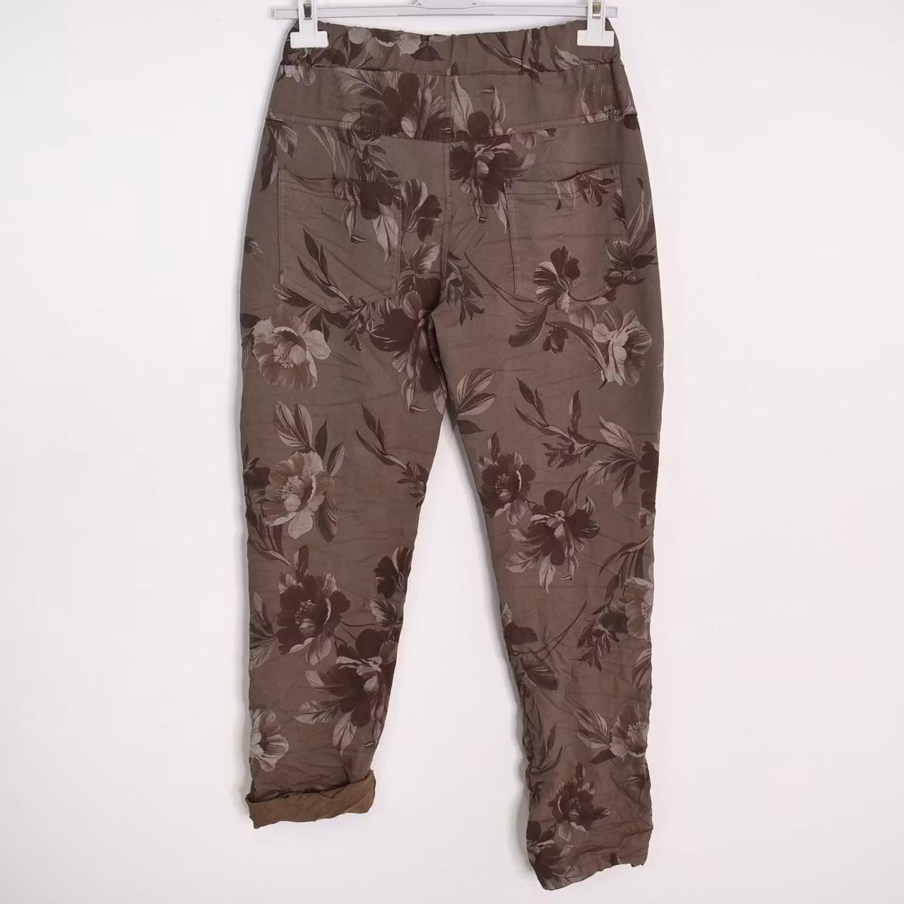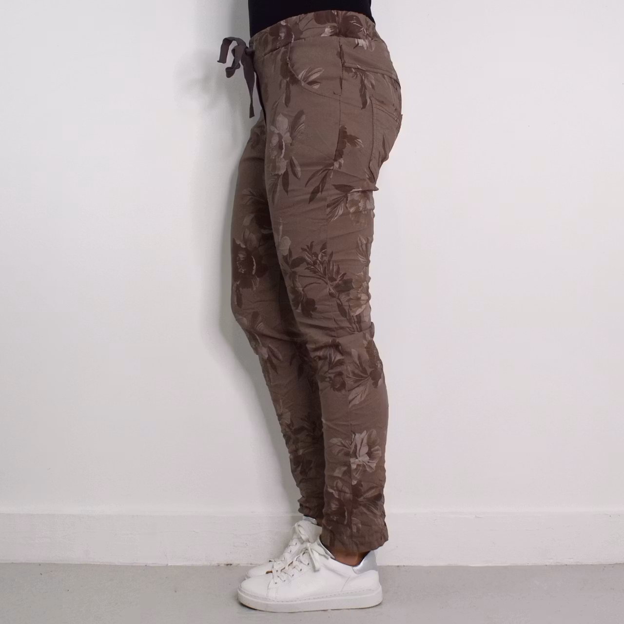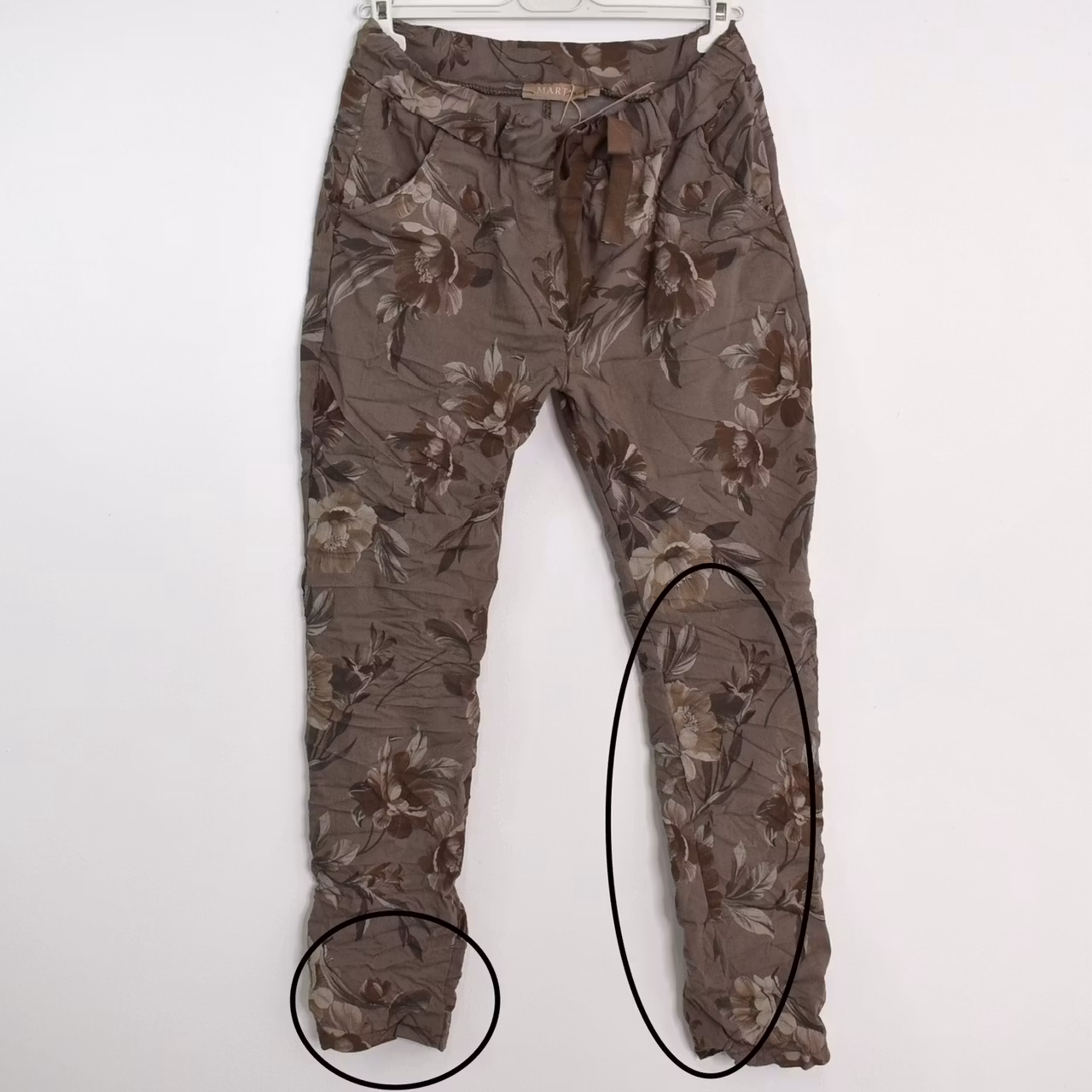 Det här är en skön komfortbyxa med snyggt blommigt mönster. Det finns knytband och stretchig resår i midjan samt fejkgylf fram. Byxan har fyra fickor (låga fickor bak). Modellen har ett midjemått på cirka 78cm, en stuss på cirka 99cm, är 163cm lång och bär storlek S/M. Observera: Dessa byxor har en lätt skrynkeleffekt som kan variera något och effekten försvinner vid tvätt. På grund av byxans speciella modell och material kan måtten skilja sig en aning mellan olika exemplar. Vid infärgning krymper tyget olika mycket, vilket gör att byxan inte går att producera i exakta mått varje gång. Därför kan det förekomma en viss variation på cirka ±1–2 cm. Det är också bra att känna till att tyget kan töja sig olika mycket både vid användning och tvätt. Exakt hur det förändras går tyvärr inte att förutse, på grund av materialets speciella egenskaper och unika karaktär.