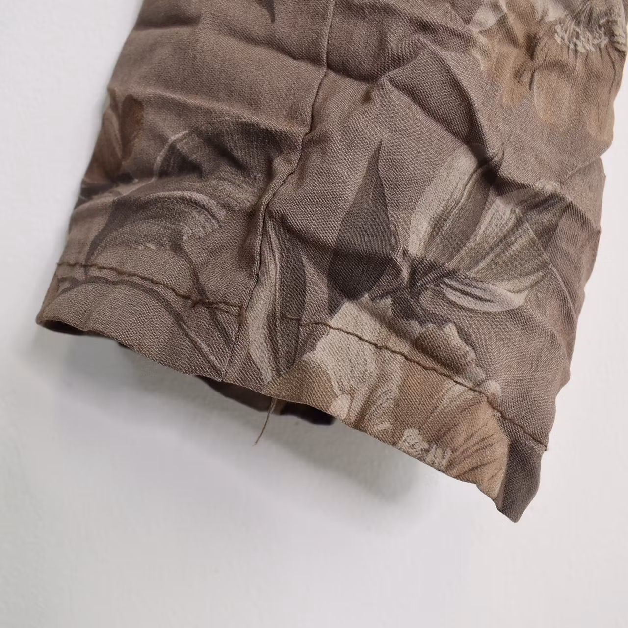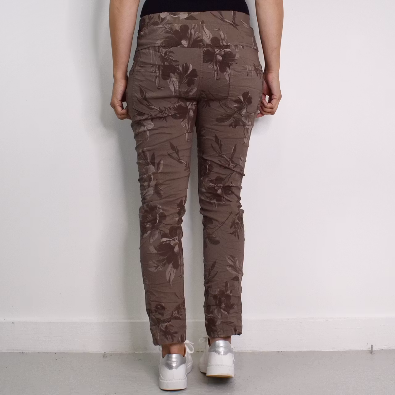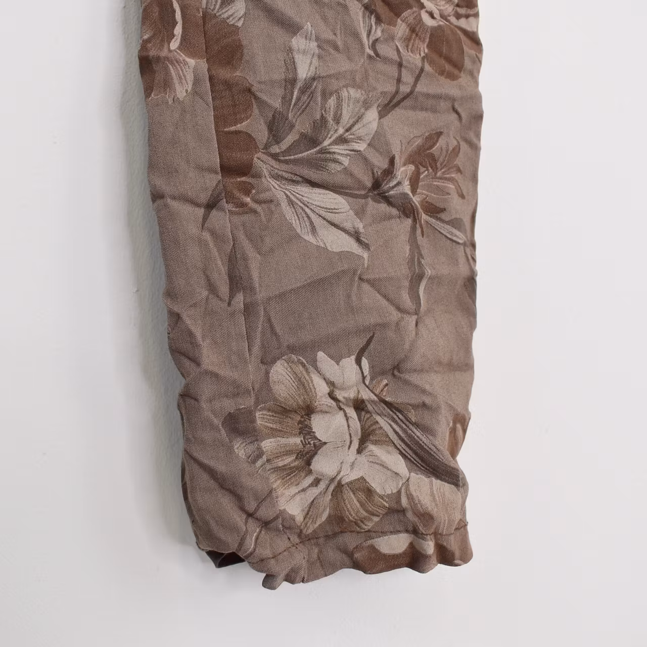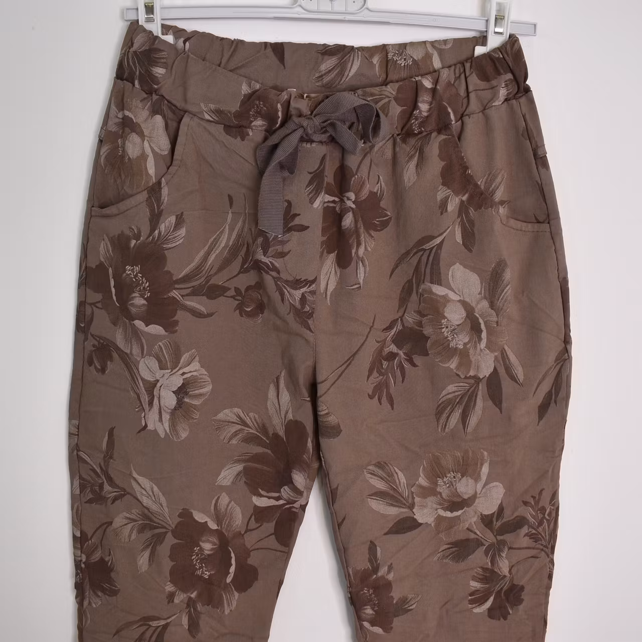 Det här är en skön komfortbyxa med snyggt blommigt mönster. Det finns knytband och stretchig resår i midjan samt fejkgylf fram. Byxan har fyra fickor (låga fickor bak). Modellen har ett midjemått på cirka 78cm, en stuss på cirka 99cm, är 163cm lång och bär storlek S/M. Observera: Dessa byxor har en lätt skrynkeleffekt som kan variera något och effekten försvinner vid tvätt. På grund av byxans speciella modell och material kan måtten skilja sig en aning mellan olika exemplar. Vid infärgning krymper tyget olika mycket, vilket gör att byxan inte går att producera i exakta mått varje gång. Därför kan det förekomma en viss variation på cirka ±1–2 cm. Det är också bra att känna till att tyget kan töja sig olika mycket både vid användning och tvätt. Exakt hur det förändras går tyvärr inte att förutse, på grund av materialets speciella egenskaper och unika karaktär.
