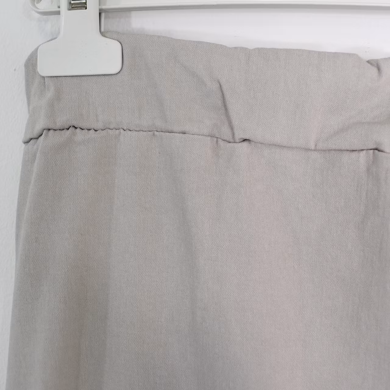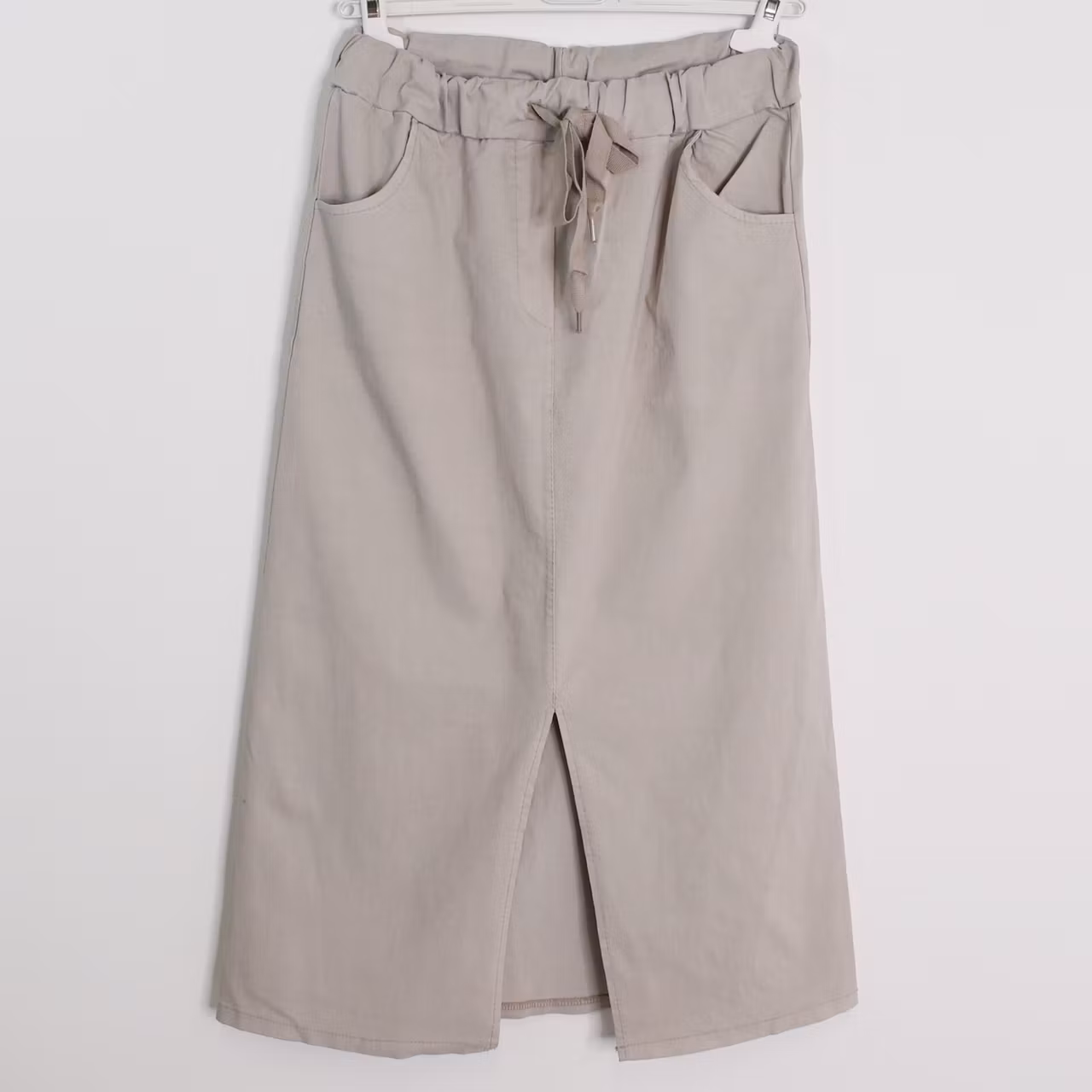 Det här är en skön halvlång stretchig kjol med slits längst ner framtill. Kjolen har resår och knytband i midjan och fickor i sidan. Passformen är ganska snäv. Materialet är stretchigt. Modellen har en midjevidd på cirka 79cm, en stussvid på cirka 99cm och är 163cm lång.