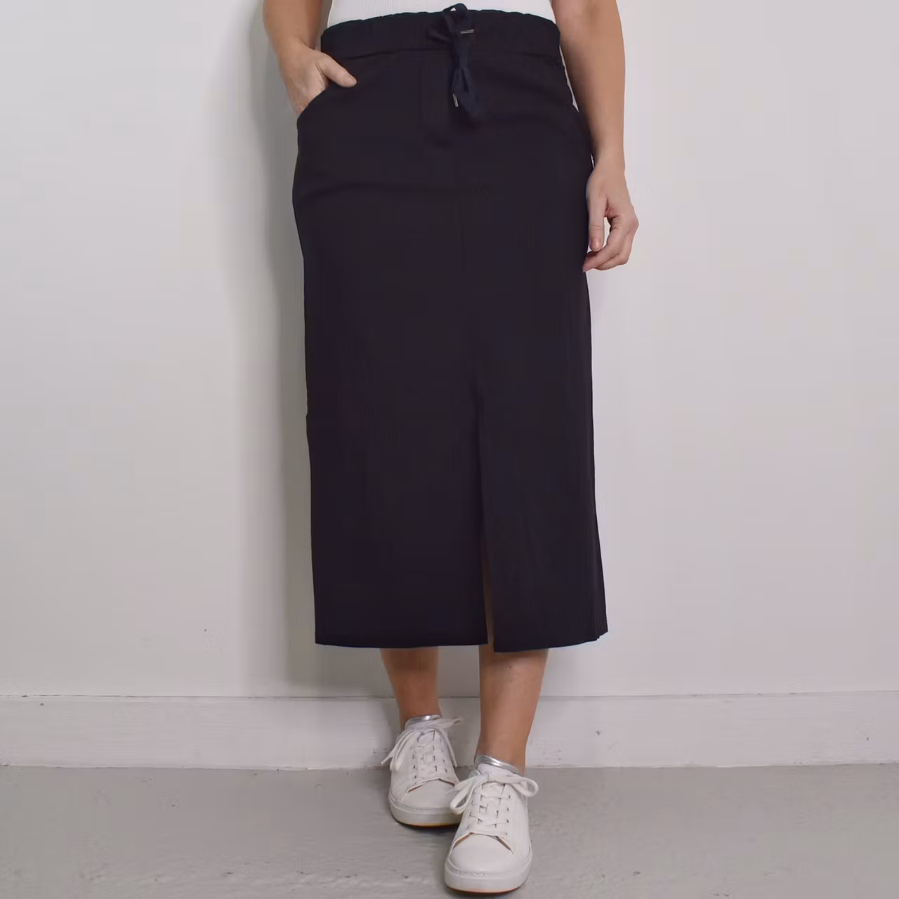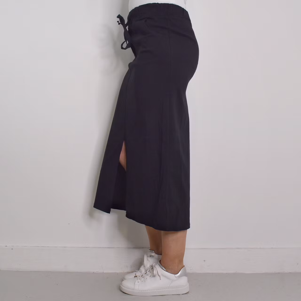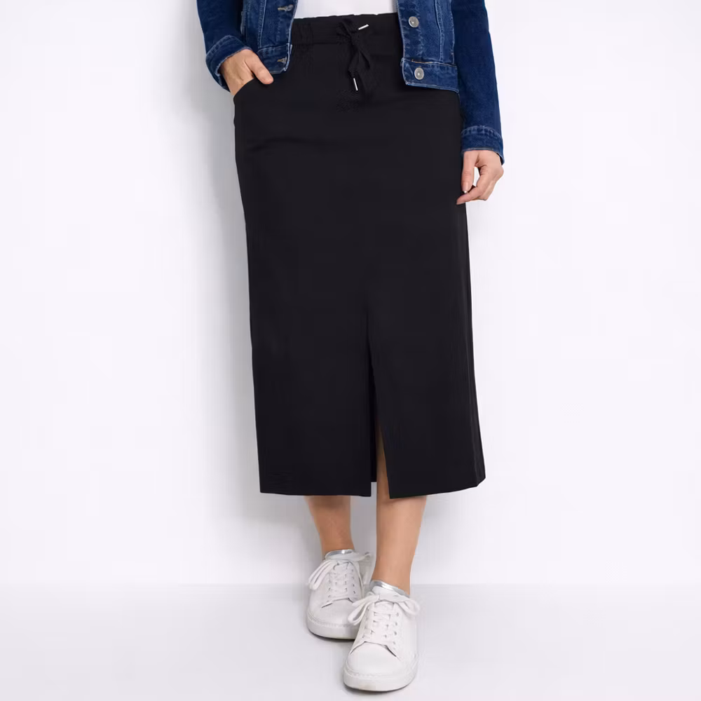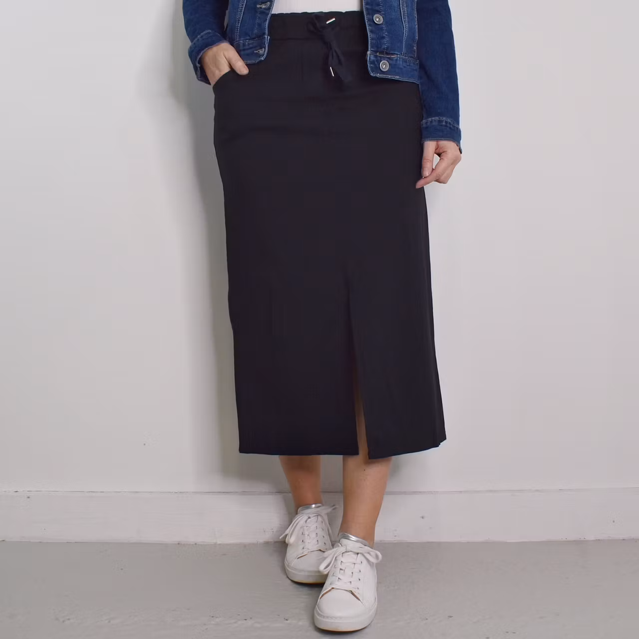 Det här är en skön halvlång stretchig kjol med slits längst ner framtill. Kjolen har resår och knytband i midjan och fickor i sidan. Passformen är ganska snäv. Materialet är stretchigt. Modellen har en midjevidd på cirka 79cm, en stussvid på cirka 99cm och är 163cm lång.