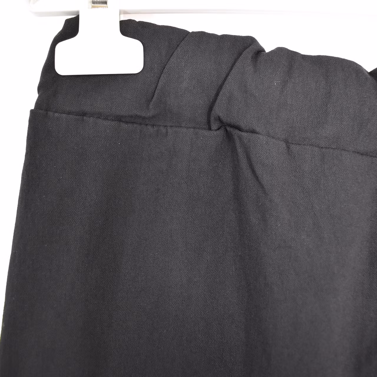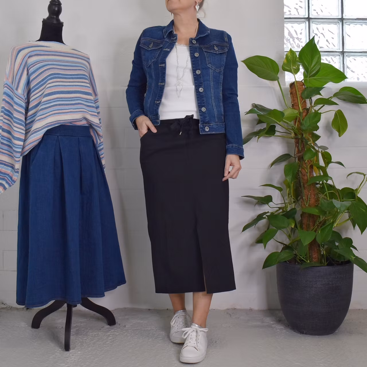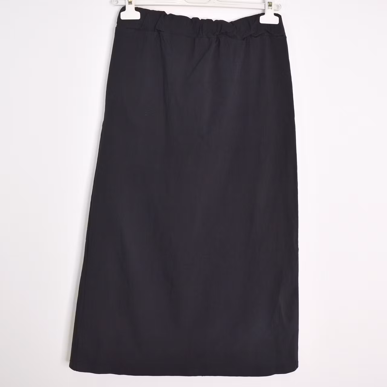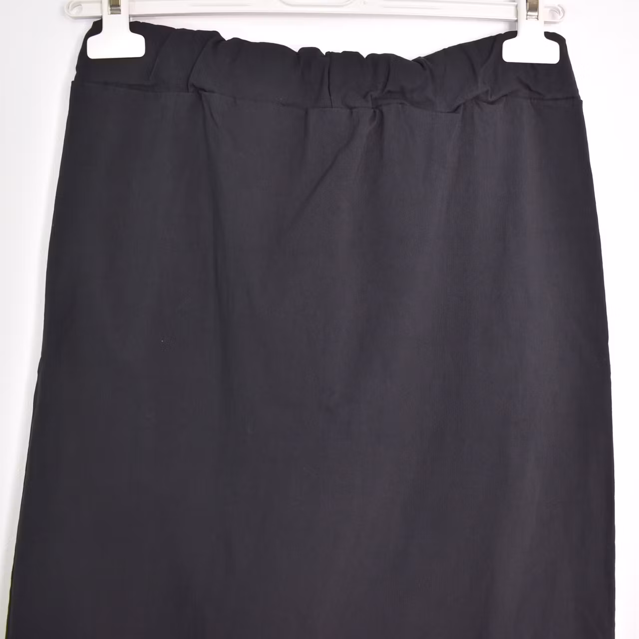 Det här är en skön halvlång stretchig kjol med slits längst ner framtill. Kjolen har resår och knytband i midjan och fickor i sidan. Passformen är ganska snäv. Materialet är stretchigt. Modellen har en midjevidd på cirka 79cm, en stussvid på cirka 99cm och är 163cm lång.