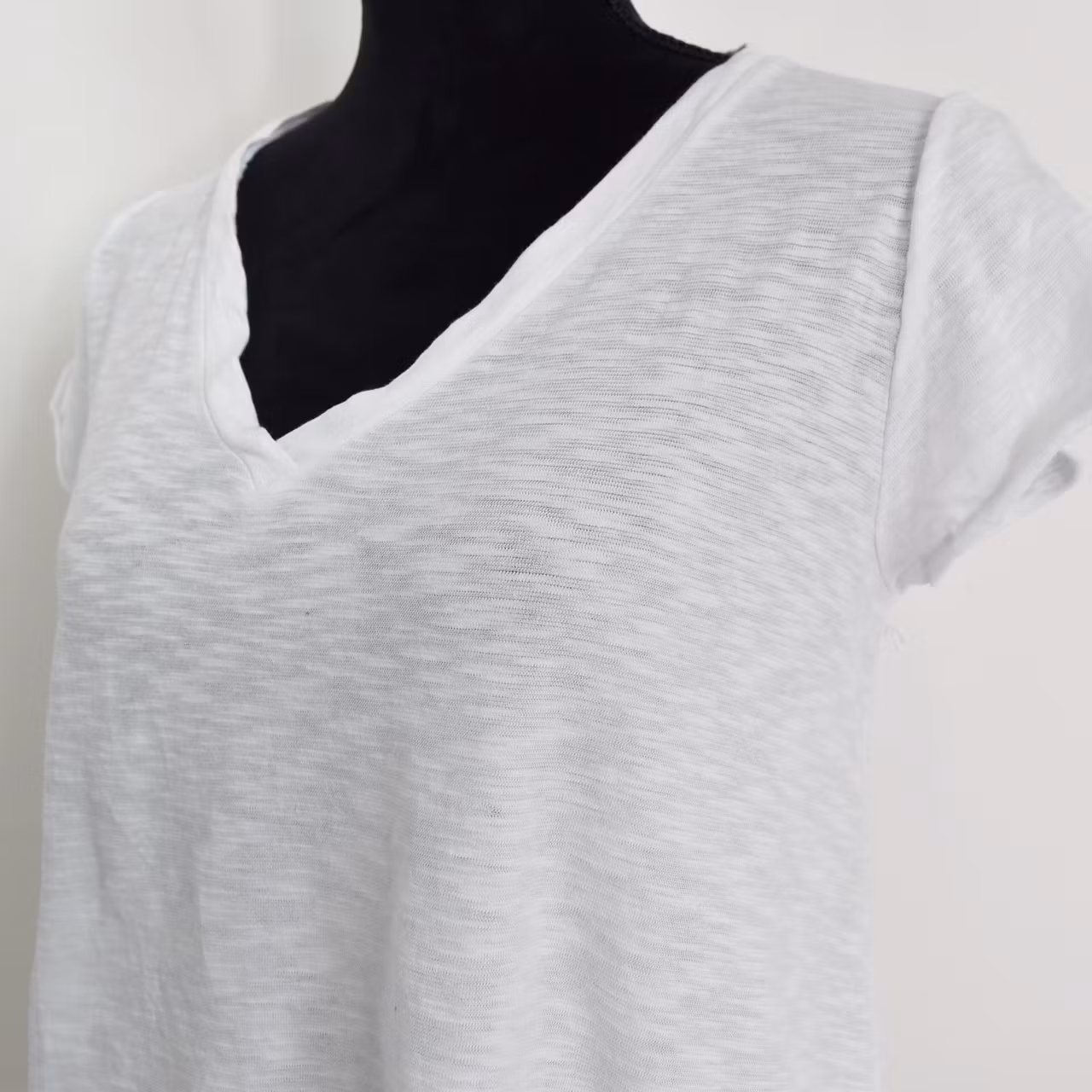 Det här är en enkel, snygg och skön v-ringad t-shirt i en kort a-formad modell. Färgen är kraftigt melerad och att tyget är tunt. Materialet innehåller ingen stretch men är följsamt och töjbart. Observera att alla exemplar har en unik melering och ser därför inte ut som den på bilderna. Modellen har en bröstvidd på cirka 88cm och är 163cm lång.