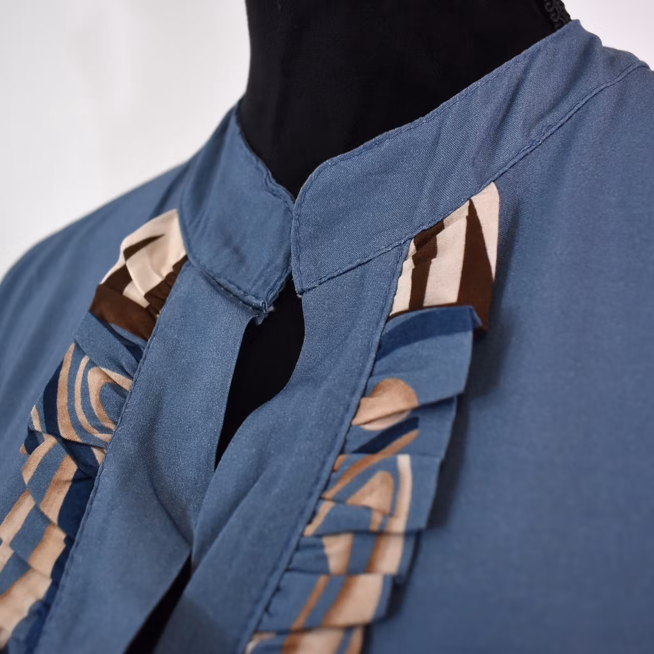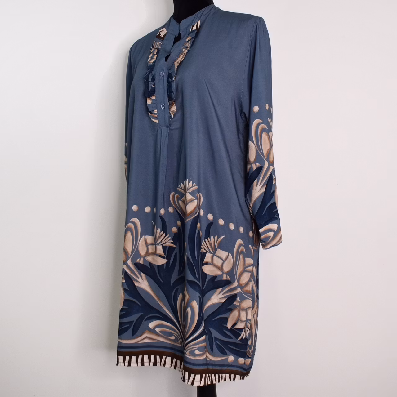 Det här är en fin tunika i tunn, mjuk viskos och läckert mönster. Tunikan har liten ståkrage och krås med knappar fram. I ärmslutet finns en slits. På ryggen är där ett dekorativt sprund. Tyget innehåller inte stretch. Modellen har en bröstvidd på cirka 88cm, är 163cm lång och bär S/M.