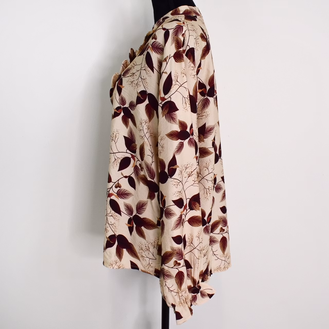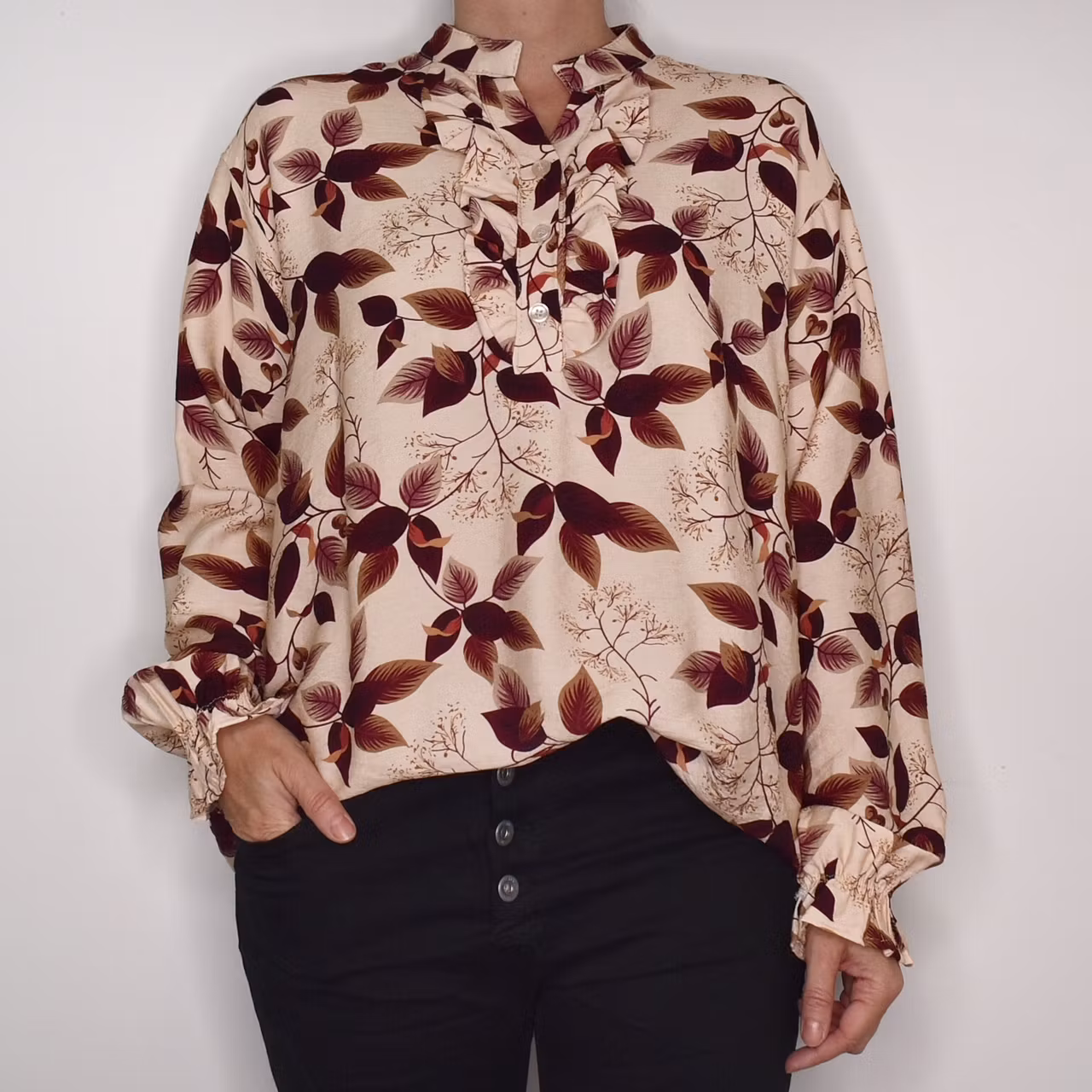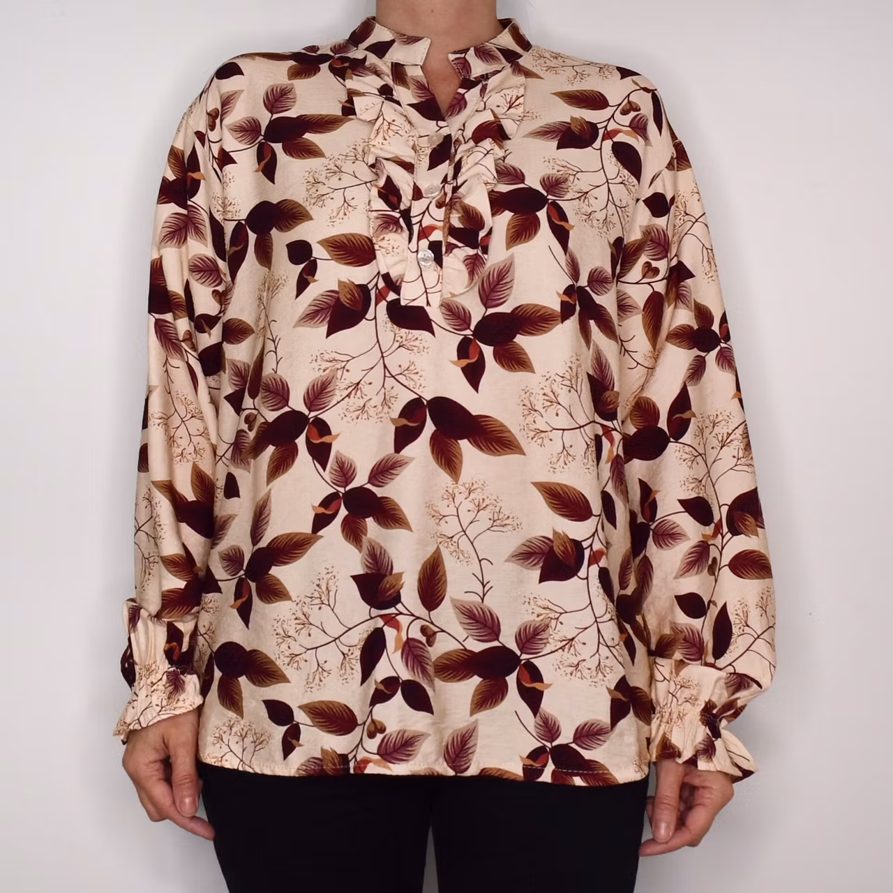 Det här är en underbar blus med vackert mönster och härligt tyg. Blusen har liten ståkrage, knappar och krås fram samt stretchig volangresår i ärmslutet. Materialet innehåller inte stretch. Modellen har en bröstvidd på cirka 88cm, är 163cm lång och bär S/M.