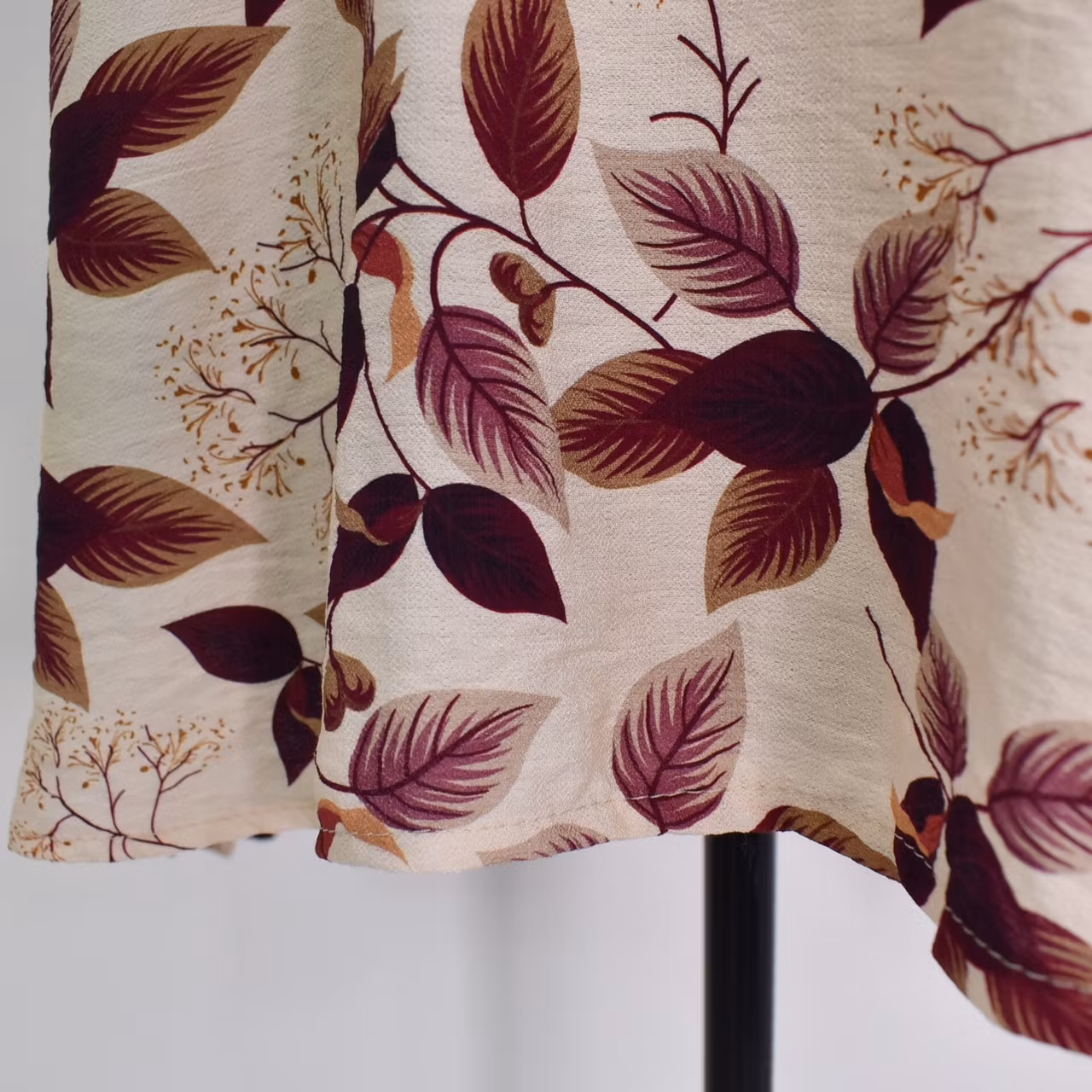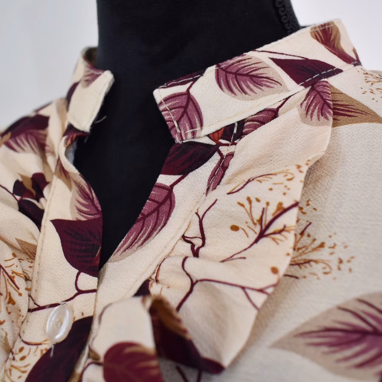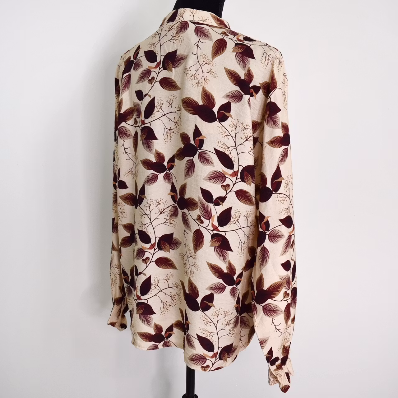Det här är en underbar blus med vackert mönster och härligt tyg. Blusen har liten ståkrage, knappar och krås fram samt stretchig volangresår i ärmslutet. Materialet innehåller inte stretch. Modellen har en bröstvidd på cirka 88cm, är 163cm lång och bär S/M.