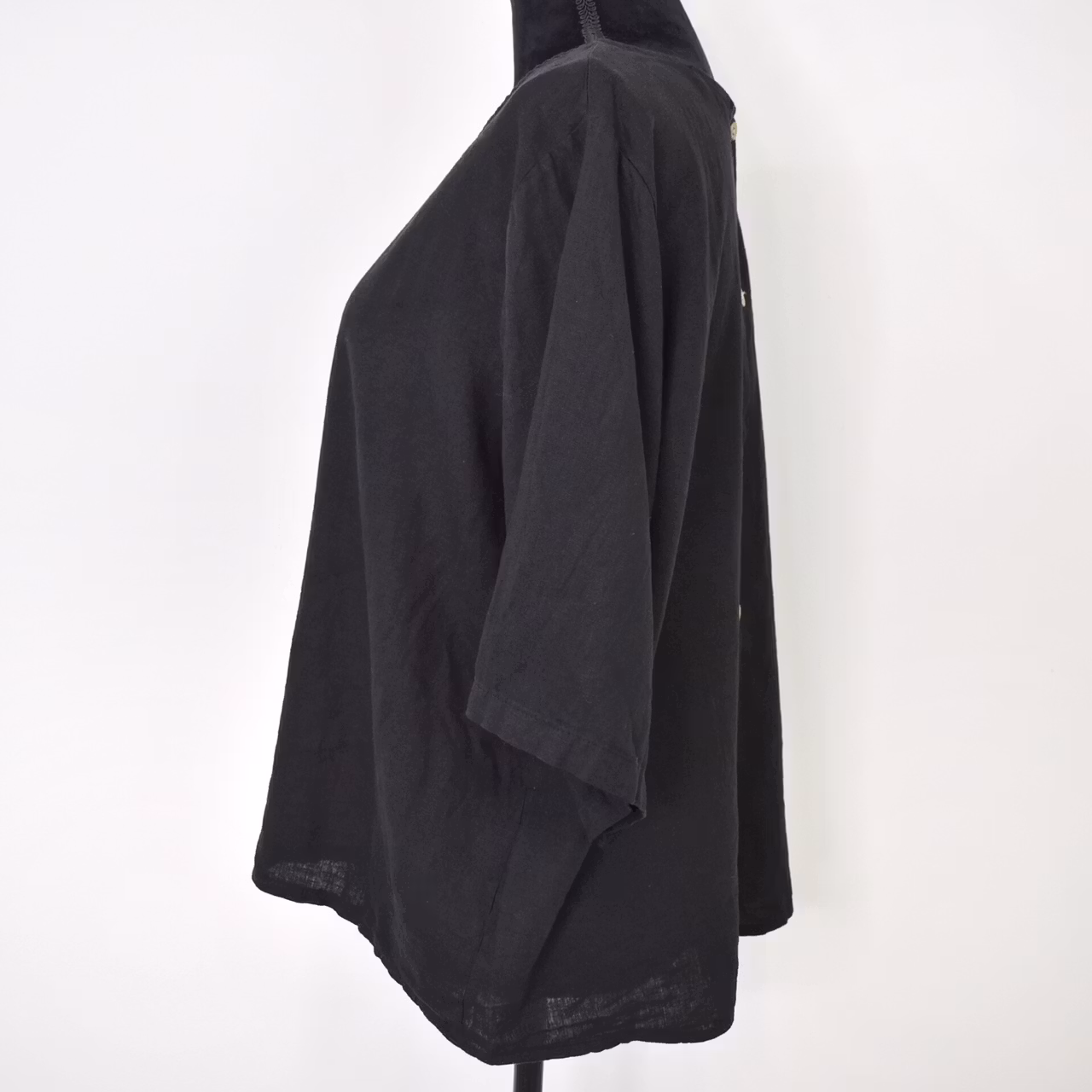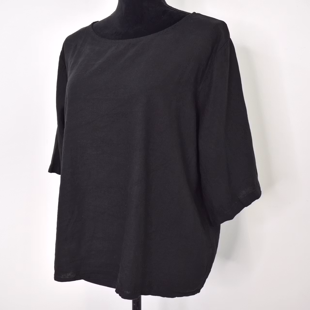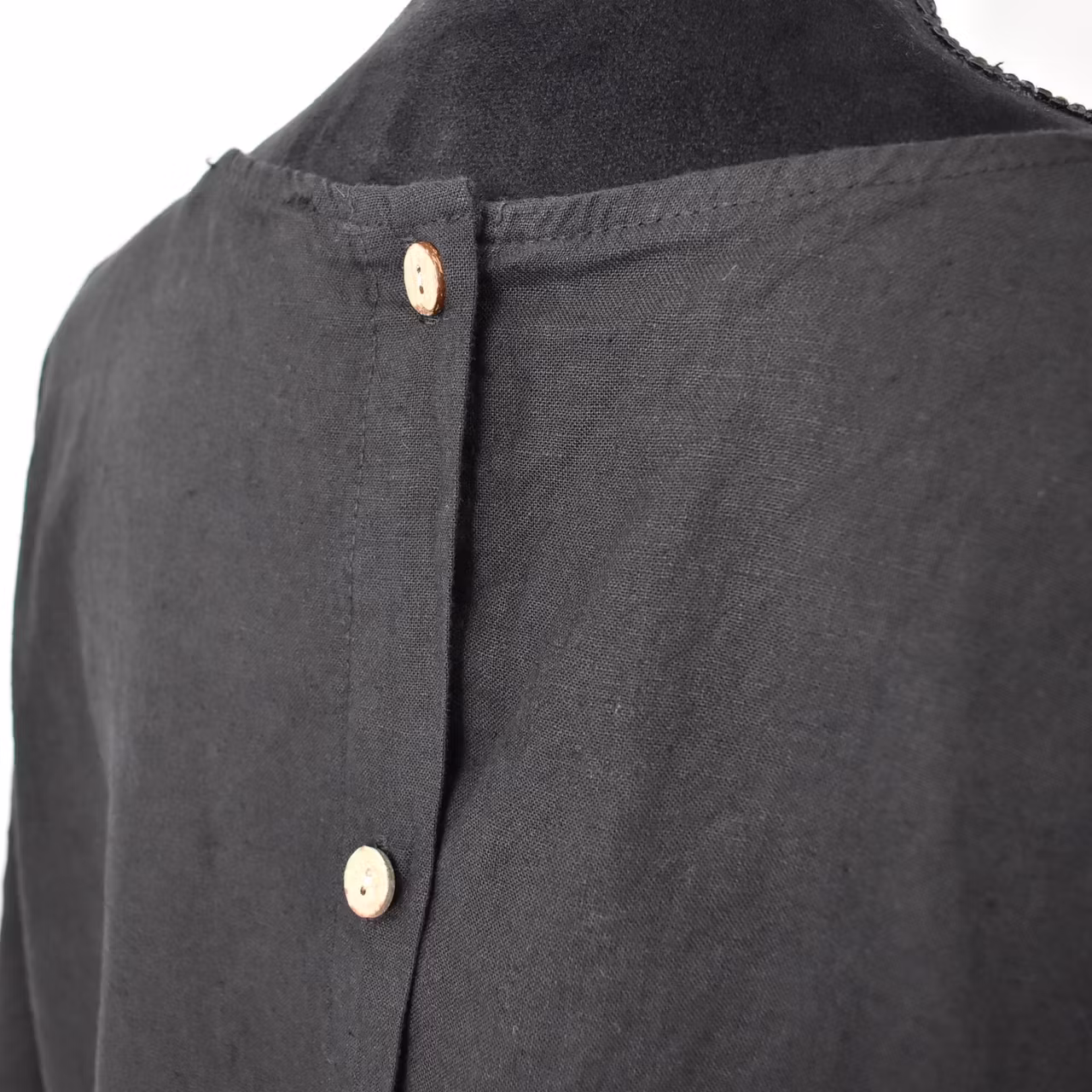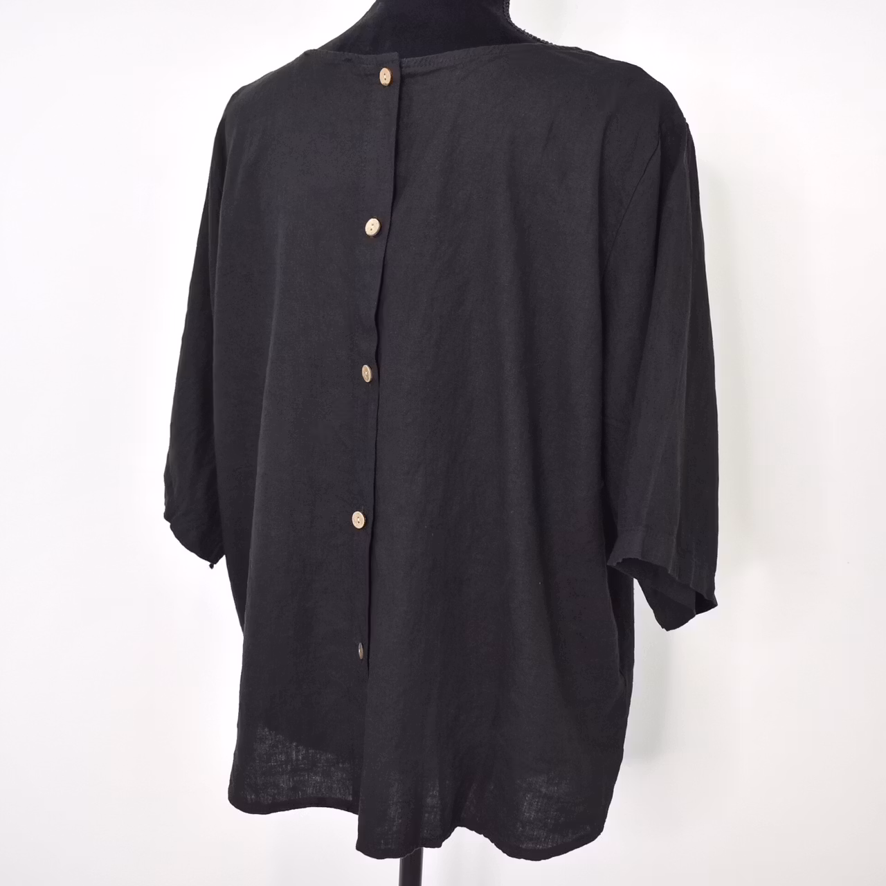 Det här är en härlig blus i linneviskos. Blusen har lös passform, kort ärm och rundad hals. Ryggen är delad och sitter ihop med naturfärgade knappar. Blusen är något längre baktill. Modellen har en bröstvidd på cirka 88cm, är 163cm lång och bär storlek S/M.