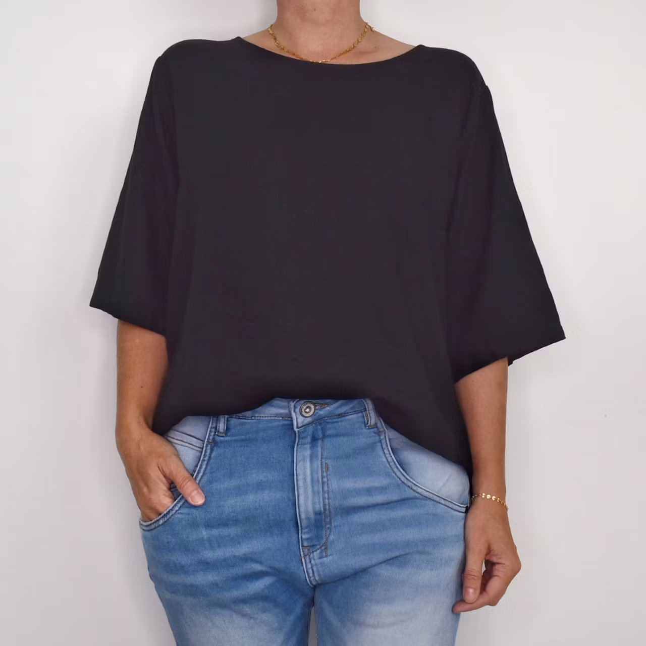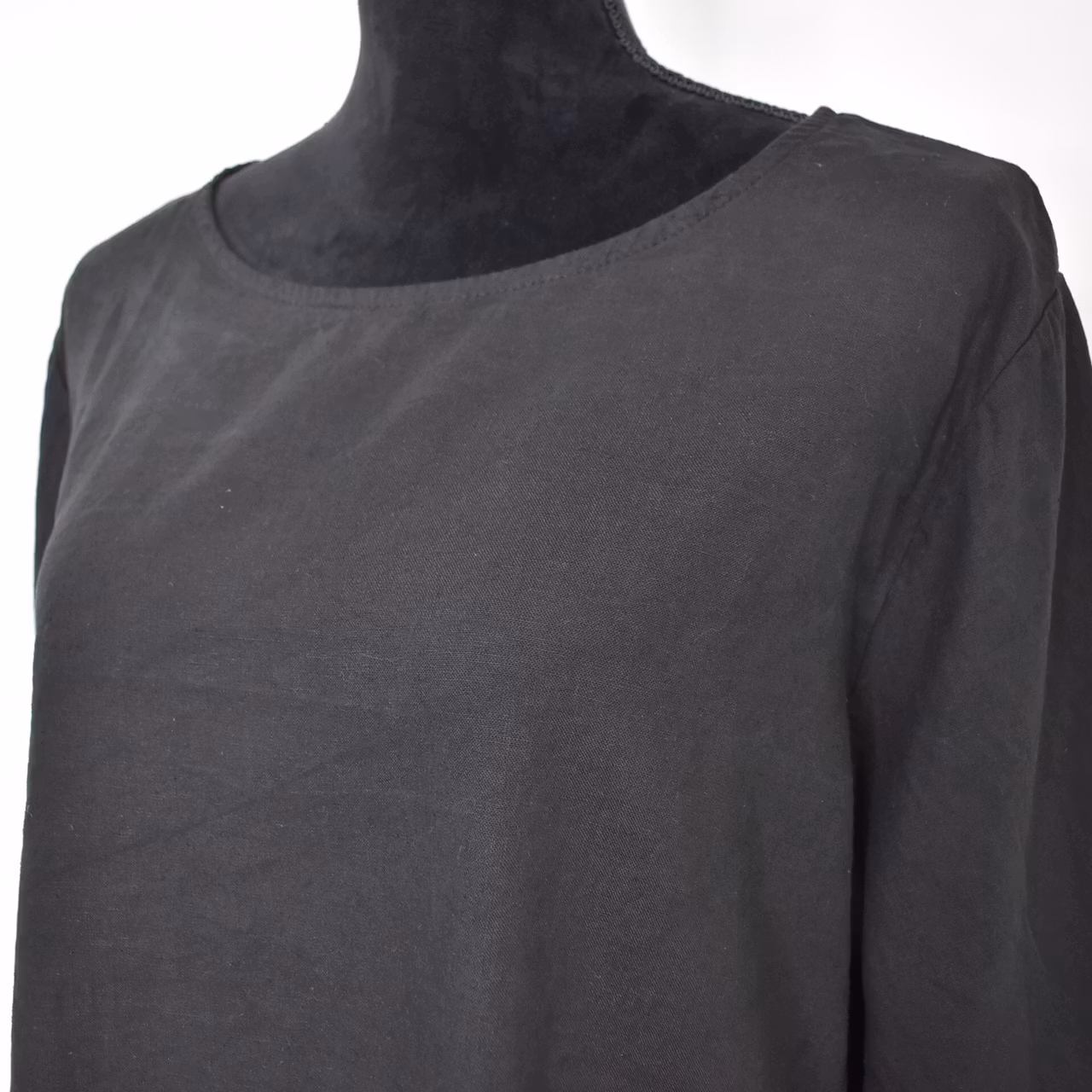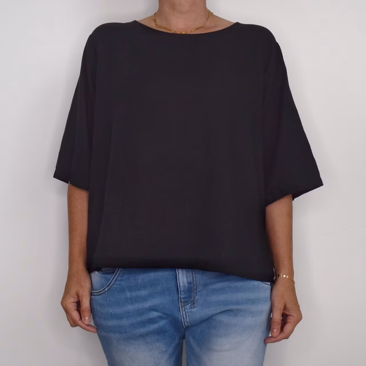 Det här är en härlig blus i linneviskos. Blusen har lös passform, kort ärm och rundad hals. Ryggen är delad och sitter ihop med naturfärgade knappar. Blusen är något längre baktill. Modellen har en bröstvidd på cirka 88cm, är 163cm lång och bär storlek S/M.