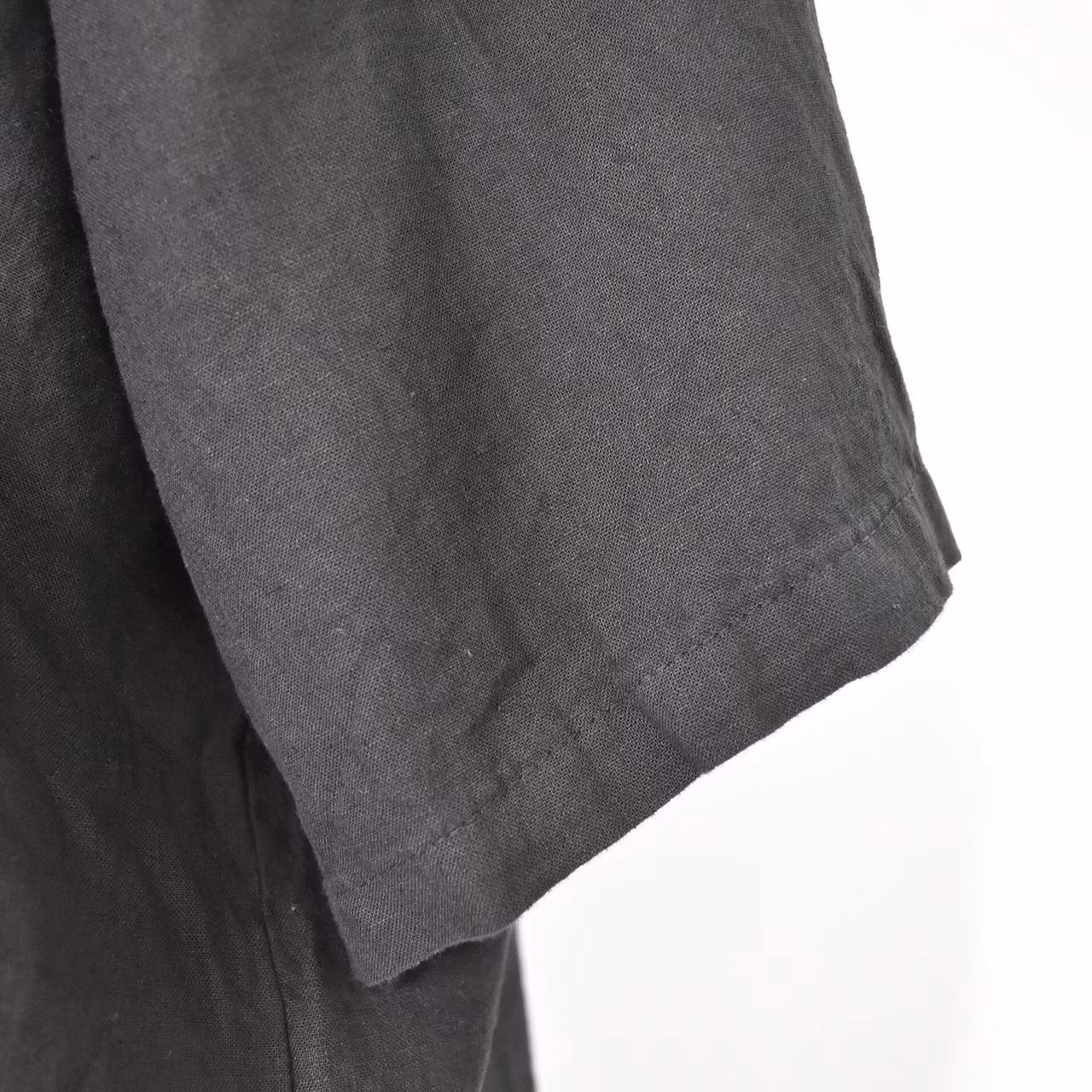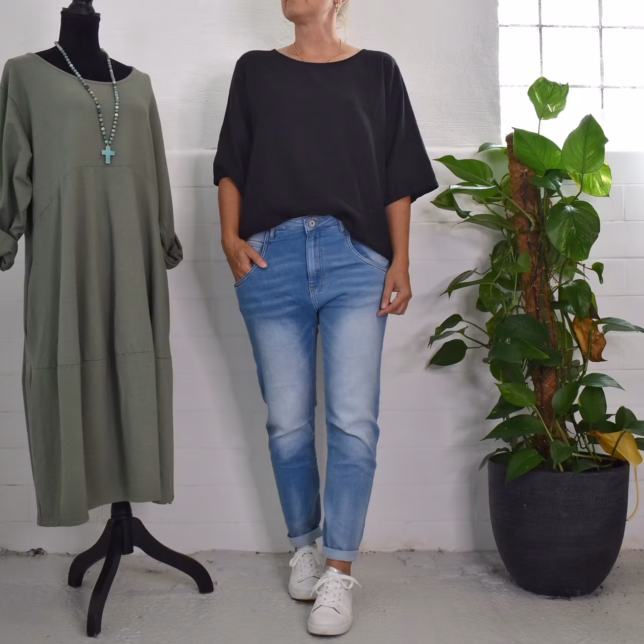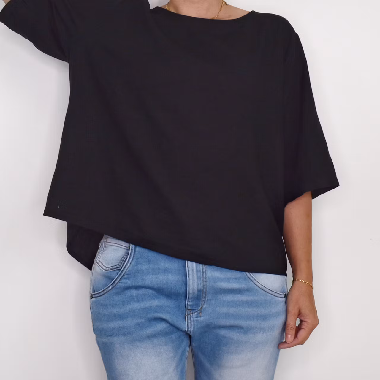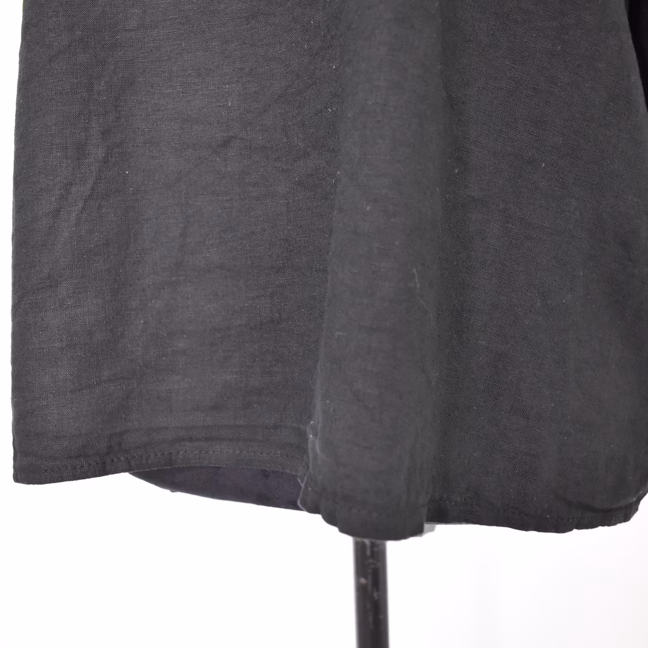 Det här är en härlig blus i linneviskos. Blusen har lös passform, kort ärm och rundad hals. Ryggen är delad och sitter ihop med naturfärgade knappar. Blusen är något längre baktill. Modellen har en bröstvidd på cirka 88cm, är 163cm lång och bär storlek S/M.