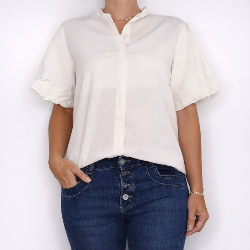 Det här är en läcker skjorta i tunn bomull. Skjortan har liten ståkrage samt en fodrad puffärm. Framtill är där dolda knappar. Materialet innehåller inte stretch och är något genomskinligt. Modellen har en bröstvidd på cirka 88cm, är 163cm lång och bär S/M.