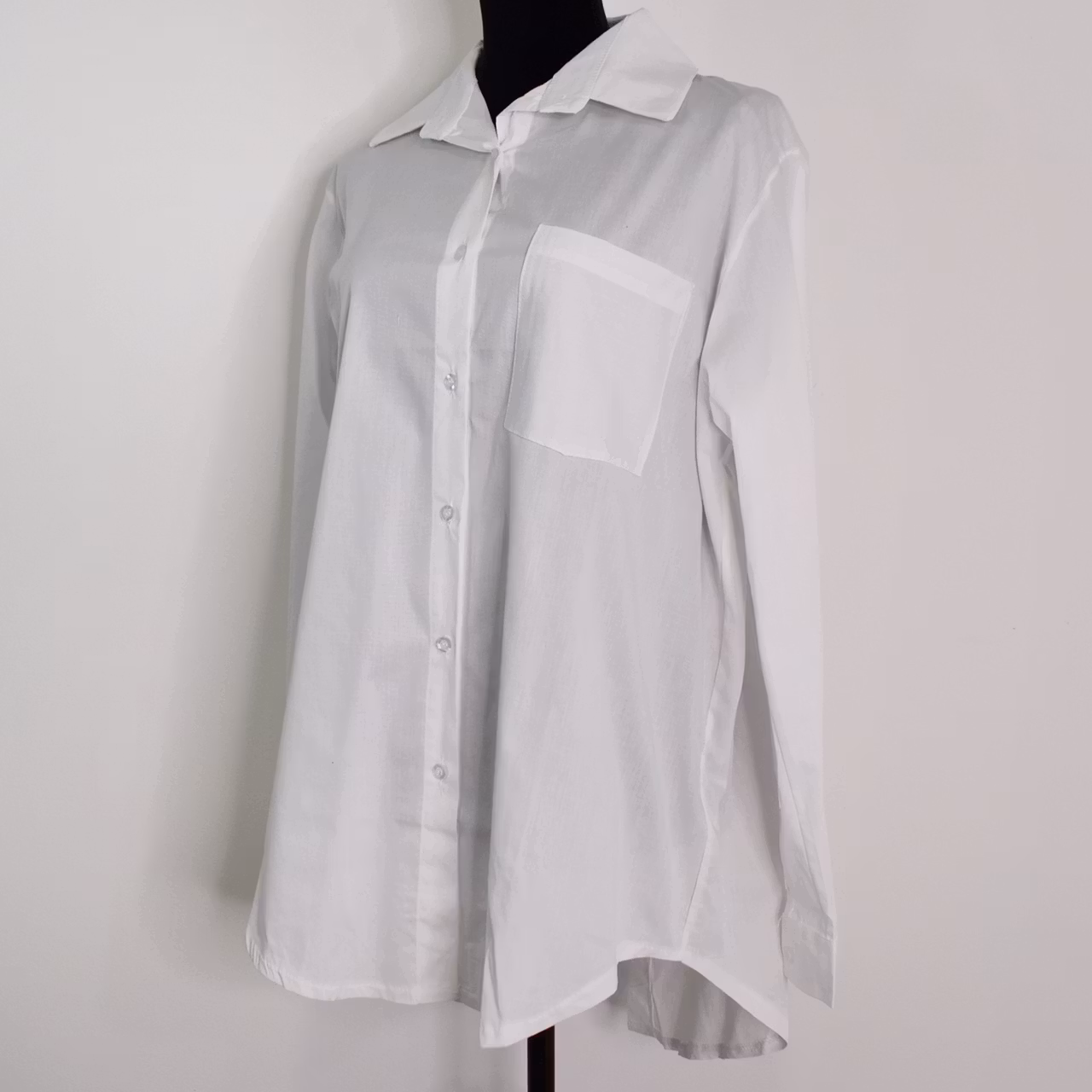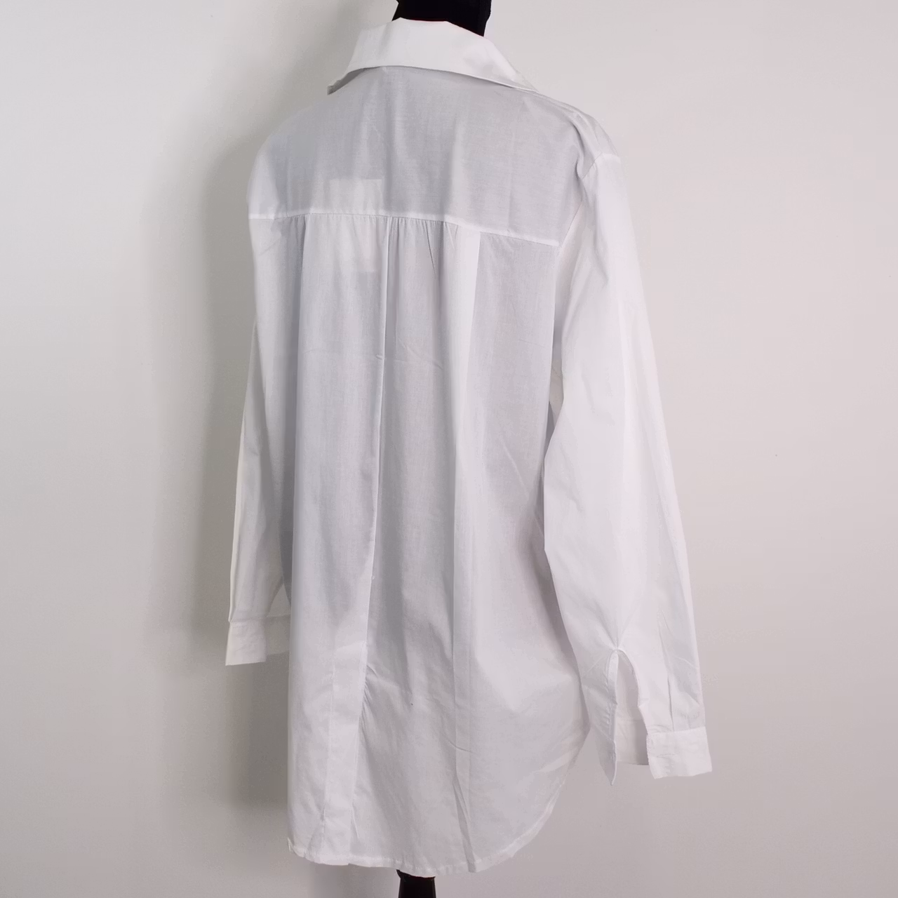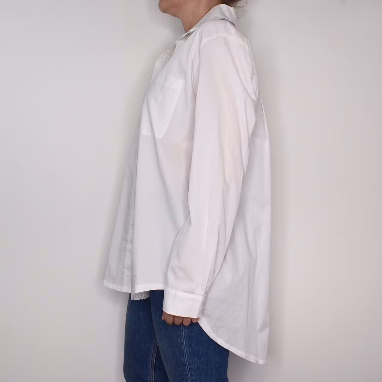Det här är en fantastisk storskjorta i härligt bomullstyg med lite stretch. Skjortan har knappar hela vägen fram och en i ärmslutet. Det finns en öppen ficka på vänster bröst och på ryggen är där två dekorativa vecka samt en slits längst ner. Skjortan är något längre baktill. Modellen har en bröstvidd på cirka 88cm och är 163cm lång.
