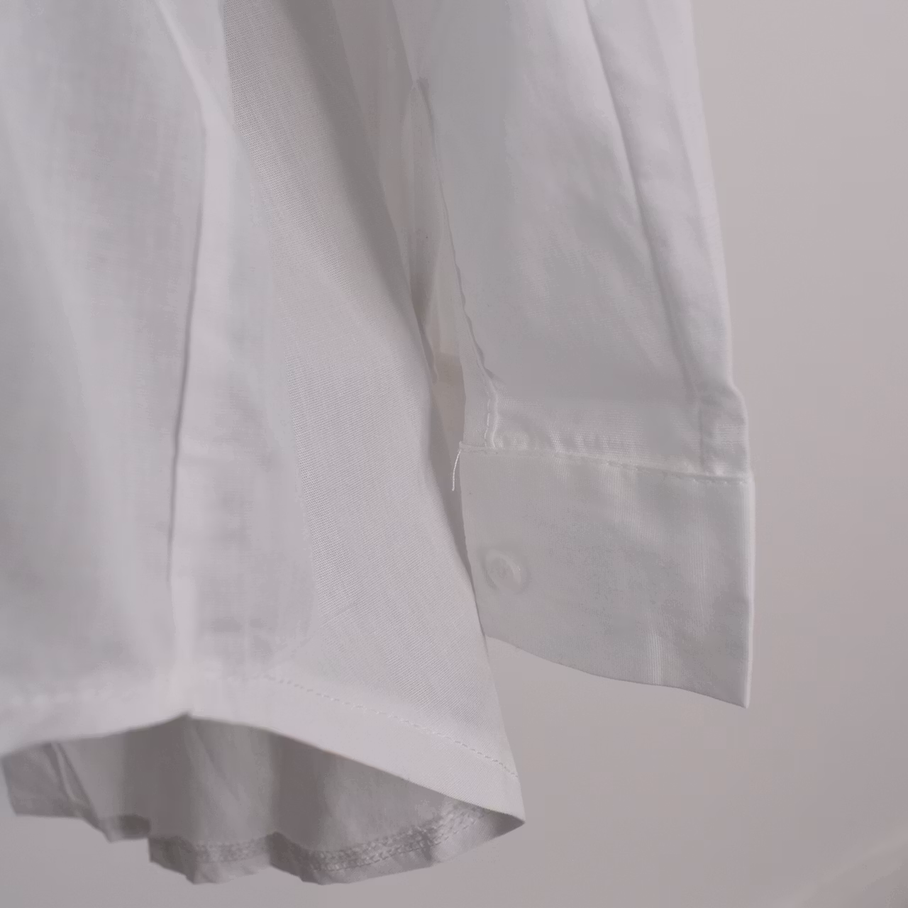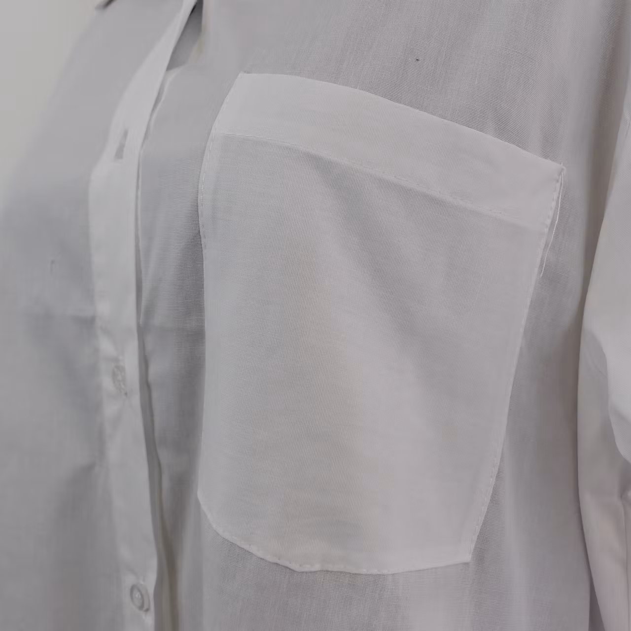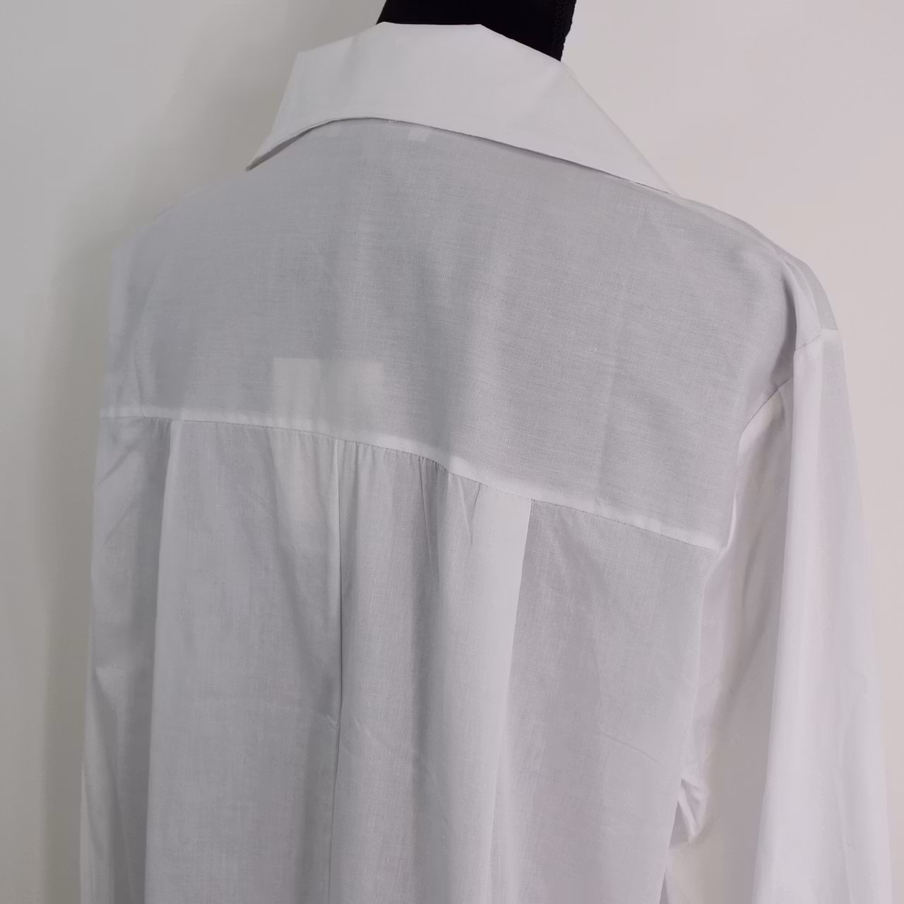 Det här är en fantastisk storskjorta i härligt bomullstyg med lite stretch. Skjortan har knappar hela vägen fram och en i ärmslutet. Det finns en öppen ficka på vänster bröst och på ryggen är där två dekorativa vecka samt en slits längst ner. Skjortan är något längre baktill. Modellen har en bröstvidd på cirka 88cm och är 163cm lång.