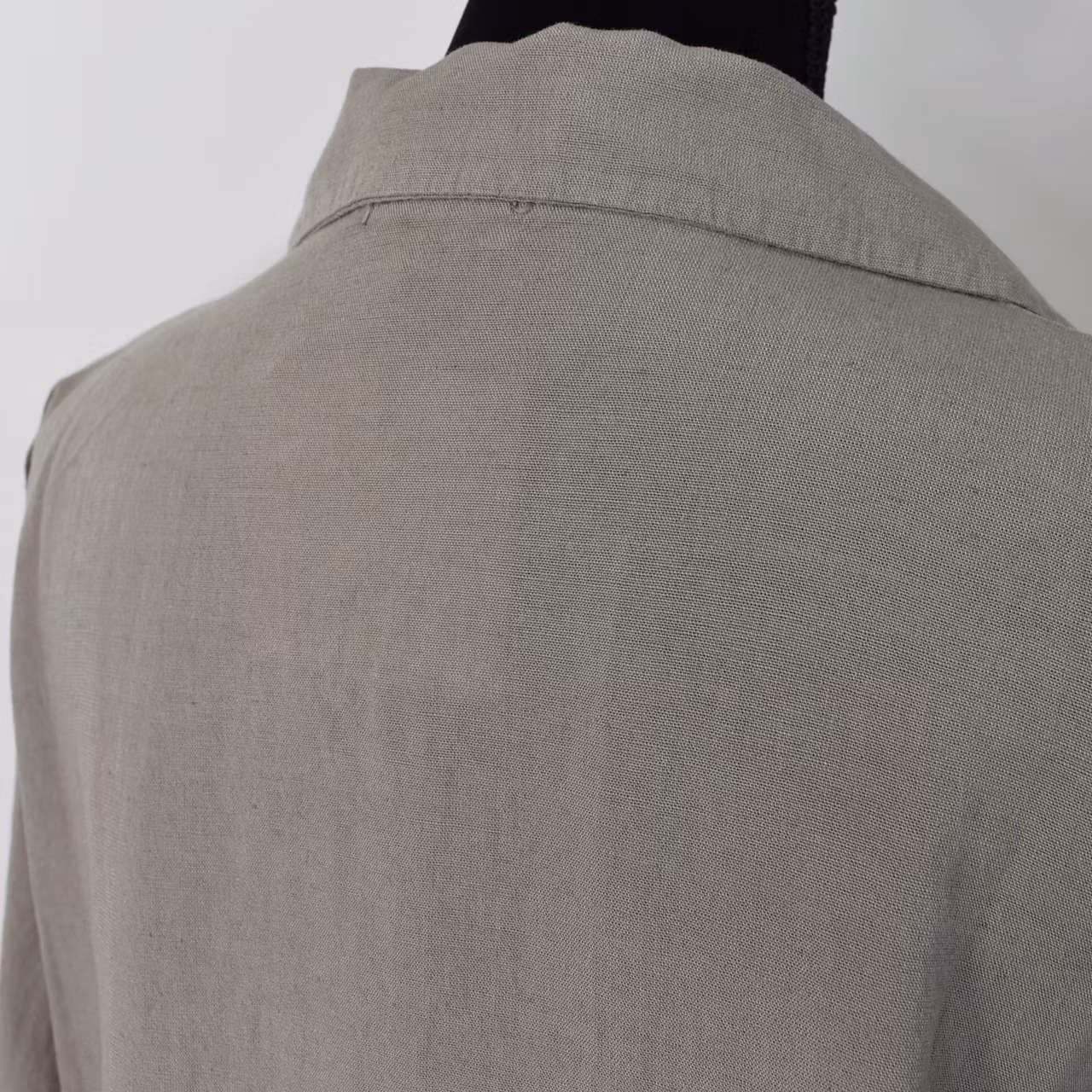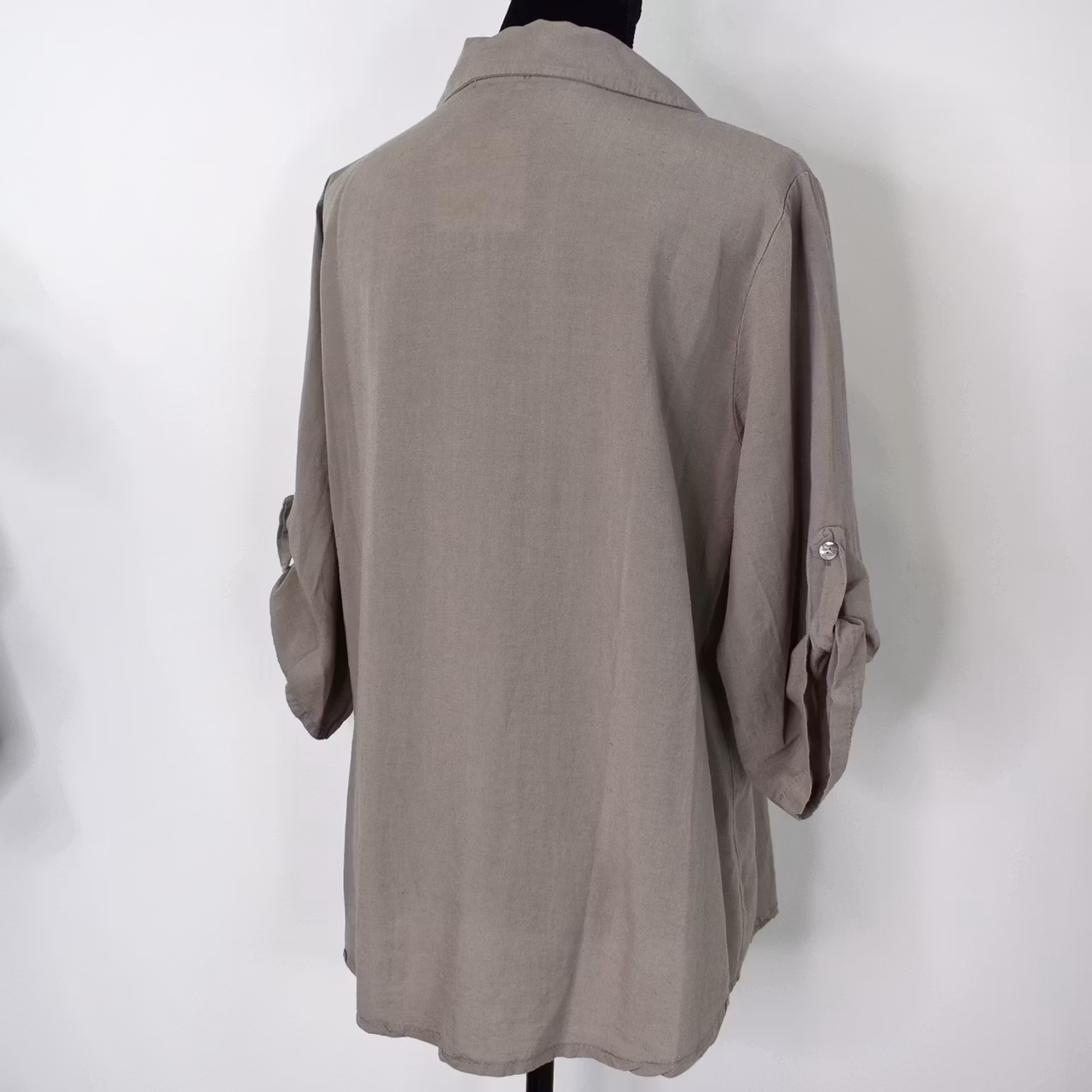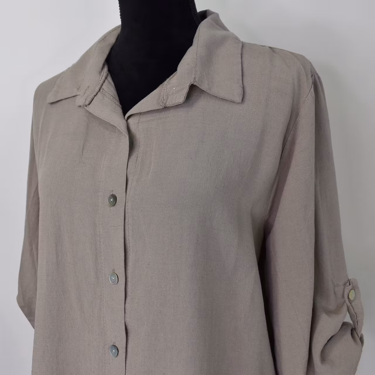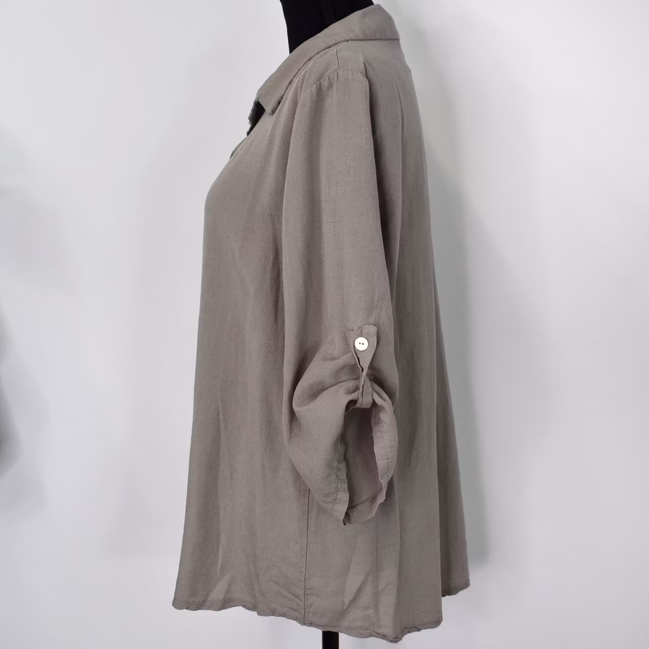 Detta är en enkel och användbar skjorta i skönt linnemix-material. Skjortan har knappar hela vägen fram och ärmen fäster man upp med knapp. Nertill är skjortan lite vidare än över bysten. Observera att materialet inte innehåller stretch och att tyget är tunt så det kan vara något genomskinligt. Då det är individuellt hur man upplever storlekar och vi alla är olika formade så rekommenderar vi att ta hjälp av måtten längre ner i beskrivningen för att se vilken storlek som kan passa. Passformen beror på varje persons unika form och proportioner. Modellen är storlek S, har en bröstvidd på cirka 88cm, är 163cm lång och bär storlek S/M.